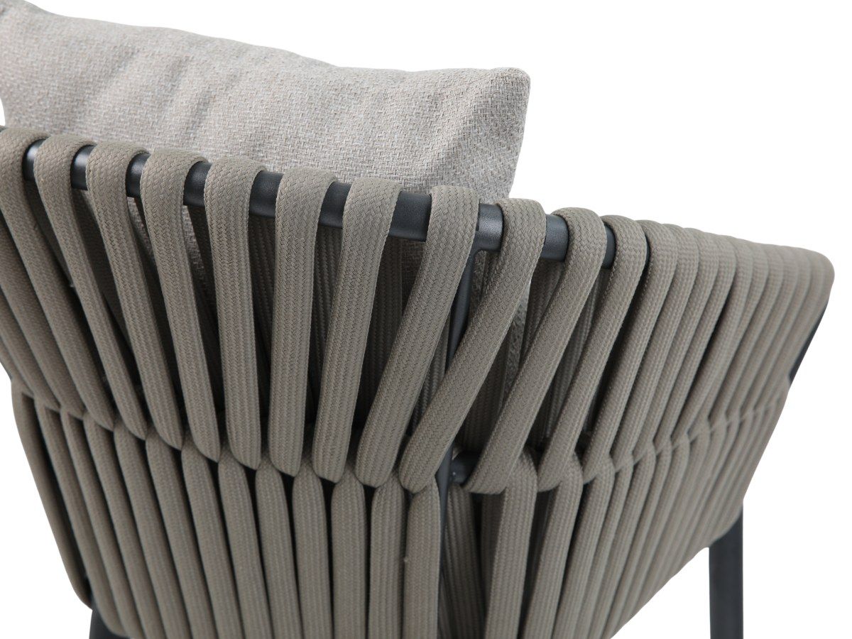 • Operadlo a boky: Výplet z hrubých textilných šnúr v modernej taupe (sivohnedej) farbe, ktorý dodáva stoličke štruktúru a hĺbku.