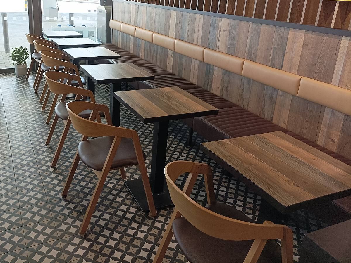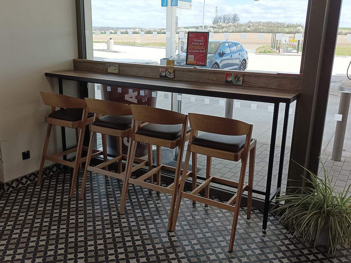 Vybavenie novej čerpacej stanice Shell krásnymi interiérovými stoličkami Marco, ktoré elegantne dopĺňajú barové stoličky Ghana bar v rovnakom prevedení dreva a poťahovej látky.