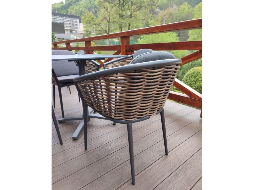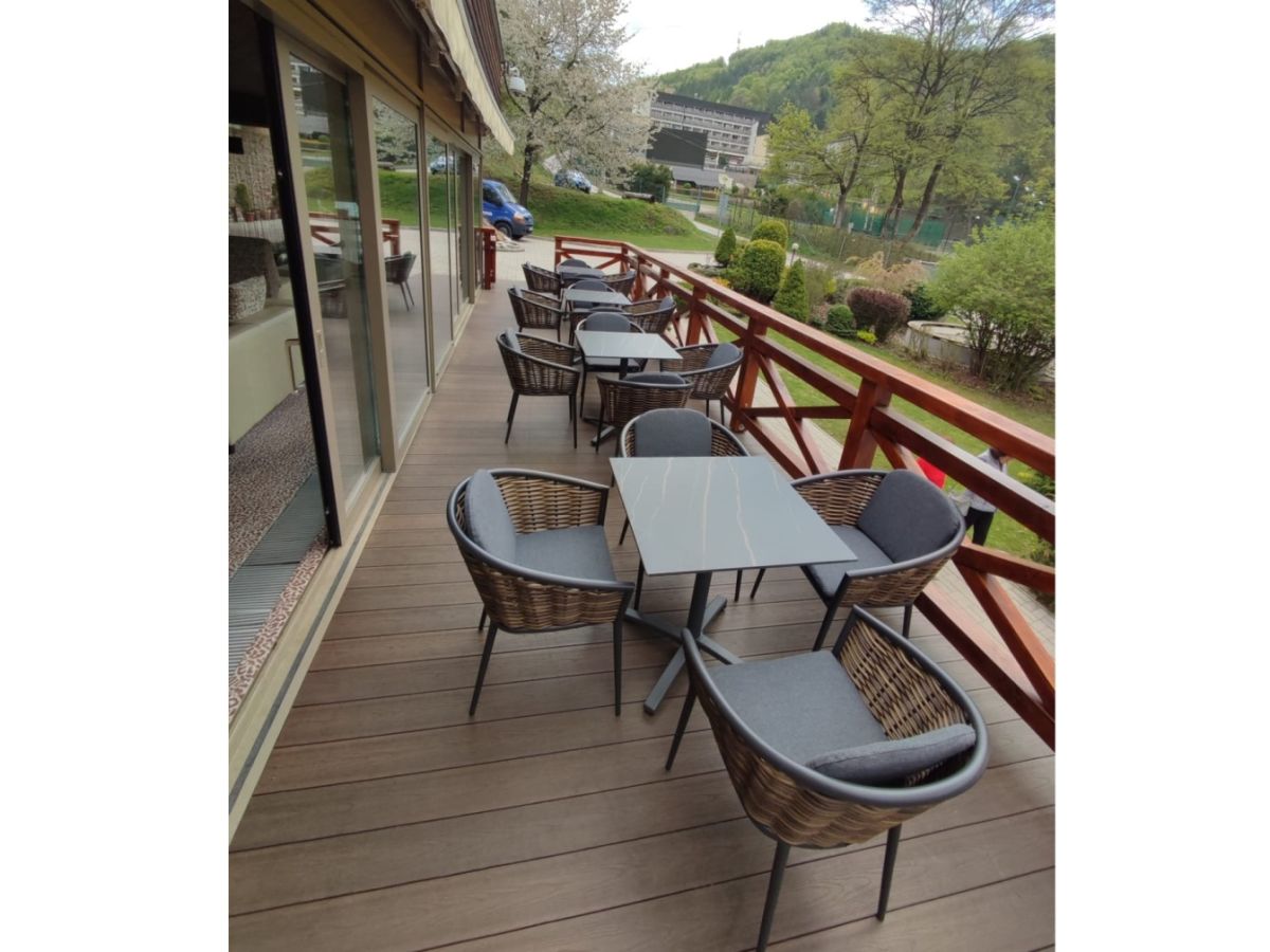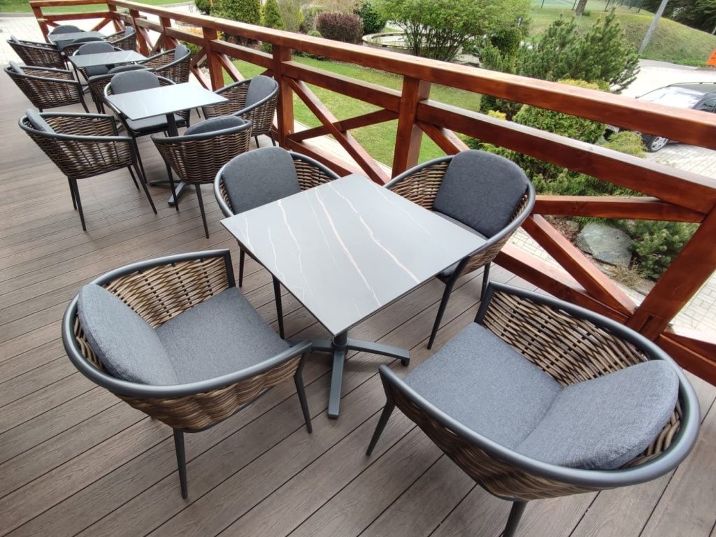 Zařízení letní terasy Hotelu Termál ve Vyhních, Slovensko. Dodávali jsme krásné a pohodlné křesla Bounty s praktickými stoly Thea se stolovou deskou z umělého kamene v imitaci mramoru.