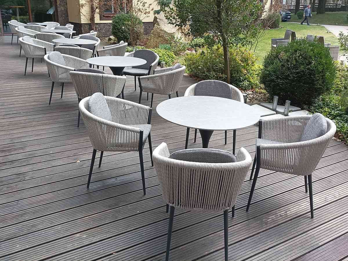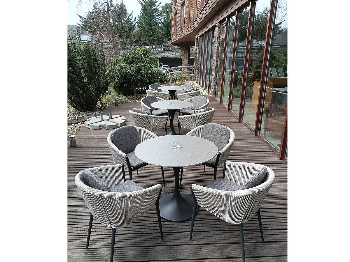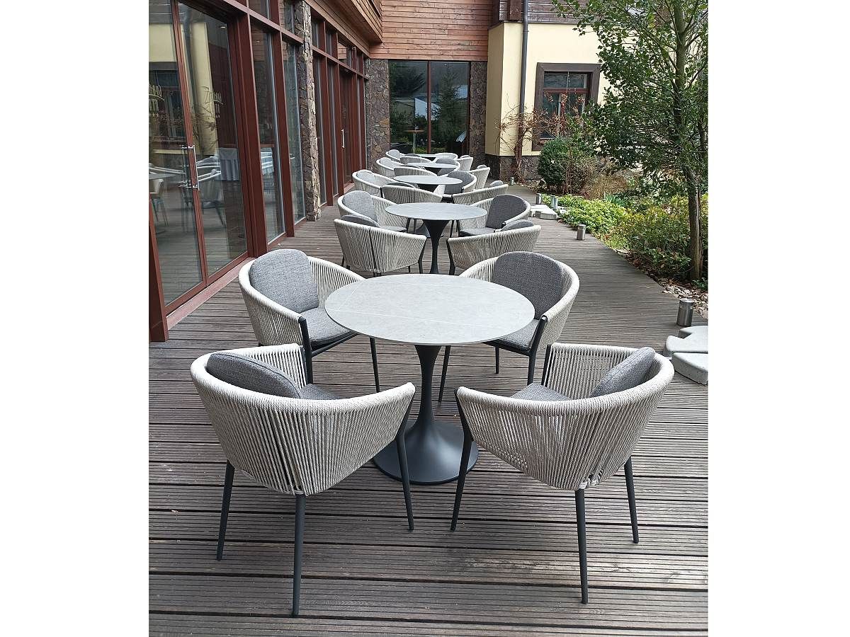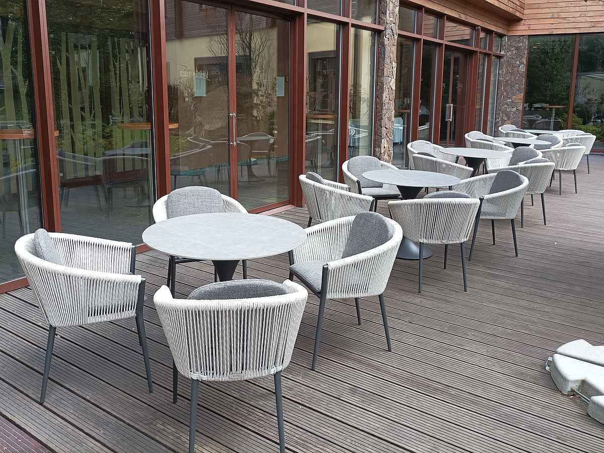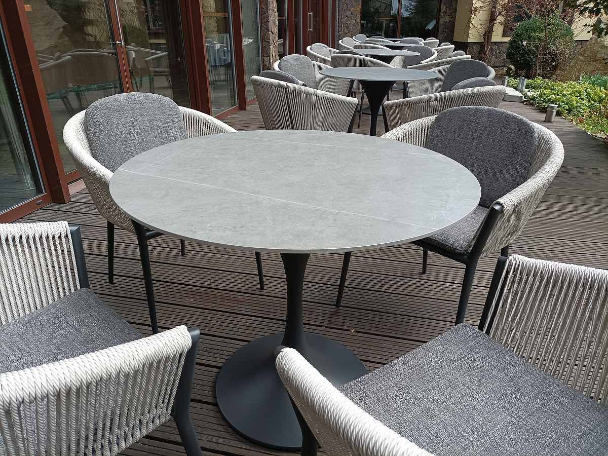 Vybavenie terasy ikonického hotela Zochova Chata. Klient si zvolil krásnu kombináciu kresiel Mango Hellgrau s elegantnými kruhovými stolmi Magnus.