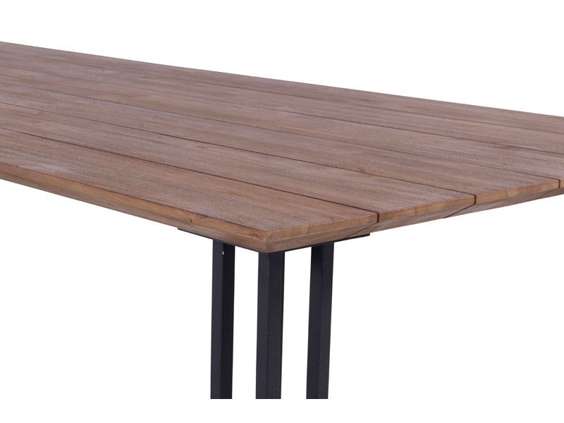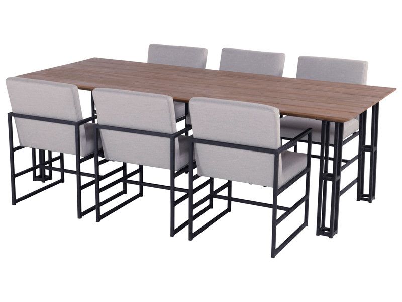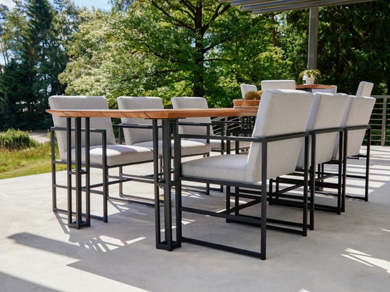 Nádherná zahradní jídelní sestava Amsterdam Vás zaujme svým minimalistickým industriálním stylem, který elegantně doplňuje krásný jídelní stůl s teakovou deskou. Konstrukce stolové soupravy je z hliníku a je doplněná o pohodlné podsedáky, které jsou z quick dry foam (rychleschnoucí materiál), takže mohou být venku celoročně a nevadí jim ani déšť. Ke stolové soupravě je vyrobená i sedací souprava Amsterdam, pokud byste chtěli mít jídelní a sedací soupravu ve stejném stylu.