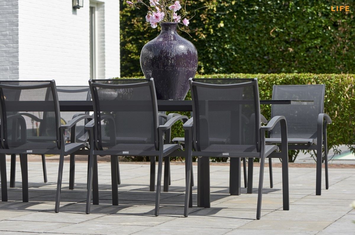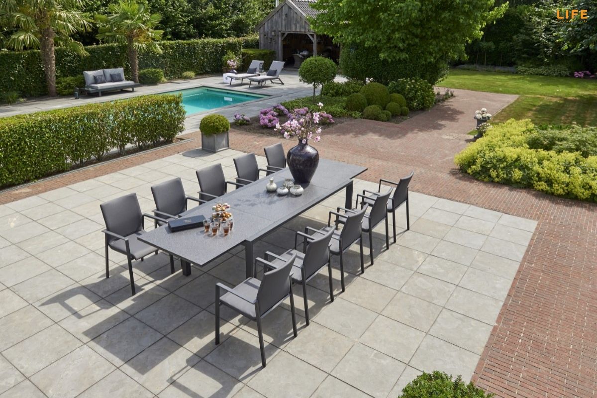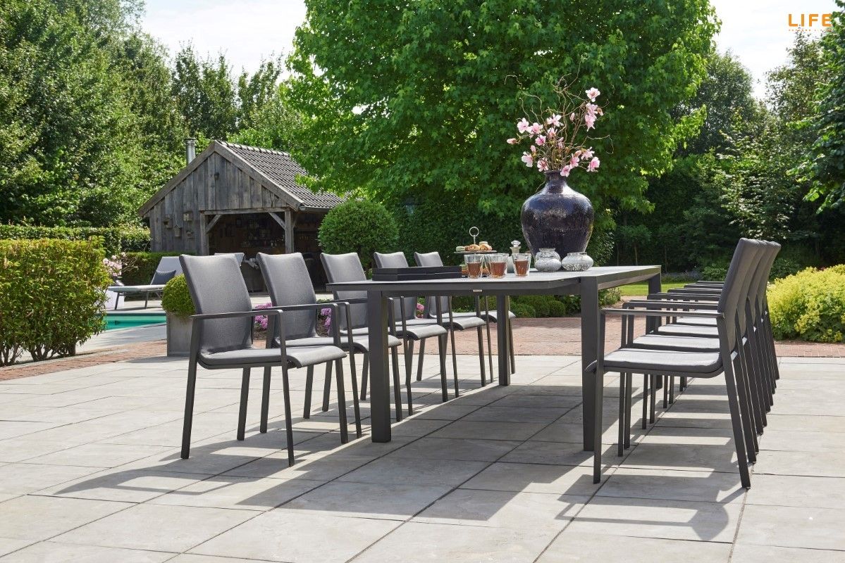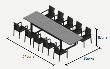 Zahradní jídelní sestava Anabel Sense s rozkládacím stolem je ideální pro velké rodinné oslavy nebo letní zahradní party s přáteli. V rozloženém stavu se ke stolu s délkou 340 cm pohodlně usadí až 12 osob, pokud je složený, tak 8 osob. Stůl má hliníkový rám a stolová deska je z black spraystone (tvrzené sklo s keramickou vrstvou). Díky těmto materiálům je stůl během celého roku bezúdržbový. Pohodlná židle Sense má hliníkový rám a její tělo má výplň z All Weather Cushions, takže se nemusíte bát ani deště. Prostorovou dispozici soupravy můžete vidět na přiloženém obrázku.