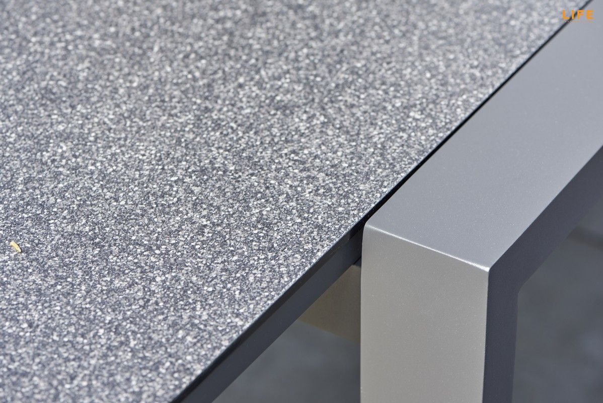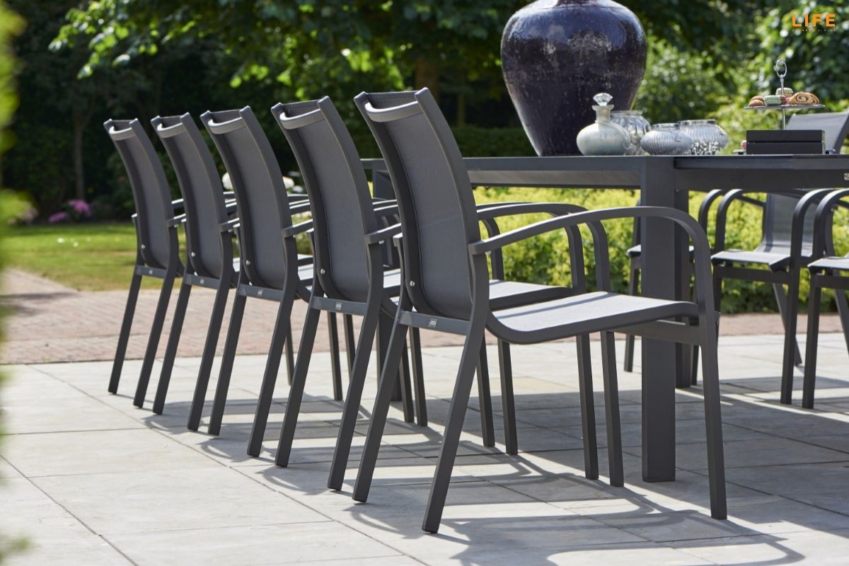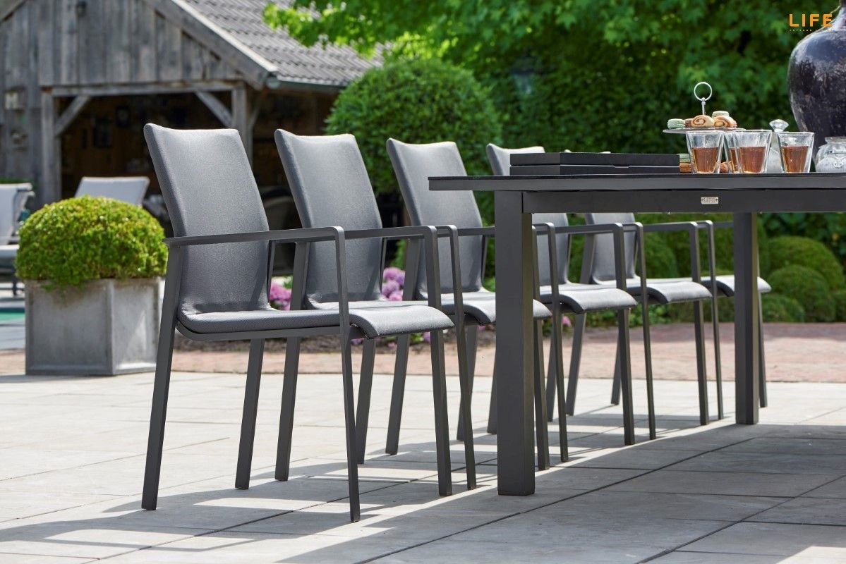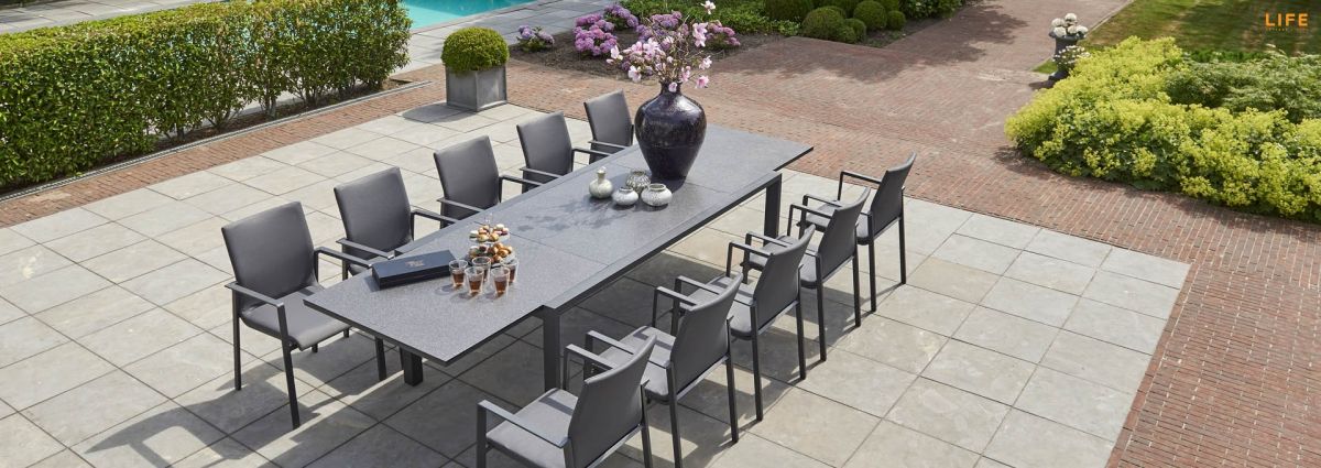 Zahradní jídelní sestava Anabel Sense s rozkládacím stolem je ideální pro velké rodinné oslavy nebo letní zahradní party s přáteli. V rozloženém stavu se ke stolu s délkou 340 cm pohodlně usadí až 12 osob, pokud je složený, tak 8 osob. Stůl má hliníkový rám a stolová deska je z black spraystone (tvrzené sklo s keramickou vrstvou). Díky těmto materiálům je stůl během celého roku bezúdržbový. Pohodlná židle Sense má hliníkový rám a její tělo má výplň z All Weather Cushions, takže se nemusíte bát ani deště. Prostorovou dispozici soupravy můžete vidět na přiloženém obrázku.