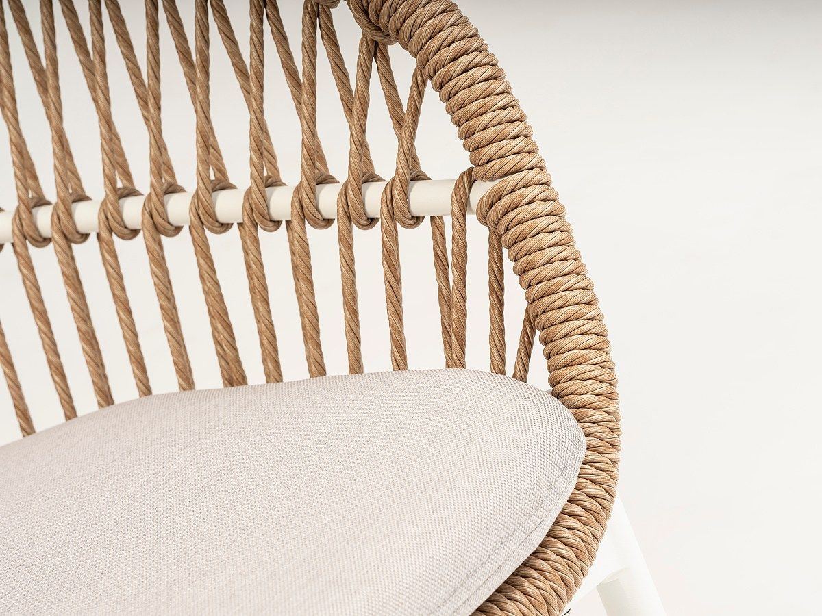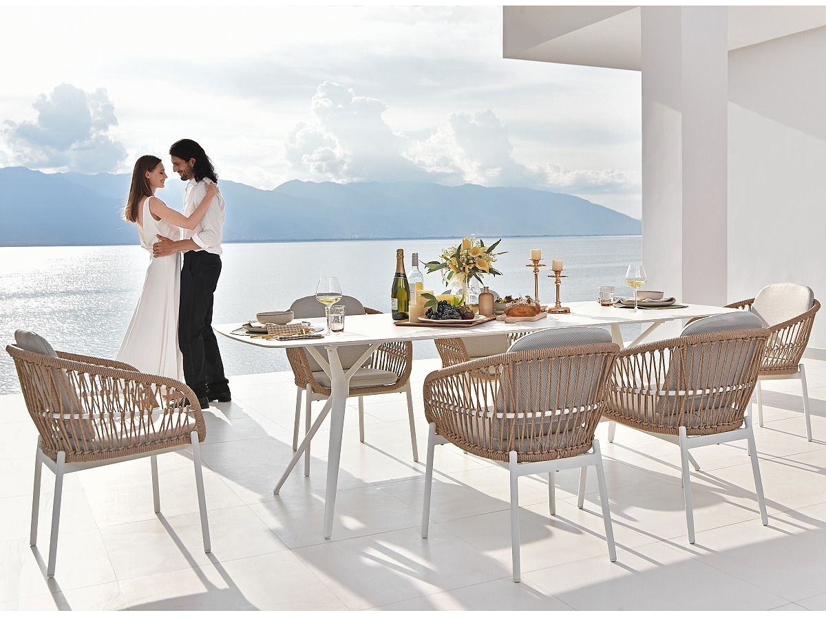 Okouzlující stolová sestava Bari White bude dokonalým místem k letnímu posezení s přáteli nebo rodinou. Stůl má hliníkový rám v bílé barvě, stolová deska je ze speciálního materiálu Sinterstone (pod vysokým tlakem ztlačený kamenný granulát), který imituje bílý mramor. Židle má hliníkový rám a je ovinutá PVC lanem v jemném přírodním designu. Podsedák i opěrkový polštář jsou odolné vůči povětrnostním vlivům.
