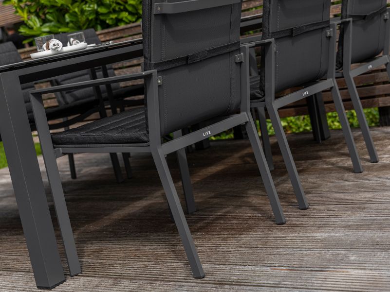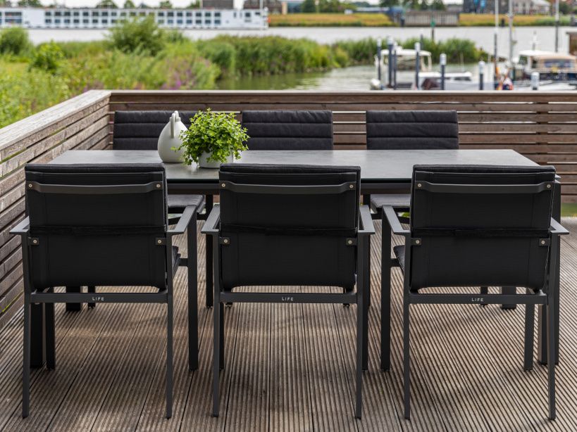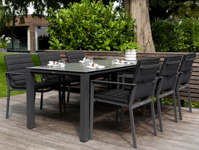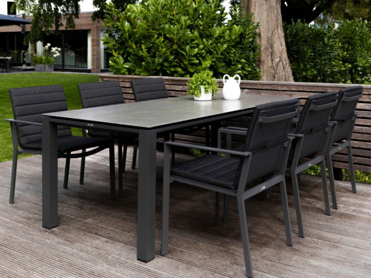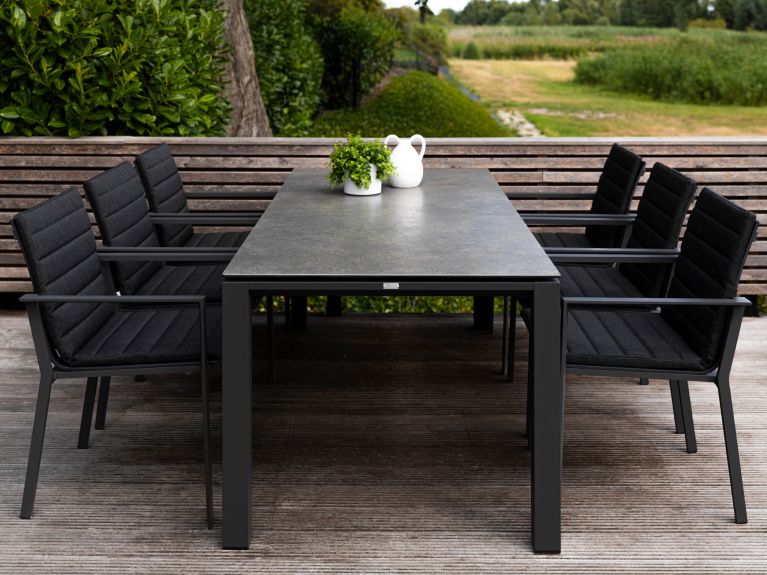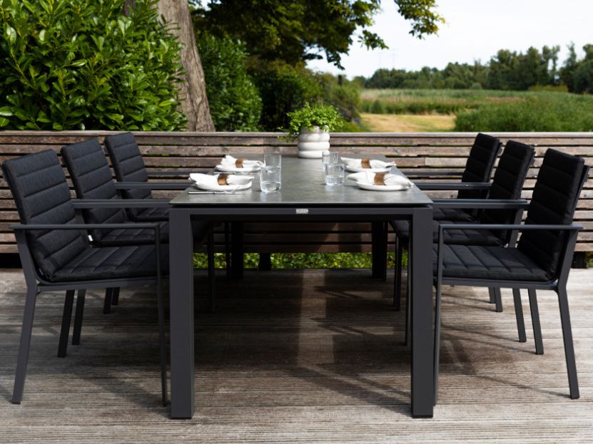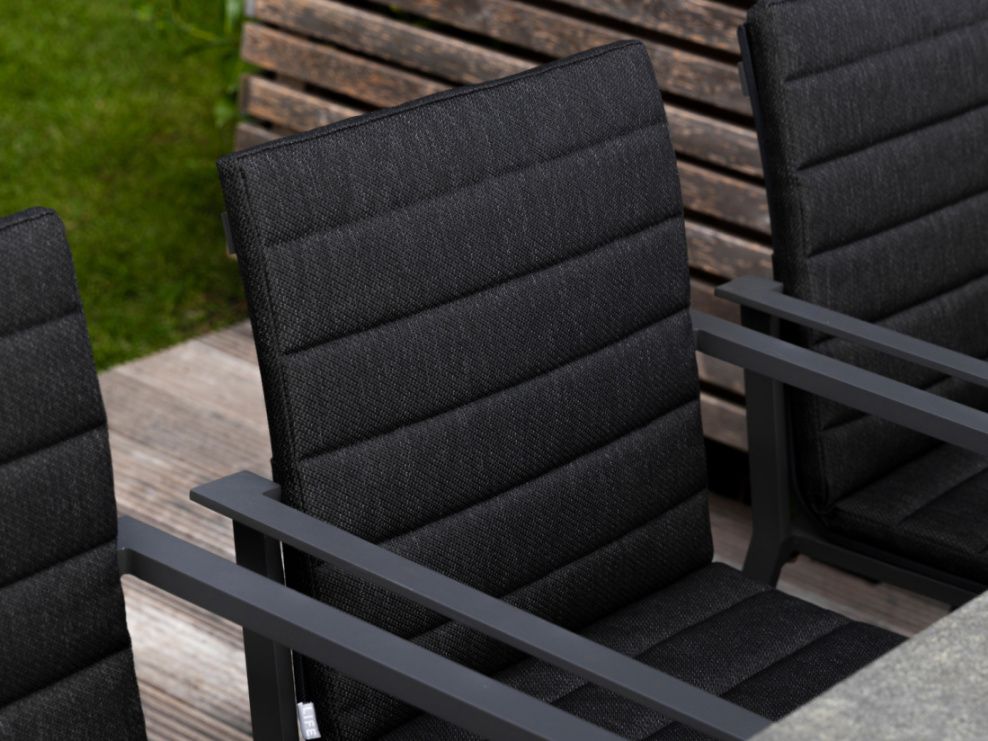 Krásný a praktický typ zahradní stolové sestavy, který Vás upoutá na první pohled. Stůl Concept Ceramic má hliníkový rám a stolová deska je z Ceramic Concrete look (keramická stolová deska), takže ja bezúdržbový. Židle má hliníkovou konstrukci a je potažená rychleschnoucím textilenem. Pro větší pohodlí je židle doplněna o elegantní podsedák, který je po celé sedací a opěrkové části. Je dostupný ve třech barevných variantách. Podsedák je z outdoorovej látky ALL WEATHER nebo SOLTEX. Tyto materiály splňují všechna kritéria k tomu, aby židle s podsedáky mohly být venku celoročně.