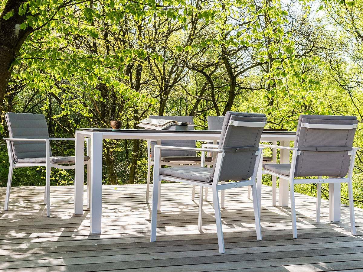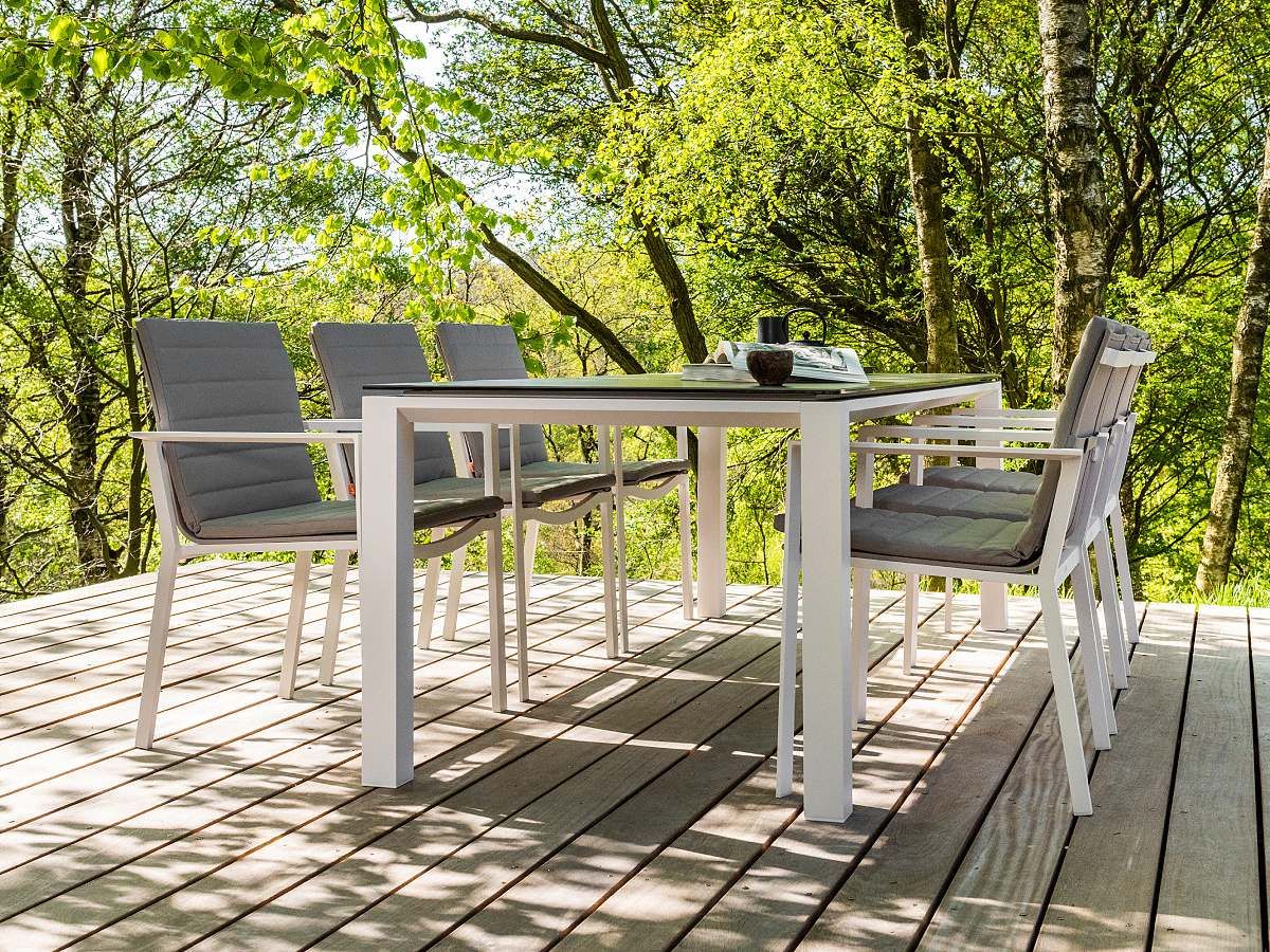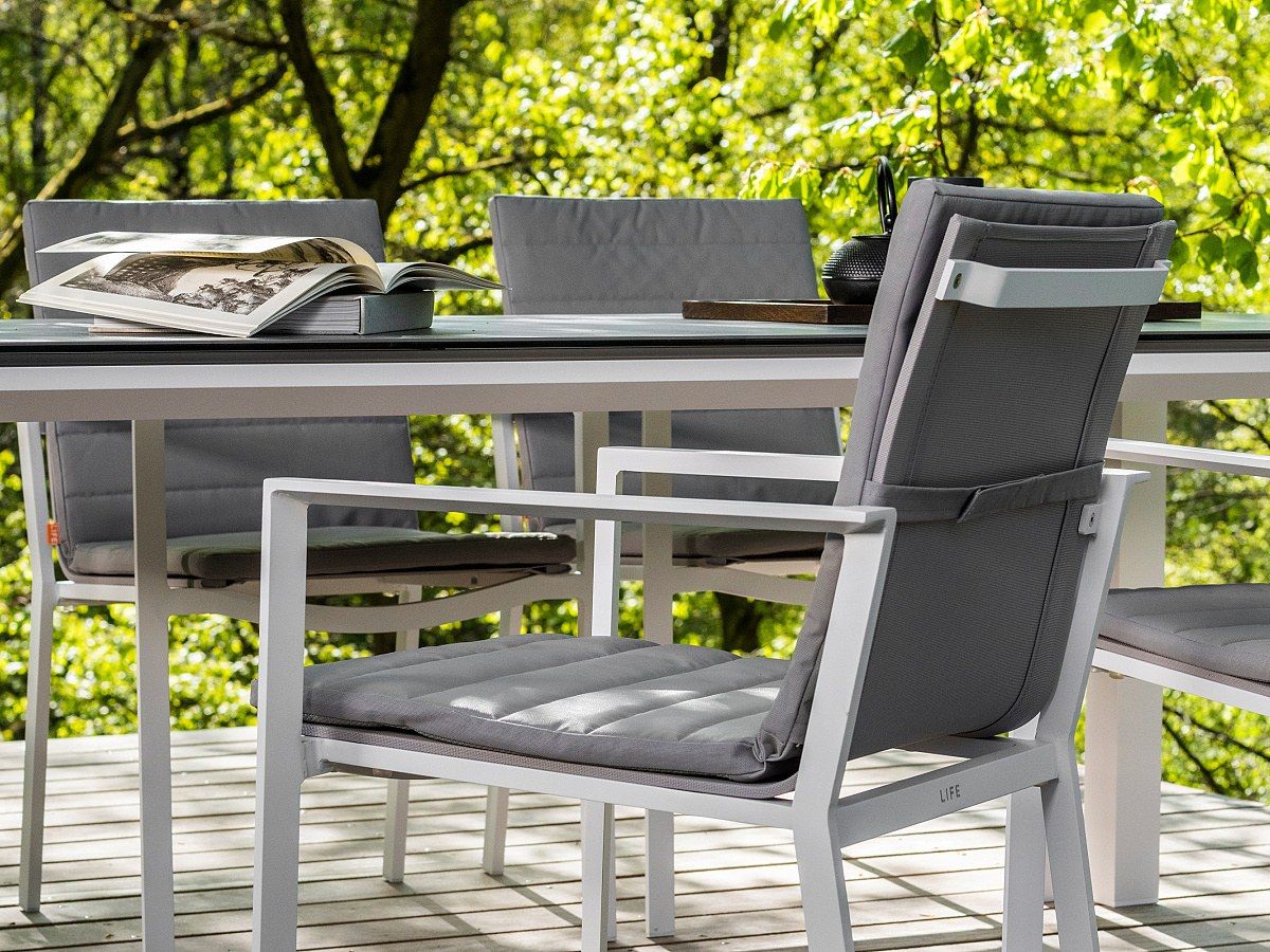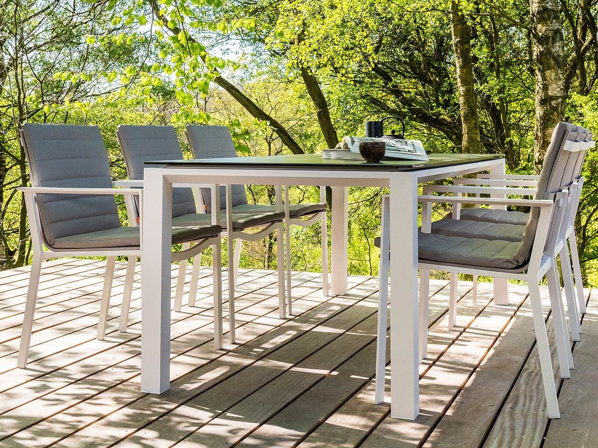 Krásný a praktický typ zahradní stolové sestavy, který Vás upoutá na první pohled. Stůl Concept Ceramic má hliníkový rám a stolová deska je z Ceramic Concrete look (keramická stolová deska), takže ja bezúdržbový. Židle má hliníkovou konstrukci a je potažená rychleschnoucím textilenem. Pro větší pohodlí je židle doplněna o elegantní podsedák, který je po celé sedací a opěrkové části. Je dostupný ve třech barevných variantách. Podsedák je z outdoorovej látky ALL WEATHER nebo SOLTEX. Tyto materiály splňují všechna kritéria k tomu, aby židle s podsedáky mohly být venku celoročně.