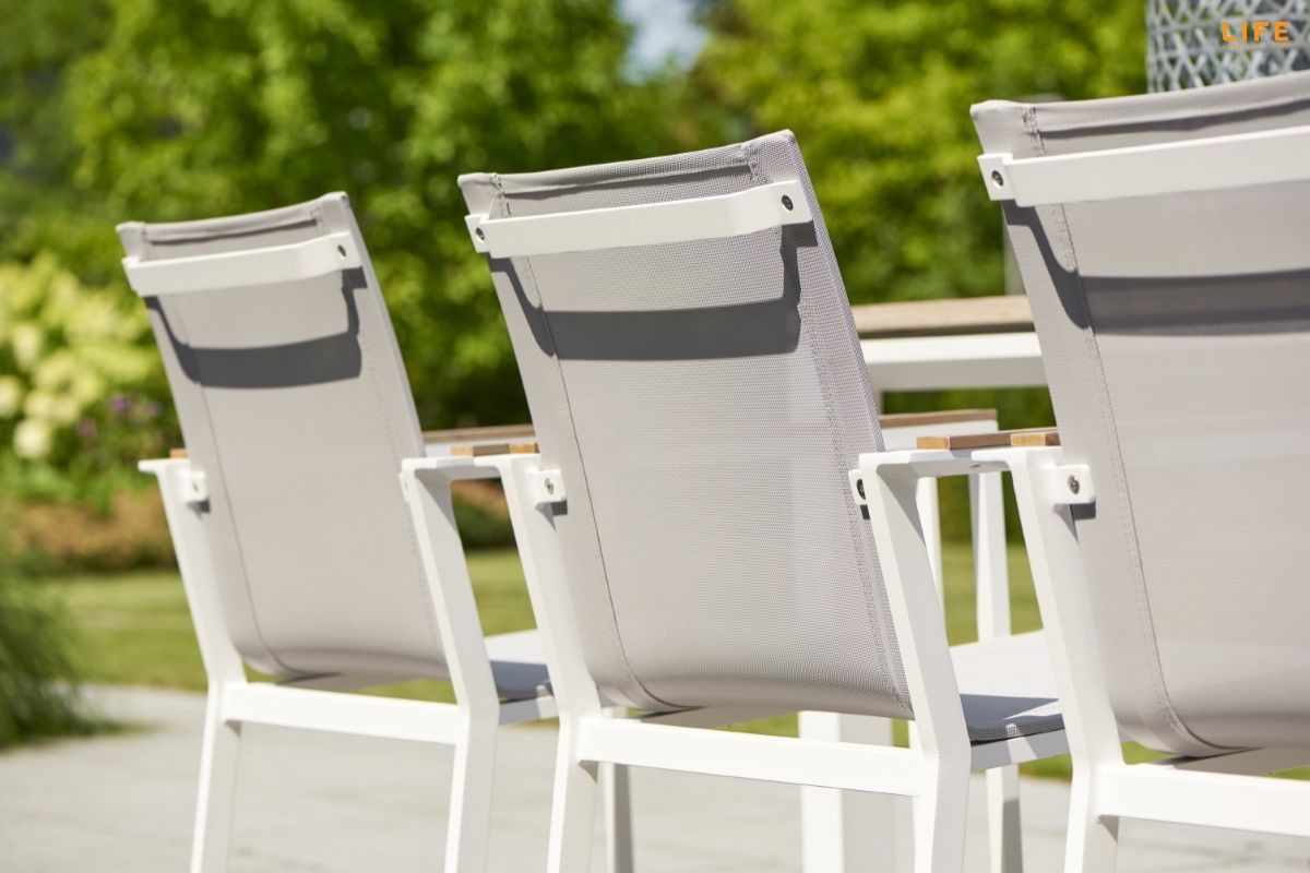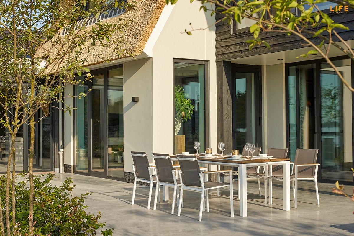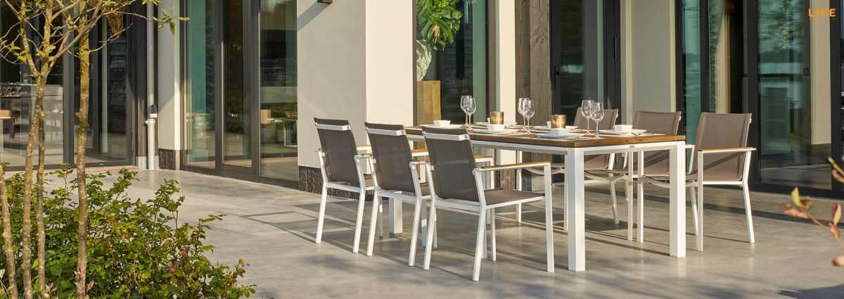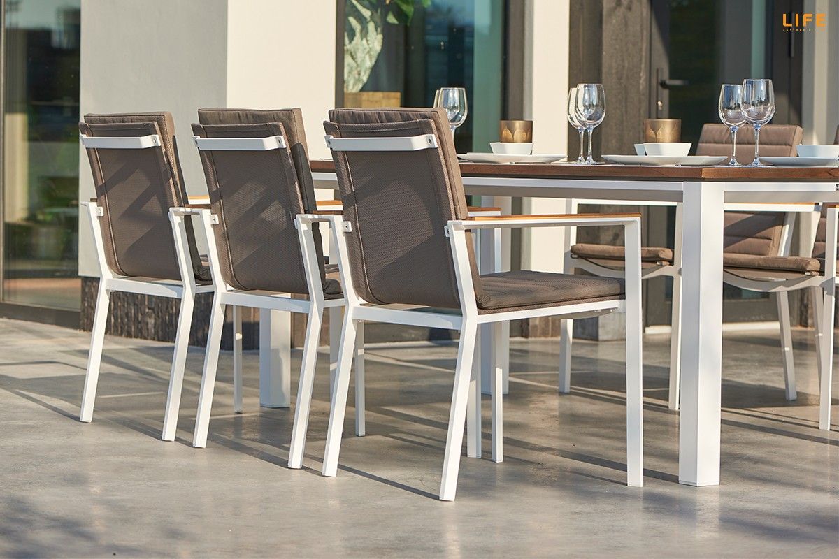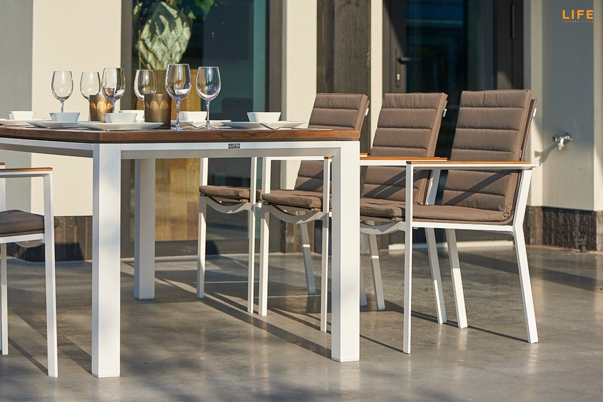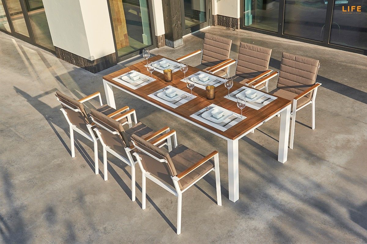 Dokonalá zahradní jídelní sestava Concept Teak Primavera zkrášlí i Vašu terasu. Stůl Concept má konstrukci z pevného hliníkového rámu. Stolová deska je z teakového dřeva nejvyšší kvality z certifikovaných indonézských plantáží. U stolu s délkou 210 cm si pohodlně vychutnáte i nedělní oběd v rodinném kruhu na Vaší terase či v altánku. Židle má hliníkovou konstrukci, sedací část je z rychleschnoucího textilenu, který je doplněný o pohodlný polstr vhodný do jakéhokoli počasí. Polstr pokrývá nejen sedací, ale i zádovou čásť. Opěrky na ruce jsou na židli z teakového dřeva a dodávají tak pocit tepla, když si o ně opřete ruce i v chladnějších podzimních dnech. Prostorovou dispozici soupravy můžete vidět na přiloženém obrázku.