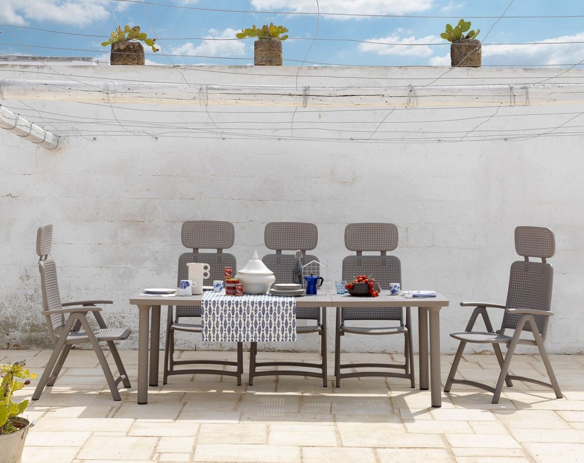 Odolná a krásná zahradní jídelní sestava Libeccio Acquamarina v krásné šedohnědé barvě. Konstrukce stolu je vyrobená z hliníku a stolová deska je z tvrzeného plastu DurelTOP s UV aditivy. Stůl je rozkládací, takže ho jednoduše zvětšíte ze 160 cm na 220 cm. Nohy mají okrouhlý tvar. Křeslo je polohovatelné s opěrkou na ruce a záhlavníkem. Stůl i křesla jsou dostupné ve 4 barevných variantách. Křeslo je vyrobené z tvrzeného plastu zpevněného skelným vláknem, UV stabilní, lehce omyvatelné a může být venku celoročně.