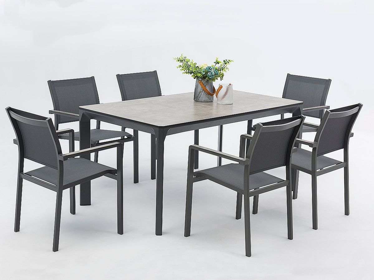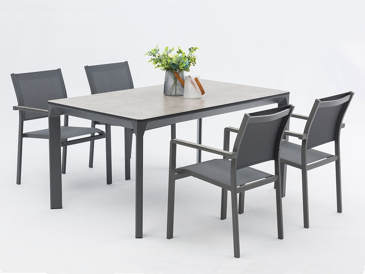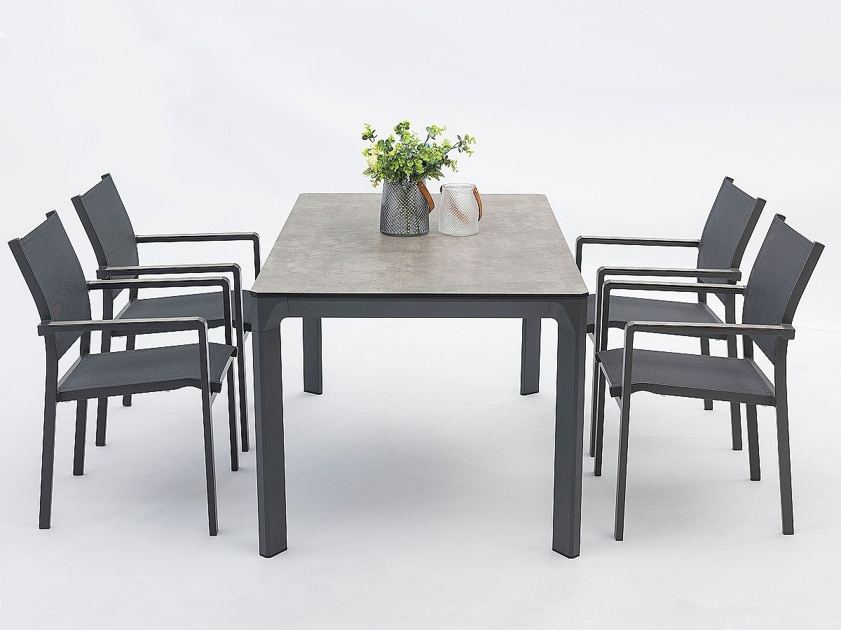 Elegantní a praktický typ zahradní stolové sestavy, která Vám vydrží roky. Stůl Lilly má hliníkový rám v antracitové barvě a stolová deska je z materiálu HPL s šířkou 12mm v šedé kamenné barvě. Židle má hliníkovou konstrukci a je potažená rychloschnoucím textilenem. Opěrky židle jsou z polywoodu v imitaci dřeva. Tento typ stolové sestavy můžete mít venku celoročně bez nutnosti jejího uklízení či přikrývání ochrannou plachtou.