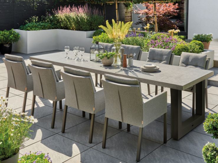 Luxusní typ zahradní stolové sestavy, která Vás upoutá na první pohled. Stůl Stelvio má hliníkový rám a stolová deska je z Ceramic Concrete look (keramická stolová deska). S délkou stolu 300 cm k němu pohodlně usadíte velkou skupinu přátel během zahradní party, a každý bude mít dostatečné pohodlí. Židle má hliníkovou konstrukci a je potažená speciální outdoorovou látkou SOLTEX, která je jemná na dotyk, ale splňuje všechna kritéria k tomu, aby mohla být venku celoročně.