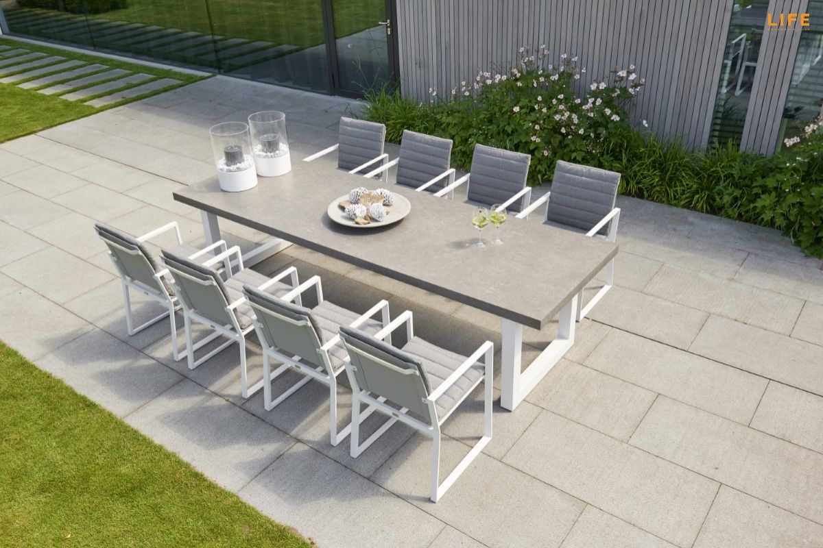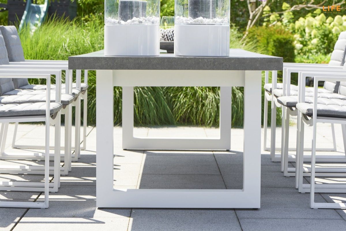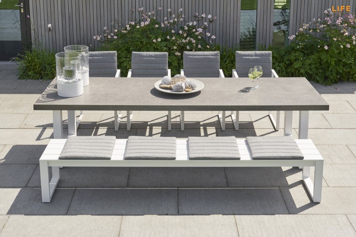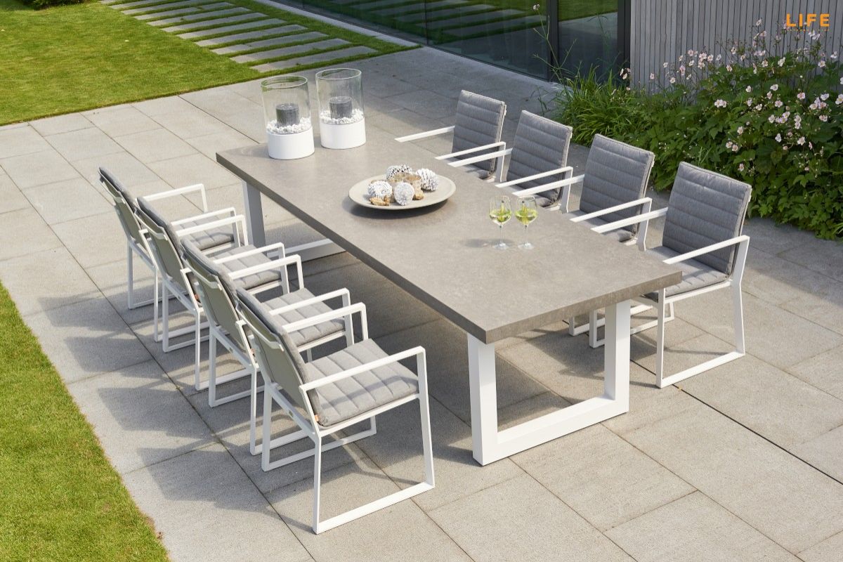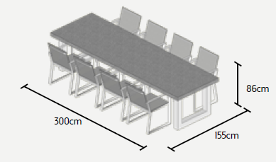 Krásny typ zahradní jídelní sestavy, která Vás upoutá na první pohled. Stůl Stelvio má hliníkový rám a stolová deska je z Ceramic Concrete look (keramická stolová deska, která vypadá jako betonová). U stolu dlouhého 300 cm pohodlně usadíte velkou skupinu přátel na grilovačku nebo oslavu narozenin, a každý bude mít dostatečné pohodlií. Židle má hliníkovou konstrukci, sedací část je z rychleschnoucího textilenu, která je doplněná o pohodlný podsedák. Ten pokrývá nejen zmíněnou sedací část, ale i zádovou část. Podsedák je z All Weather Cushions a je odolný vůči všem typům počasí. Ke stolu je možné použít také lavice Primavera. Prostorovou dispozici soupravy můžete vidět na přiloženém obrázku.