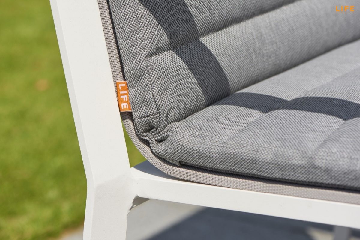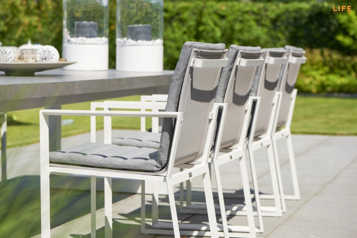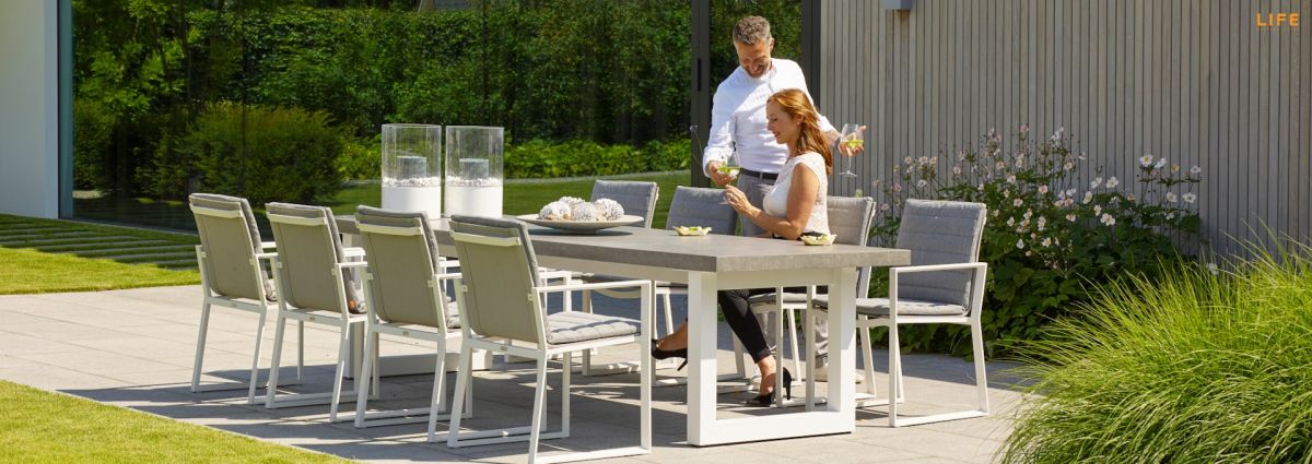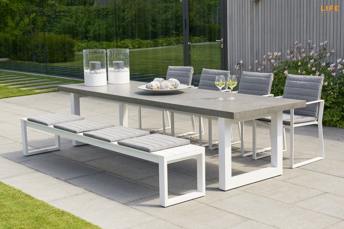 Krásny typ zahradní jídelní sestavy, která Vás upoutá na první pohled. Stůl Stelvio má hliníkový rám a stolová deska je z Ceramic Concrete look (keramická stolová deska, která vypadá jako betonová). U stolu dlouhého 300 cm pohodlně usadíte velkou skupinu přátel na grilovačku nebo oslavu narozenin, a každý bude mít dostatečné pohodlií. Židle má hliníkovou konstrukci, sedací část je z rychleschnoucího textilenu, která je doplněná o pohodlný podsedák. Ten pokrývá nejen zmíněnou sedací část, ale i zádovou část. Podsedák je z All Weather Cushions a je odolný vůči všem typům počasí. Ke stolu je možné použít také lavice Primavera. Prostorovou dispozici soupravy můžete vidět na přiloženém obrázku.