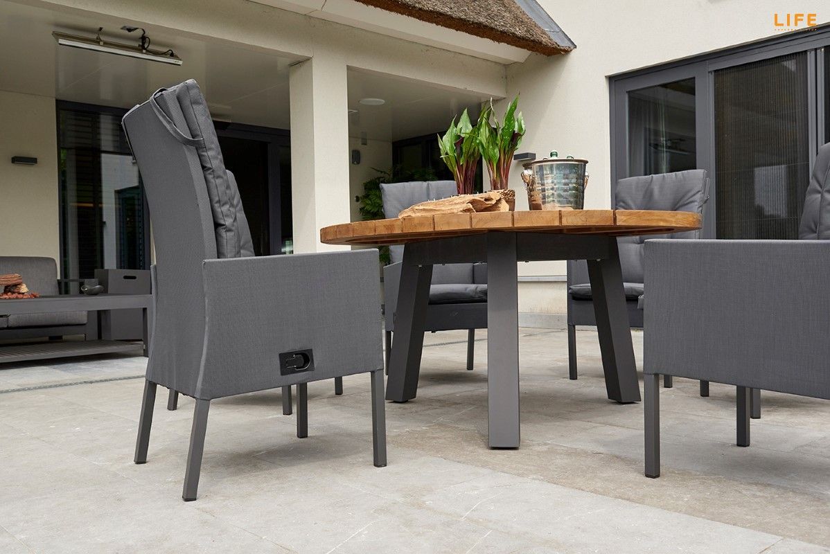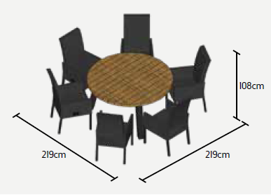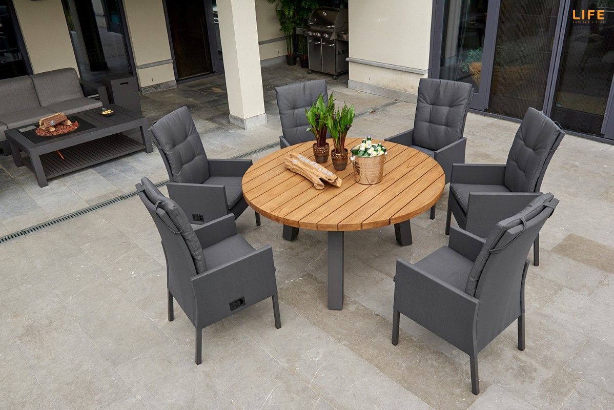 Nádherná a velmi pohodlná zahradní jídelní sestava Texas Caribean Lava je ideální volbou pro ty, kteří rádi stolojí za kulatým stolem a vychutnávají si tak bližší kontakt se všemi přáteli za stolem. Stůl má hliníkový rám a stolová deska je z masivního teakové dřeva z certifikovaných indonézských plantáží. Křeslo Caribean je polohovatelné pomocí páčky na pravé venkovní straně. Křeslo může být venku za každého počasí díky potahům z All Weather Cushions, takže Vás nepřekvapí ani rychlý letní déšť. Pohodlné podsedáky jen podtrhují maximální pohodlnost tohoto křesla. Prostorovou dispozici soupravy můžete vidět na přiloženém obrázku.