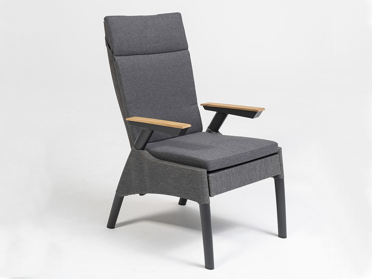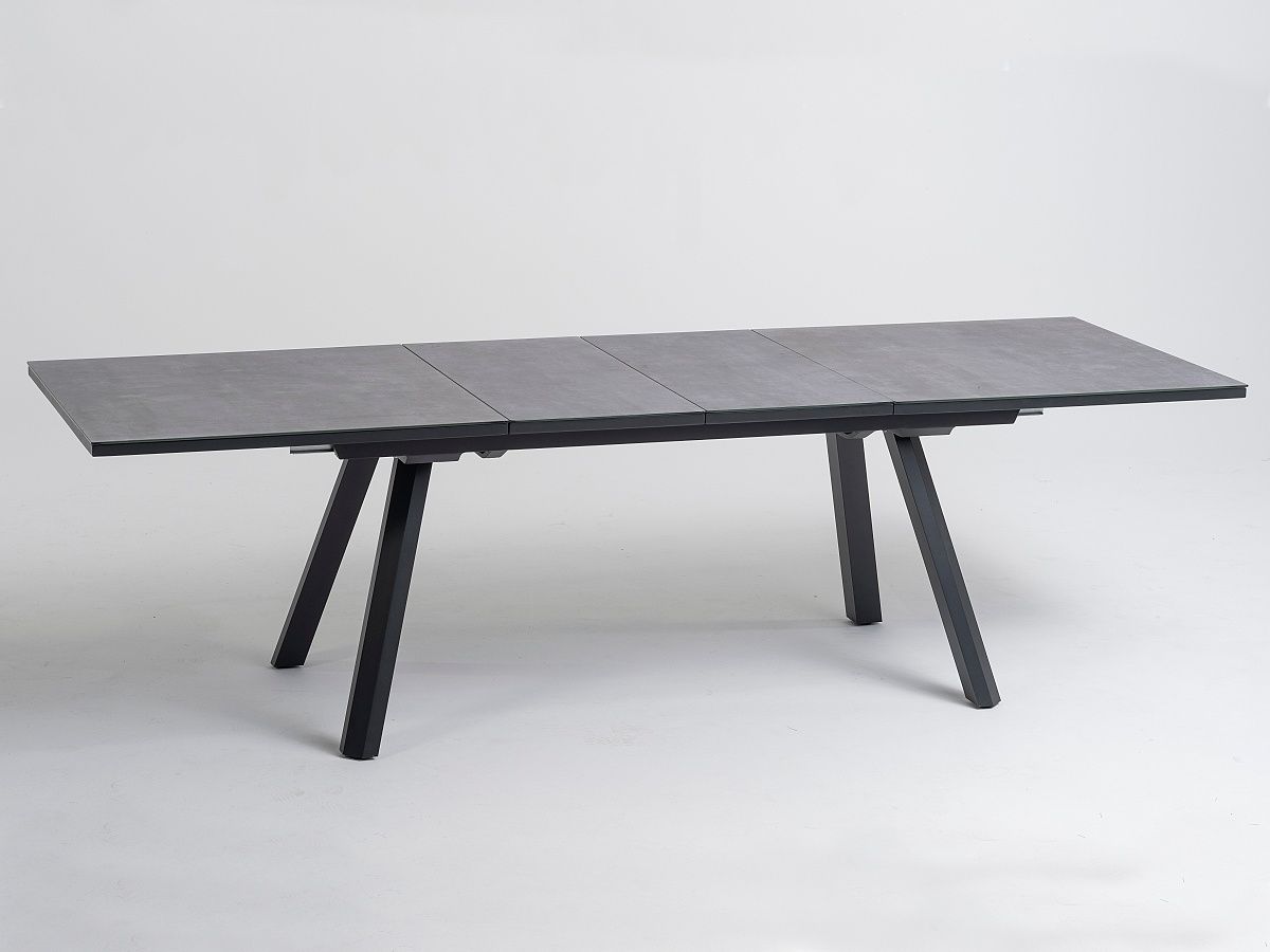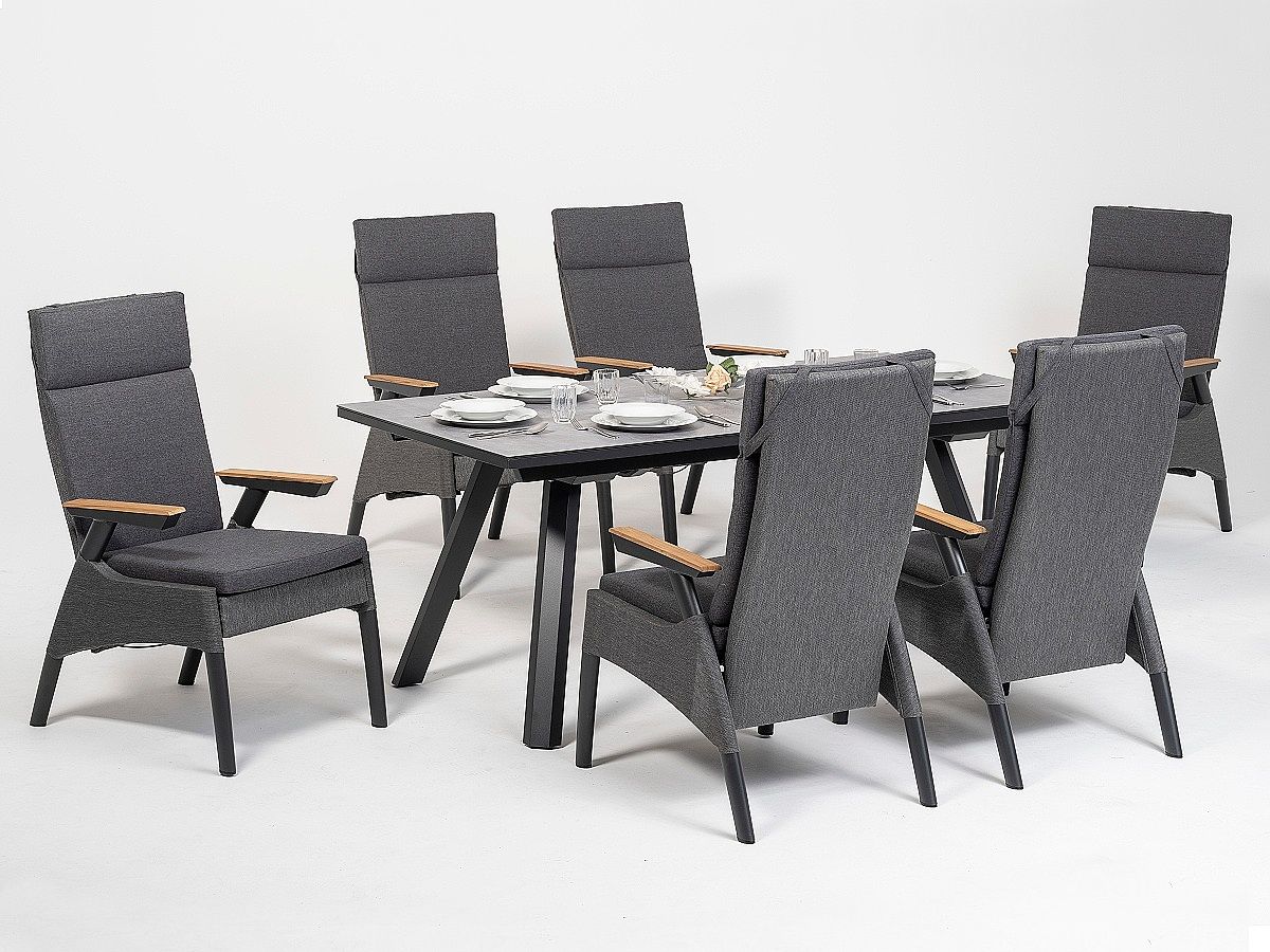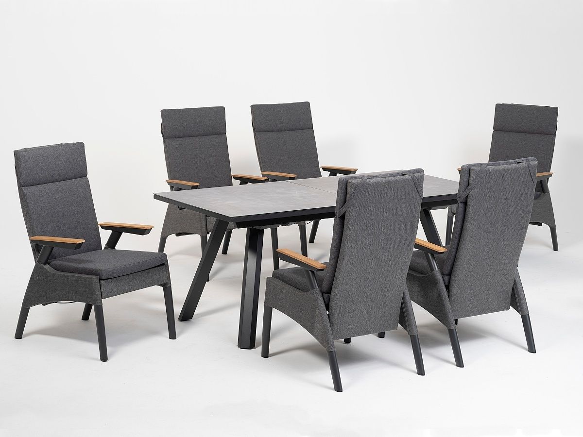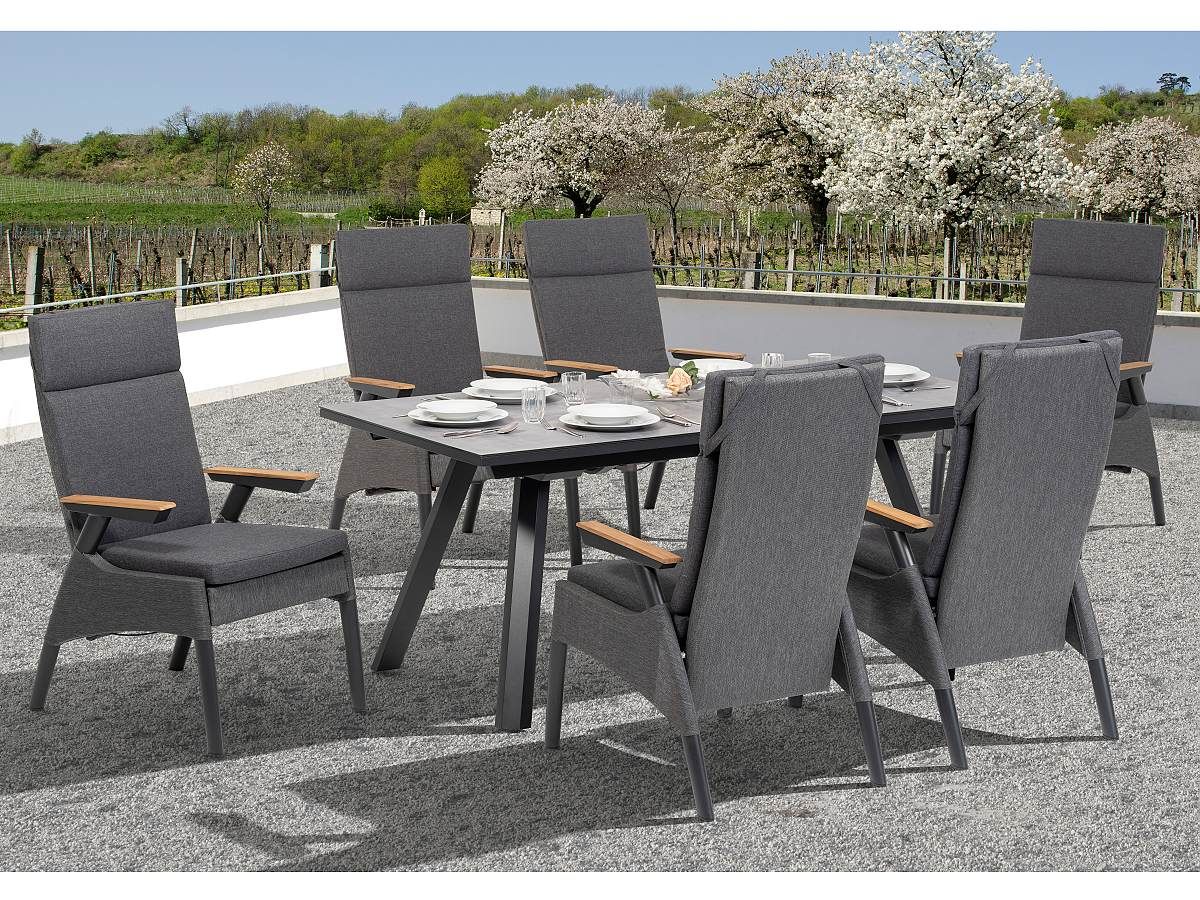 Elegantní moderní jídelní stolová sestava Thassos je ideální volbou na terasy moderních domů. Stůl má hliníkový rám antracitové barvy, stolová deska je z tvrzeného skla s keramickým nástřikem s kamenným efektem. Stůl je možné rozložit do dvou různých velikostí, takže k němu pohodlně usadíte celou rodinu. Křesla Thassos mají také hliníkový rám s textilným potahem, který působí elegantně a zároveň je velmi pohodlný. Křeslo sa dá jednoduše polohovat díky tlačítku na boku opěrky. Díky vysokému opěradlu je křeslo velice pohodlné i pro vysoké lidi.