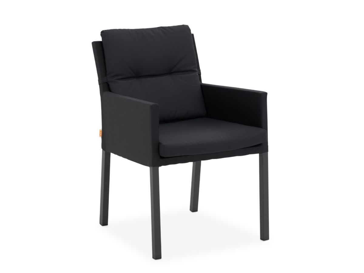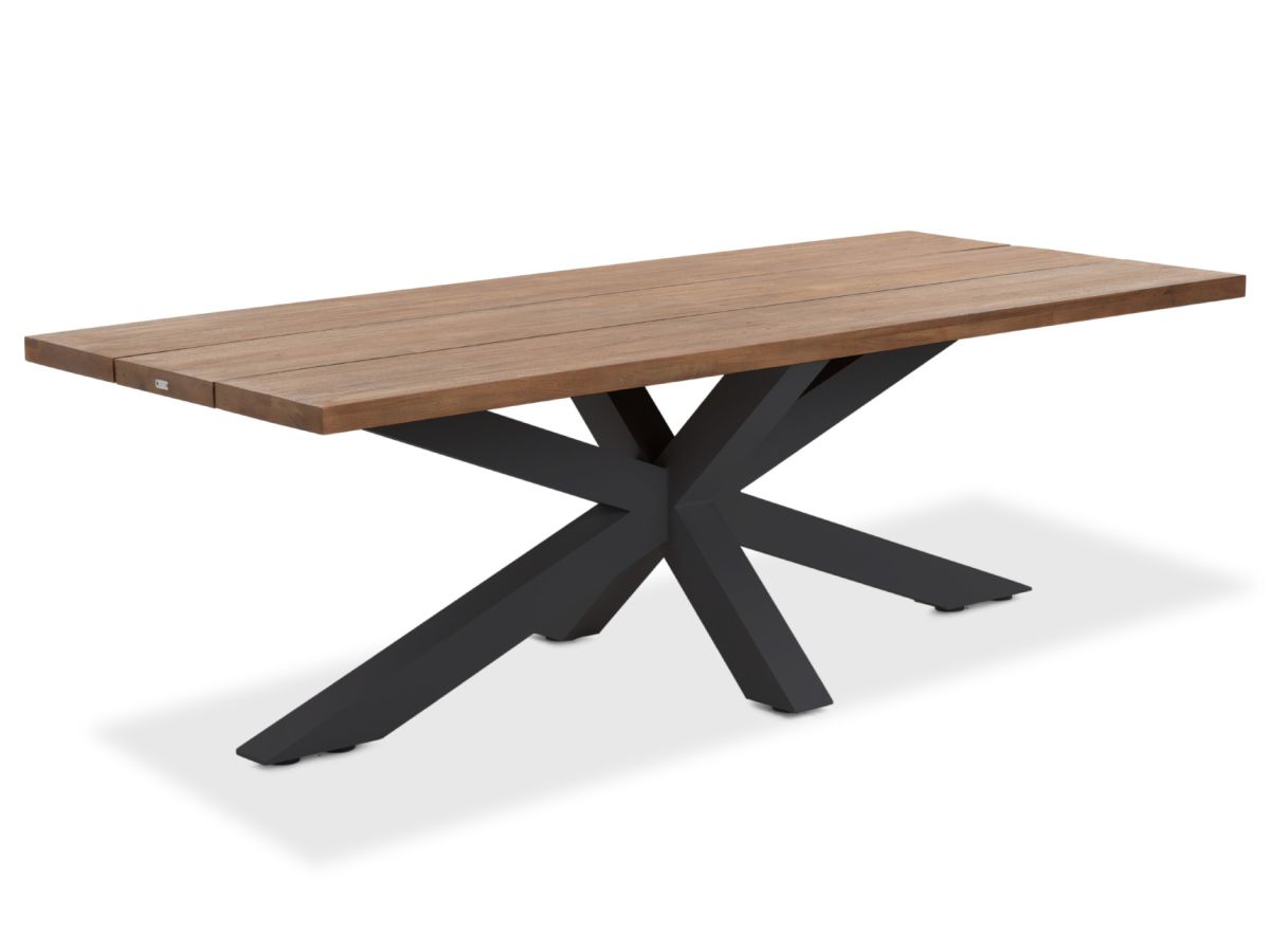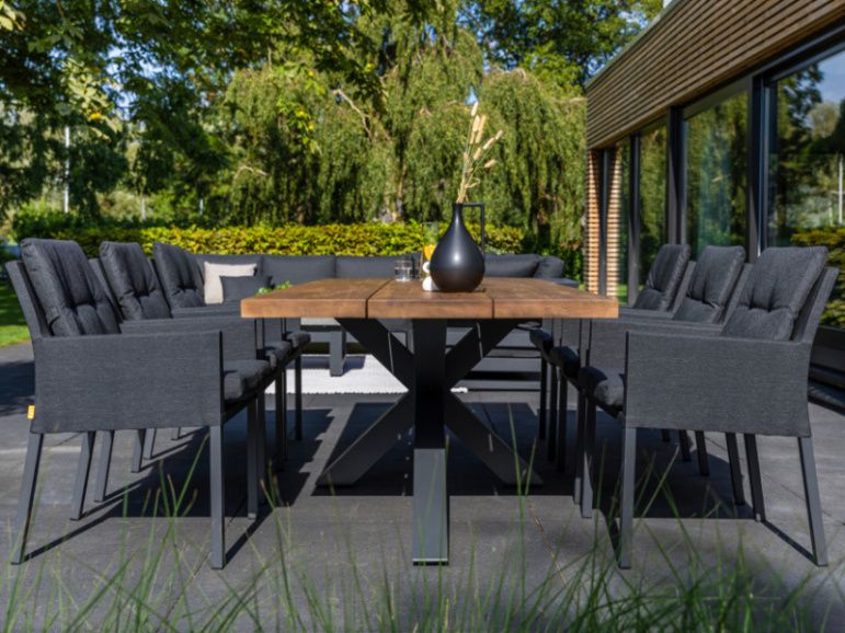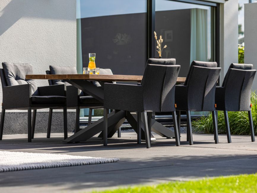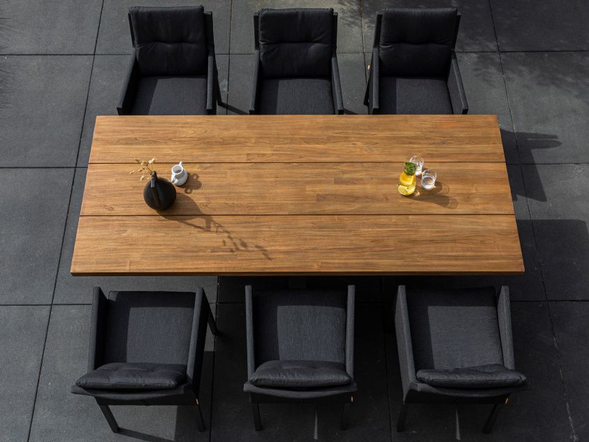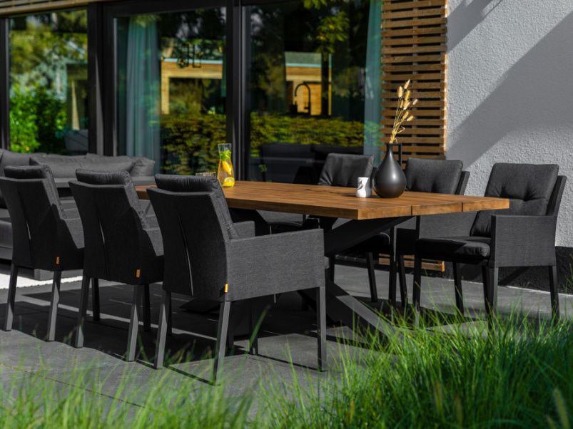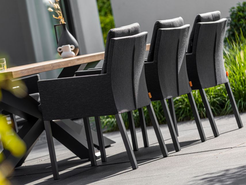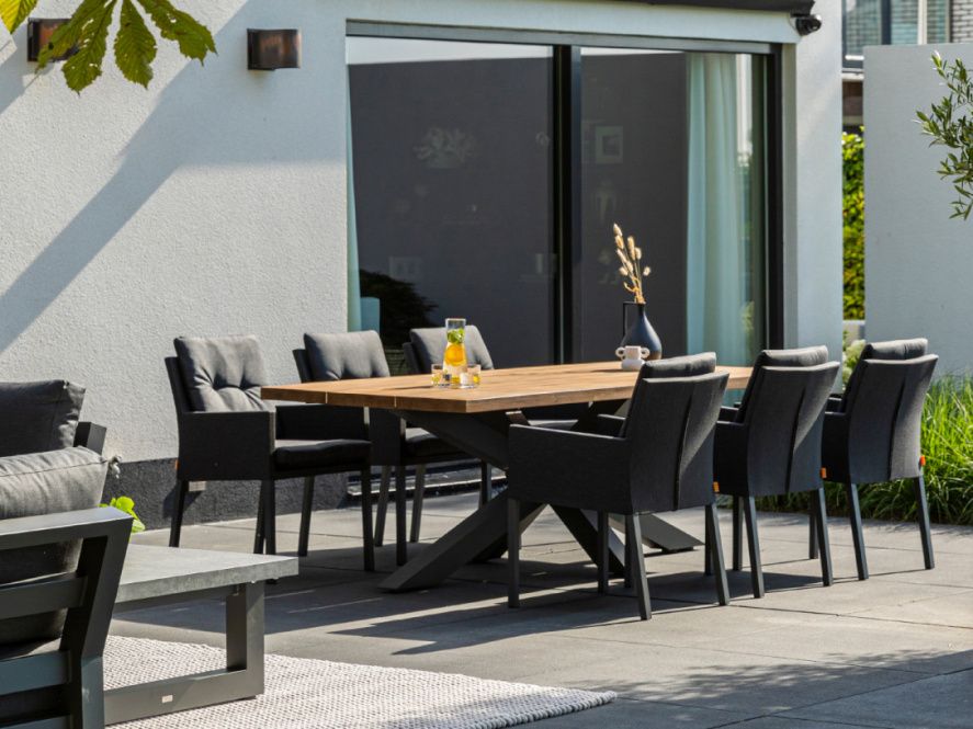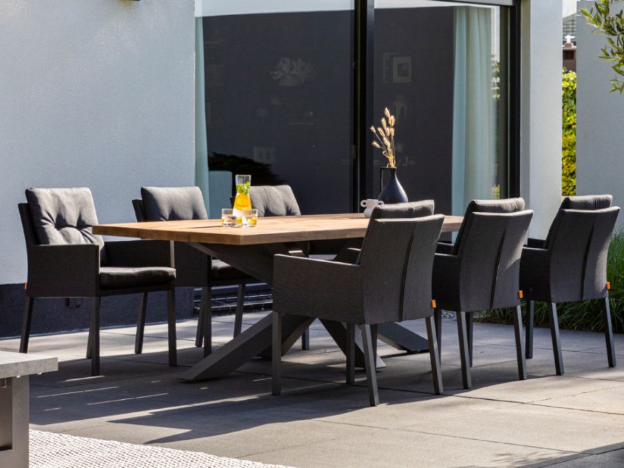 Exkluzivní jídelní stolová sestava Timor Caribean Graphite se silným hliníkovým rámem s křížovou základnou a nádhernou robustní teakovou stolovu deskou bude působit luxusním dojmem na každé terase. Stolová deska je vyrobená ze 100% certifikovaného premiového teakové dřeva. Židle Caribean má hliníkovou konstrukci a potah z látky Graphite SOLTEX, takže je odolná vůči všem typům počasí.