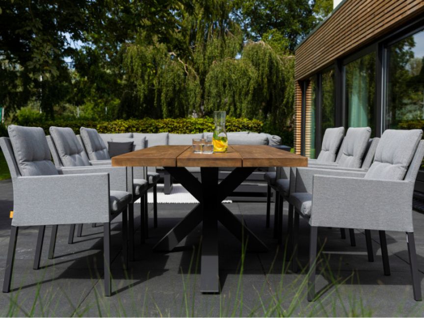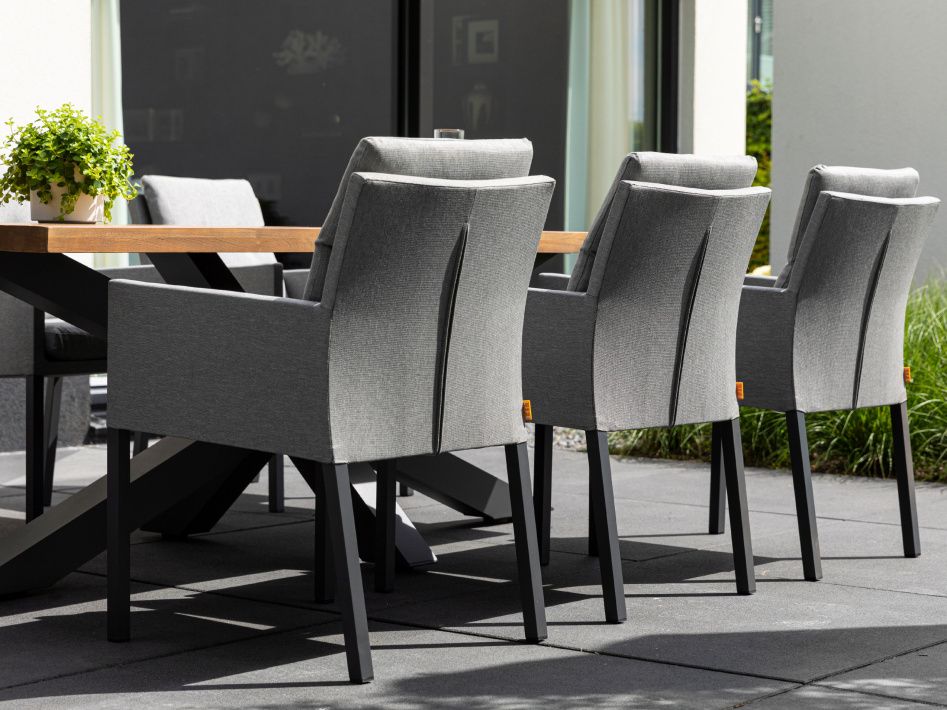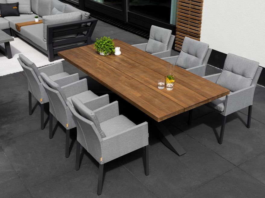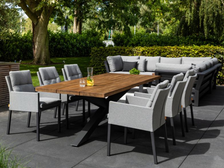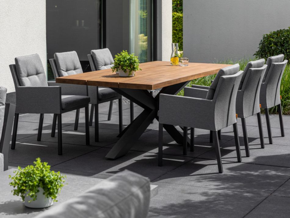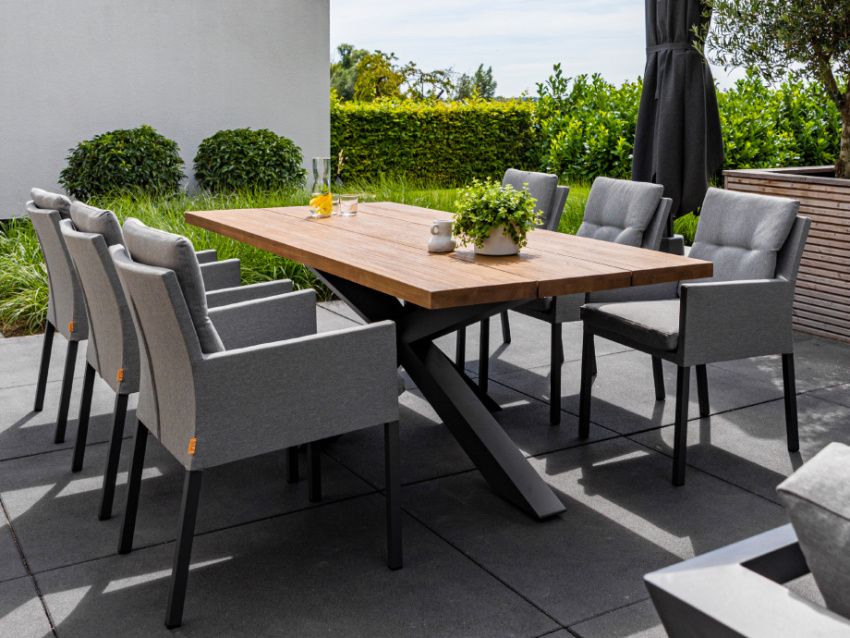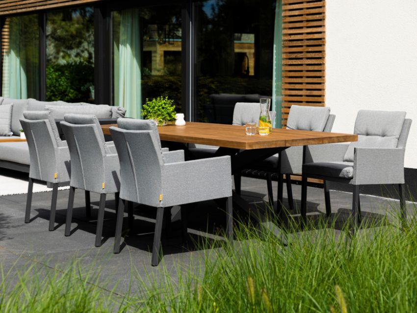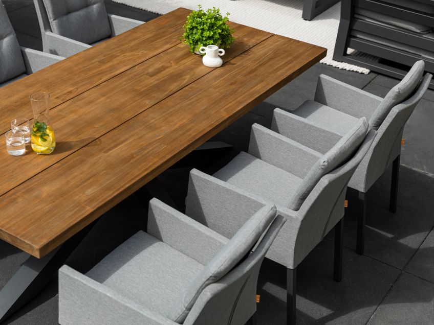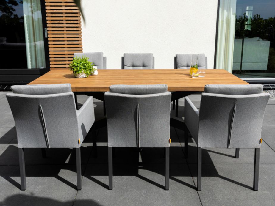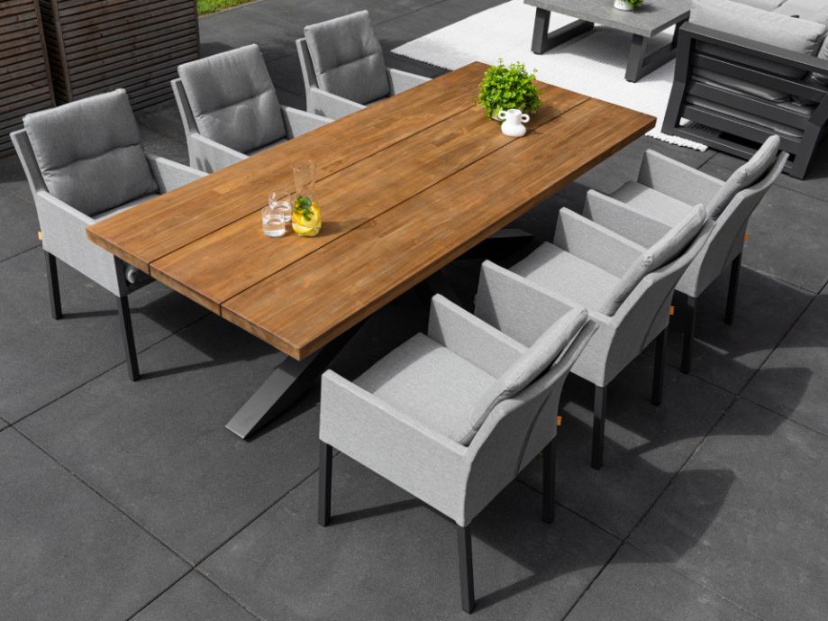 Exkluzivní jídelní stolová sestava Timor Caribean Mist Grey se silným hliníkovým rámem s křížovou základnou a nádhernou robustní teakovou stolovu deskou bude působit luxusním dojmem na každé terase. Stolová deska je vyrobená ze 100% certifikovaného premiového teakové dřeva. Židle Caribean má hliníkovou konstrukci a potah z látky Mist Grey SOLTEX, takže je odolná vůči všem typům počasí.