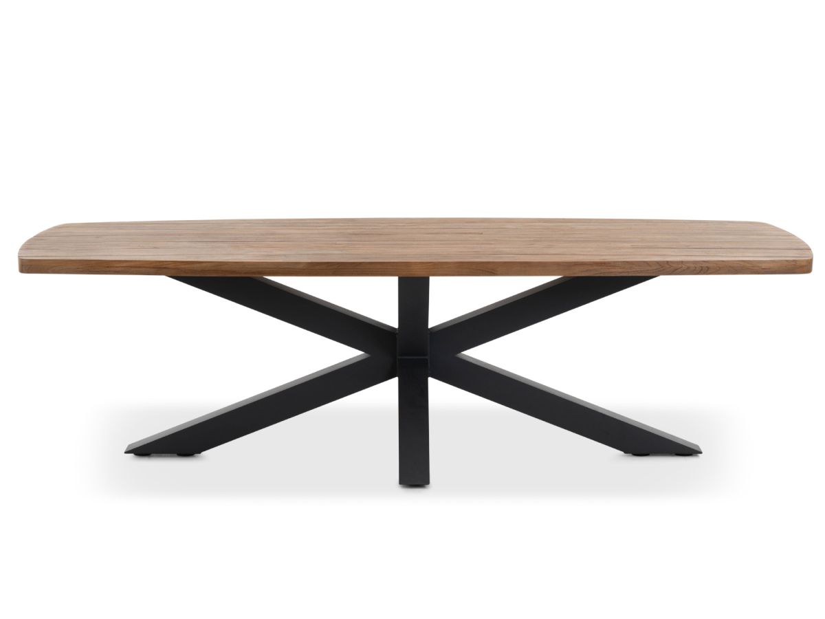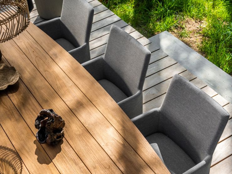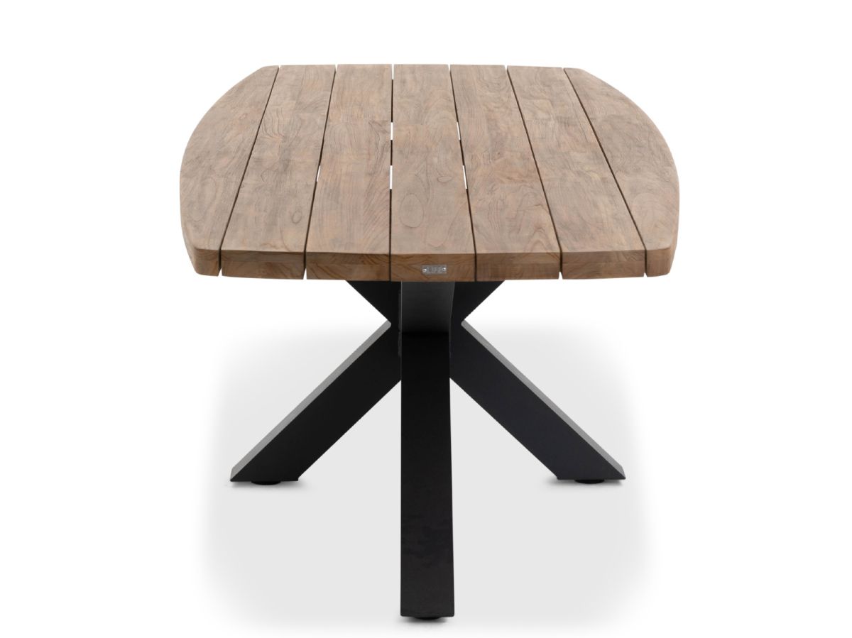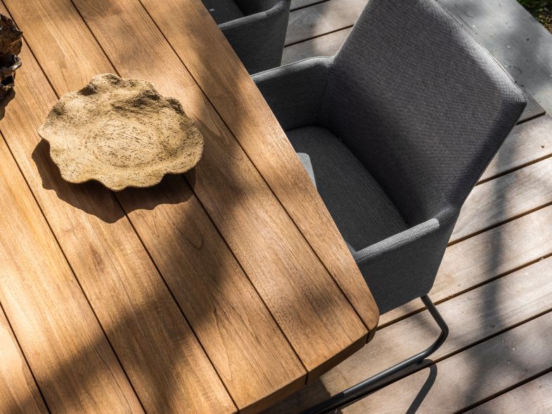 Exkluzivní jídelní stolová sestava Timor Oval Blixum Mist Grey se silným hliníkovým rámem s křížovou základnou a nádhernou robustní teakovou stolovu deskou bude působit luxusním dojmem na každé terase. Stolová deska je vyrobená ze 100% certifikovaného premiového teakové dřeva. Židle Blixum má hliníkovou konstrukci a potah z látky Mist Grey SOLTEX, takže je odolná vůči všem typům počasí.