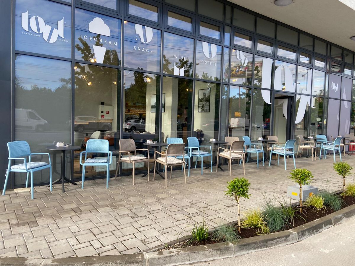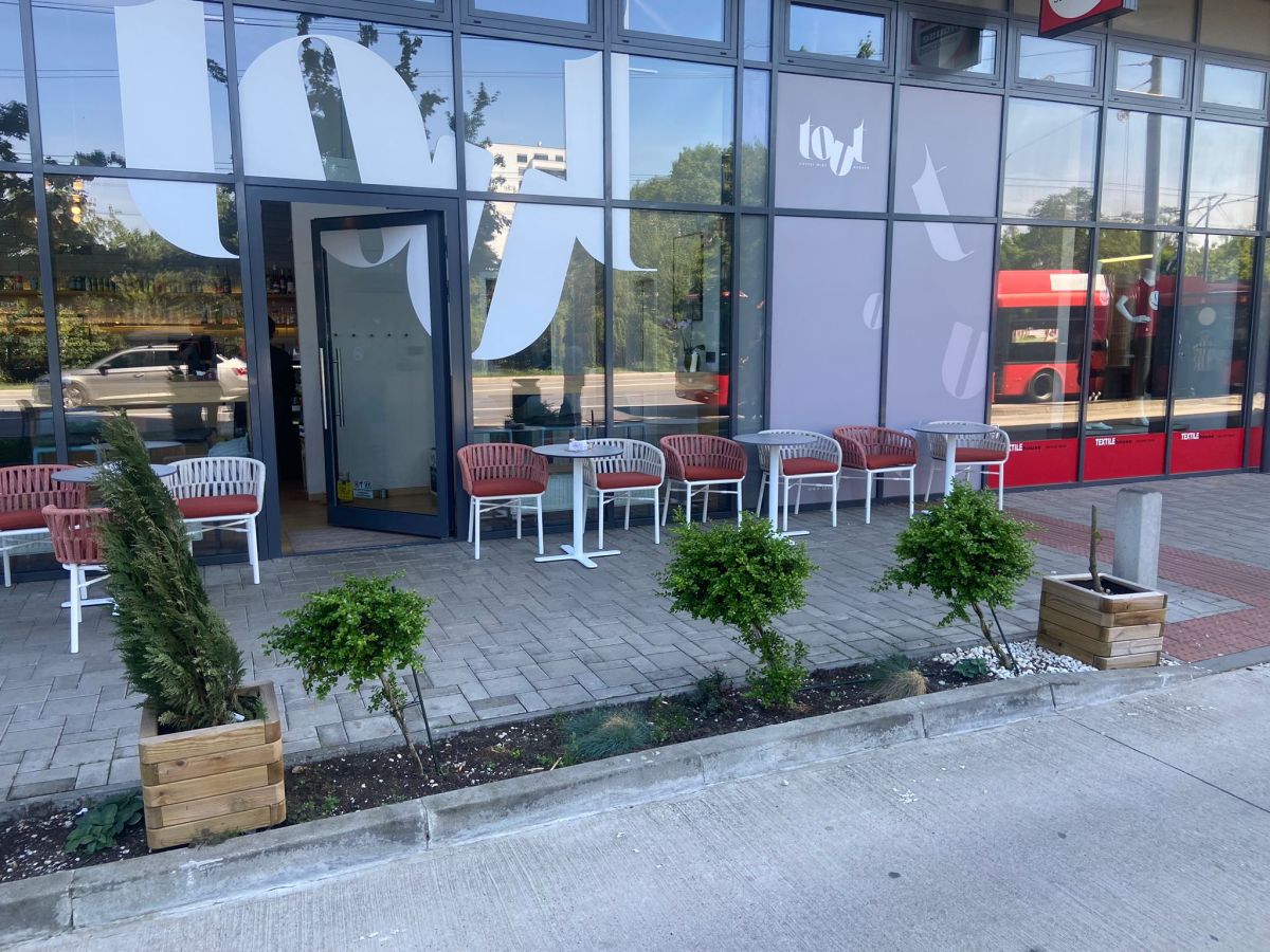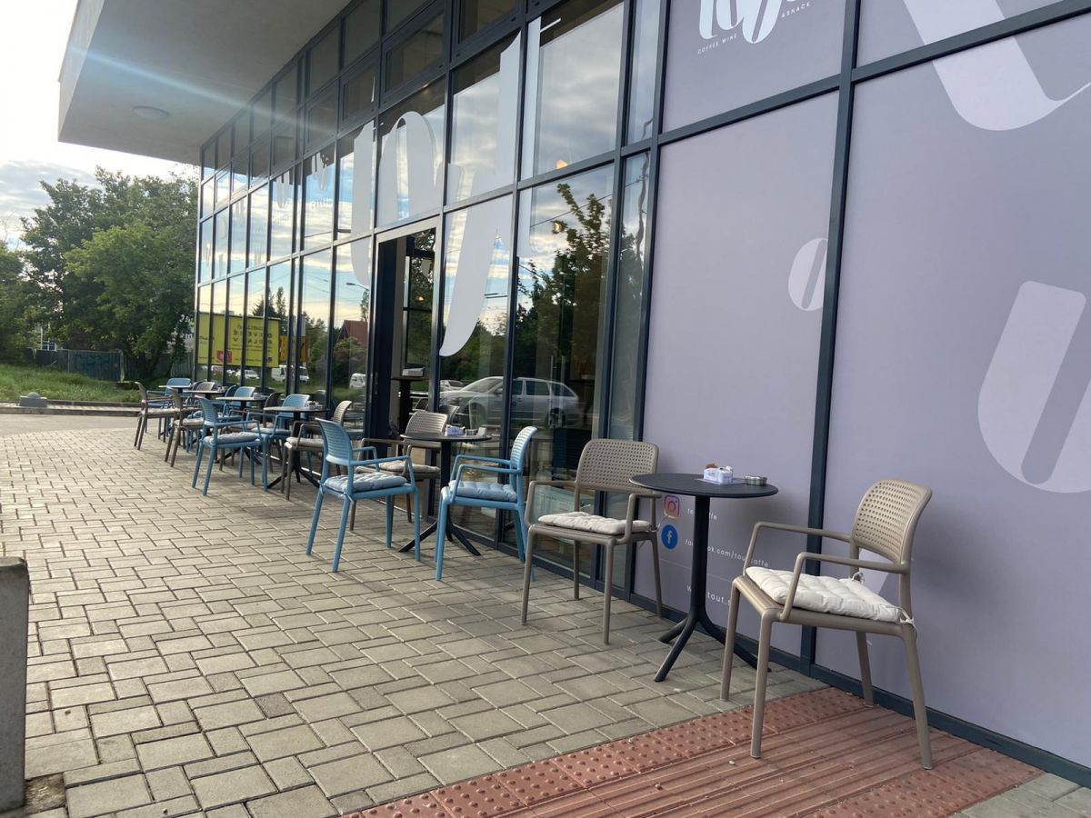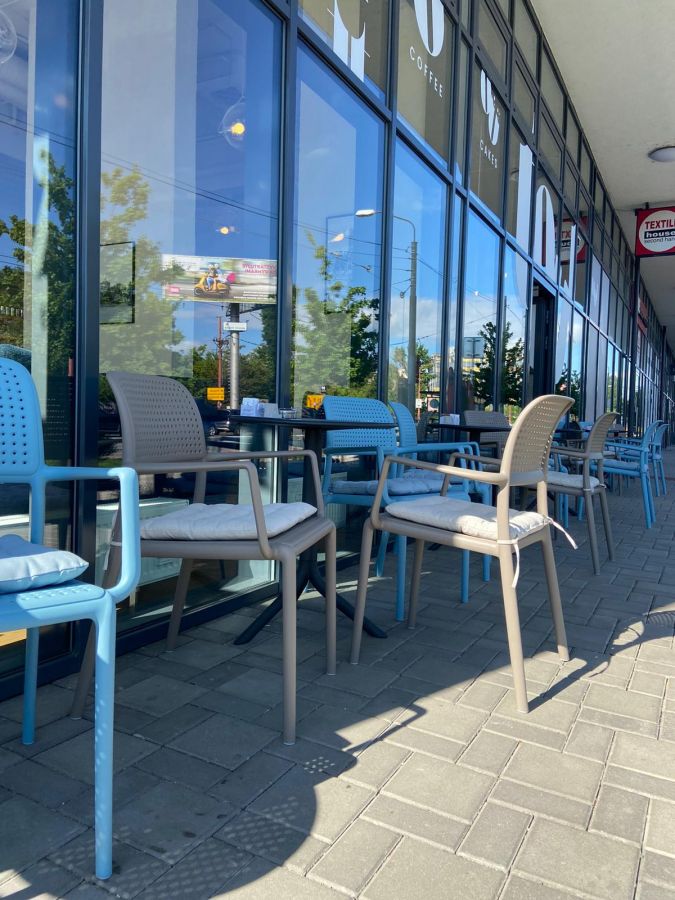 Zařízení nové moderní kavárny Tout Coffee v Bratislavě krásnými židlemi Berry. Barevné provedení na přání klienta.