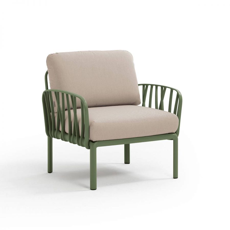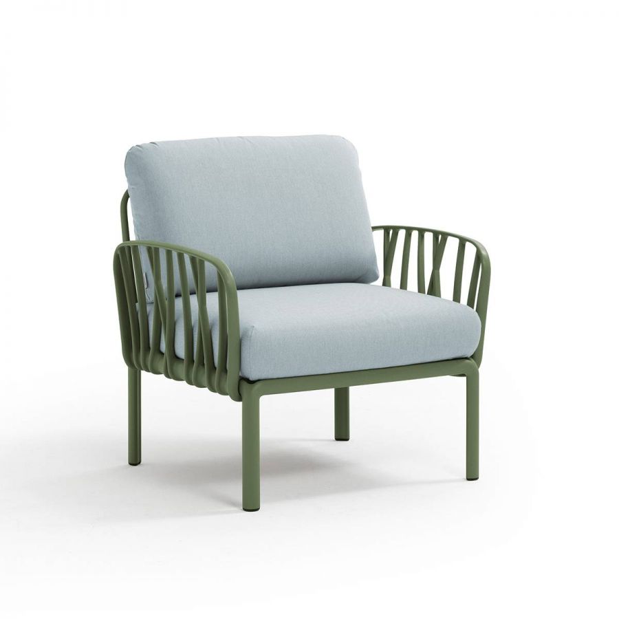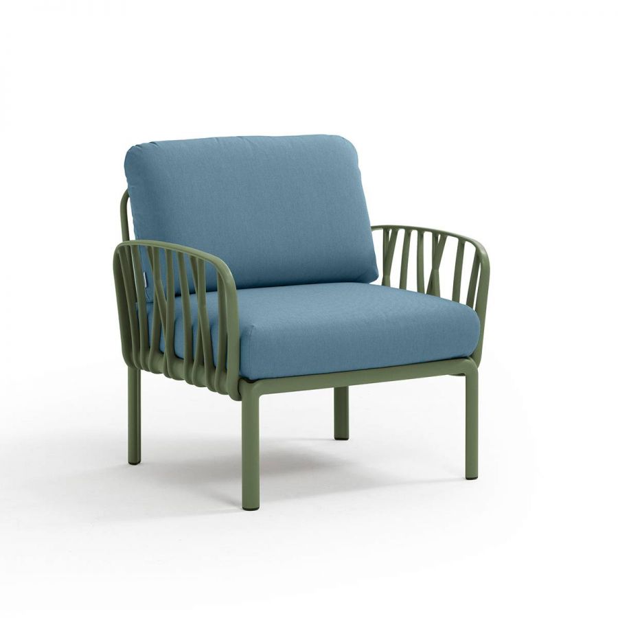 Krásné zahradní křeslo Komodo Sunbrella je díky svým barevným kombinacím a precizním líniím vrcholem italského designu. Můžete libovolně kombinovat barvu konstrukce s barvami podsedáku. Konstrukce křesla je z tvrzeného plastu zpevněného skelným vlákem. Zádový polštář i podsedák jsou kompletně snímatelné, dají se prát na 30°C. Podsedák má navíc speciální úchytky, díky kterým jej zespodu jednoduše připevníte ke konstrukci, takže Vám neuletí ani ve větším větru. Díky použití látky Sunbrella můžete nechat podsedáky venku i během nepříznivého počasí.