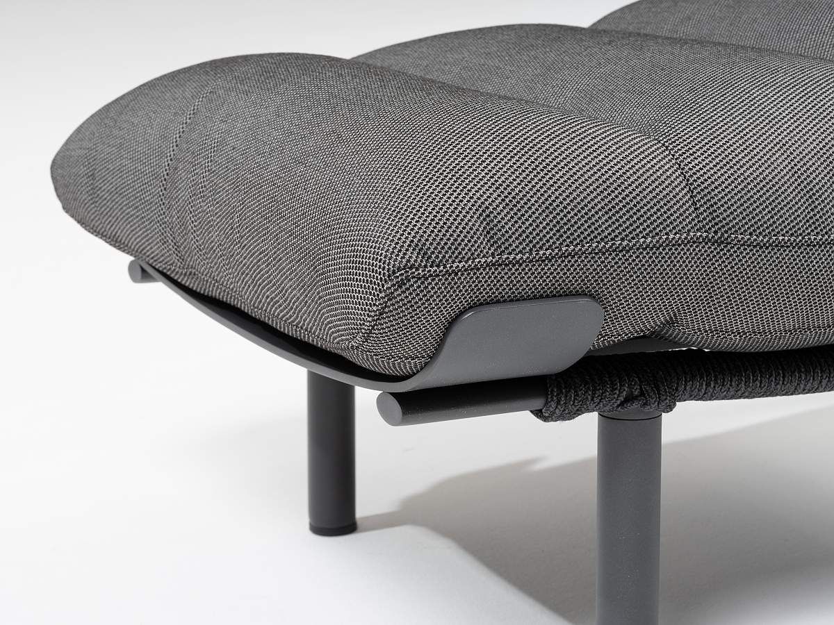 Čalúnenie: Sedacie a chrbtové vankúše z exkluzívnej látky Axroma (kód 601.804) v elegantnej sivej farbe – špičková odolnosť voči UV žiareniu a vode.