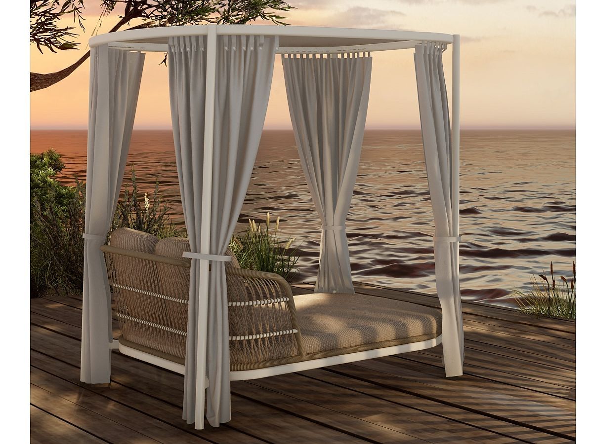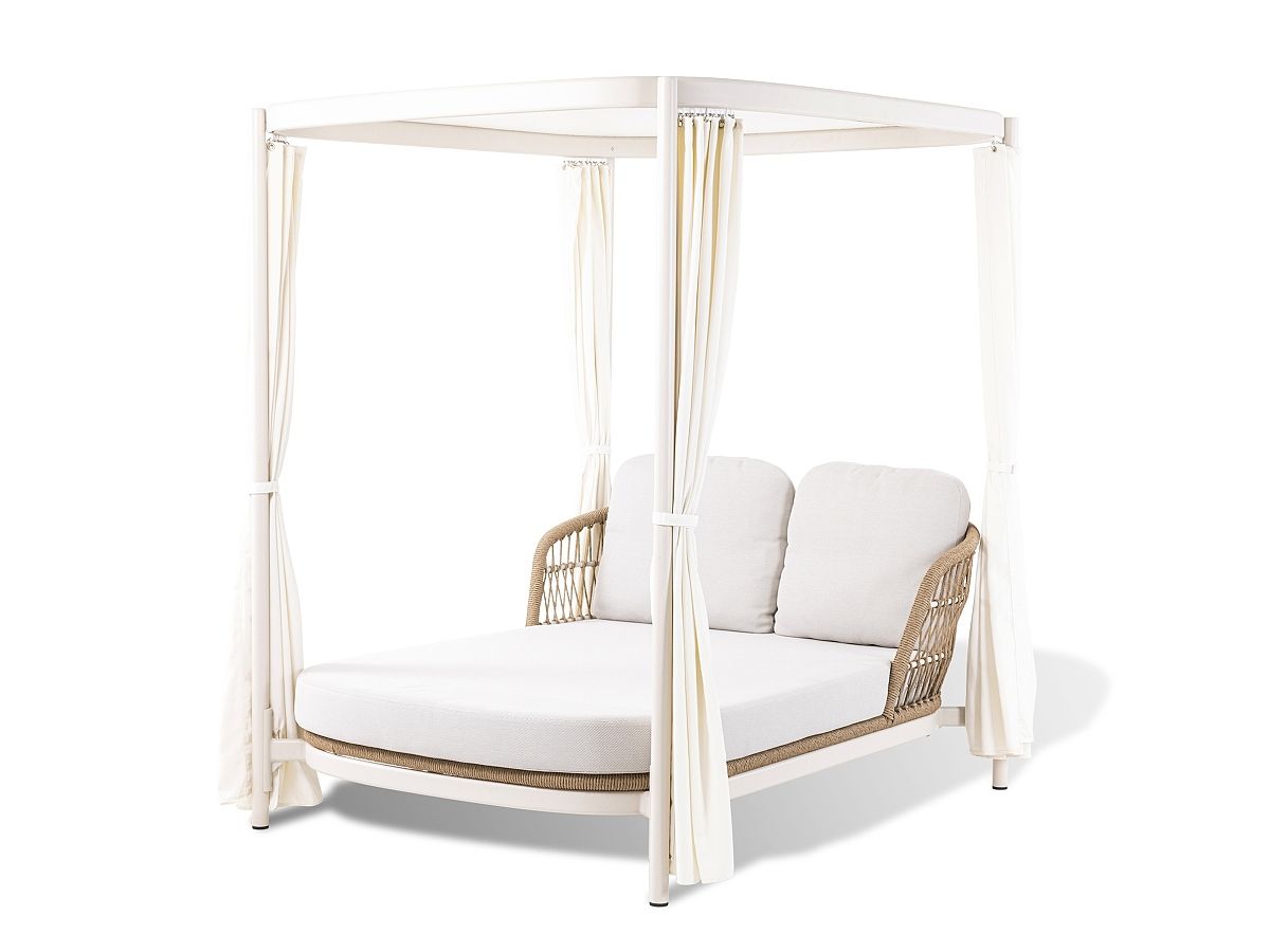 Krásné a luxusní zahradní ležadlo Bari pro dvě osoby je ideálním exteriérovým nábytkem pro aquaparky, bazénové světy nebo modernější koupaliště. Konstrukce ležadla Bari je hliníková a je stříkaná práškovou barvou v odstínu Ivory. Výplet zadní části ležadla je ze syntetického PVC lana v naturální barvě. Ležadlo krásně doplňují krémové závěsy, které slouží jako stínidlo, tak i k zachování soukromí.