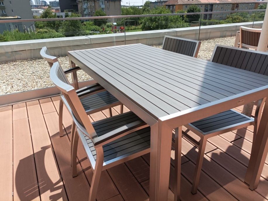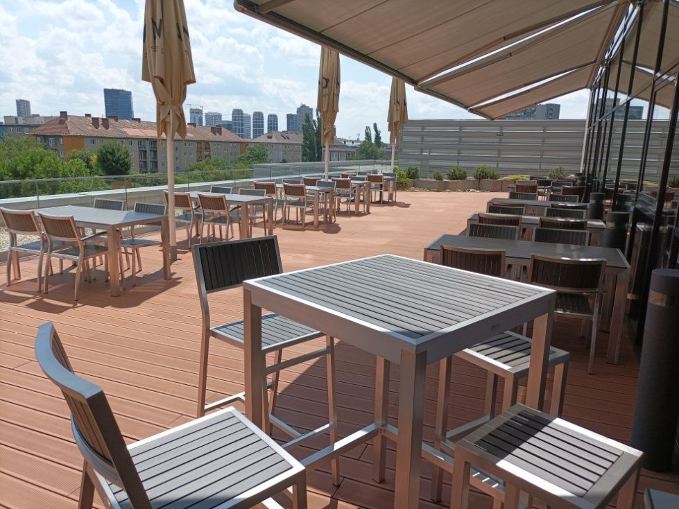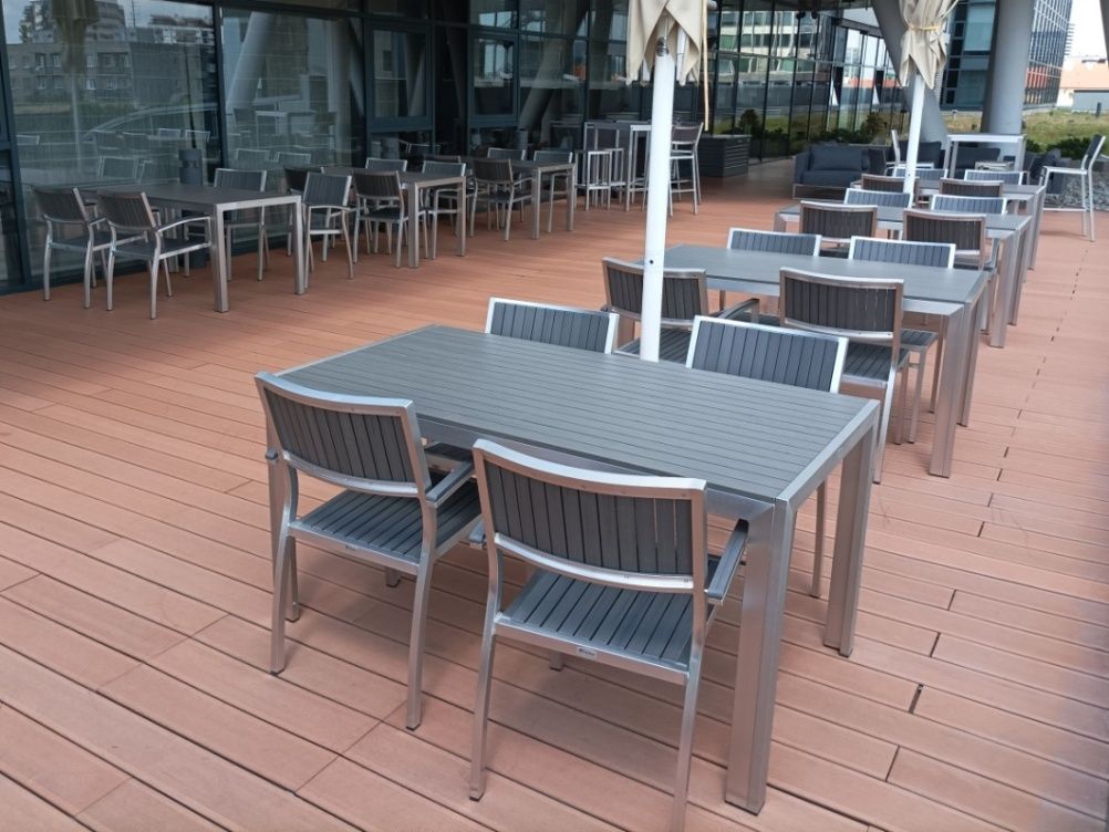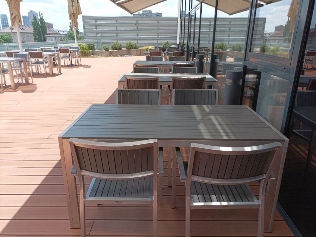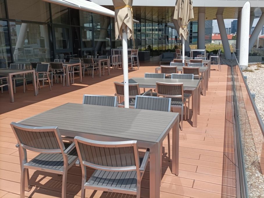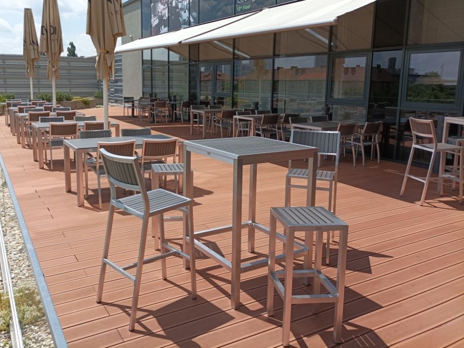 Zařízení letní terasy Lindner Hotel Gallery Central v Bratislavě. Dodávali jsme praktické a odolné stolové a barové soupravy Bavaria Grey.