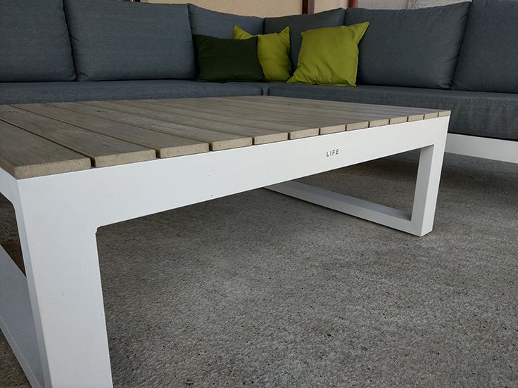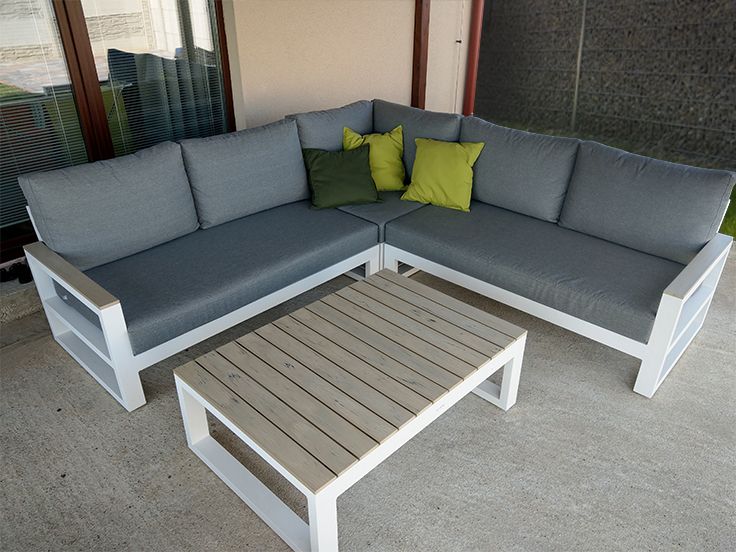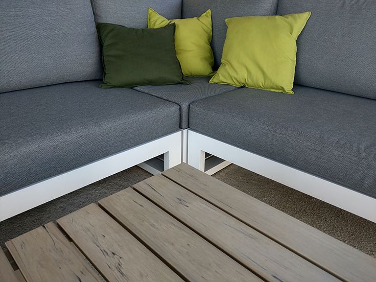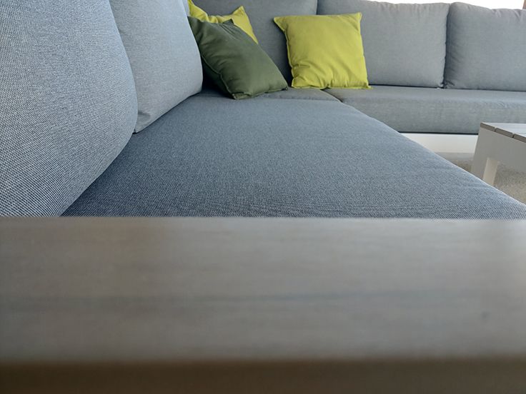 Stylová a odolná sedací souprava Mallorca White Corner s polywoodovými latěmi na opěradlech a na stole. Matrace a polštáře Mist Grey Soltex jsou určené do všech typů počasí.