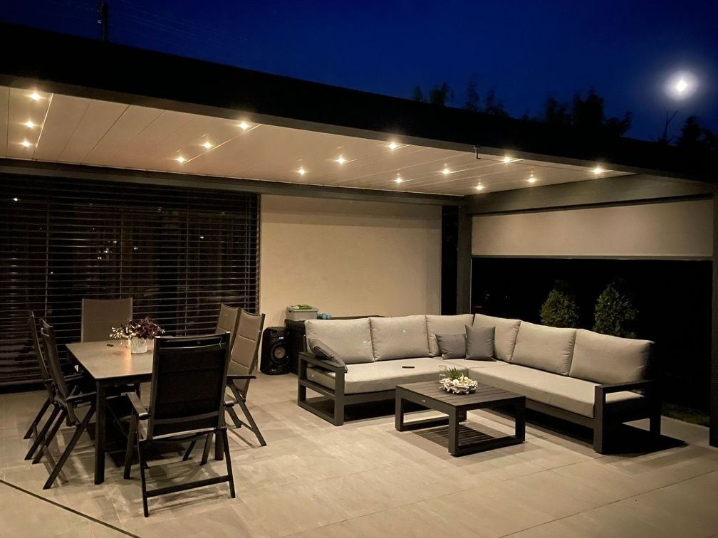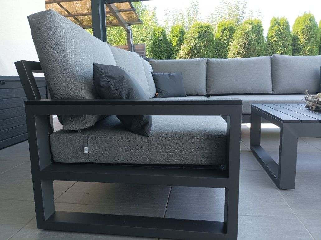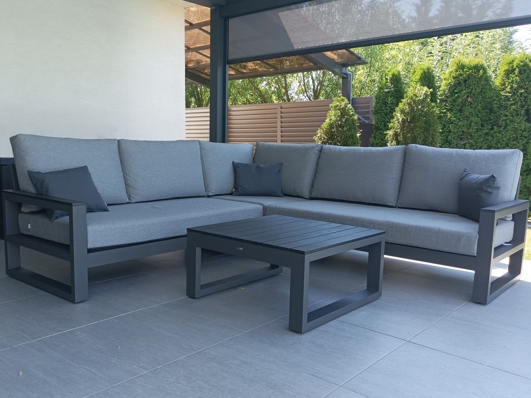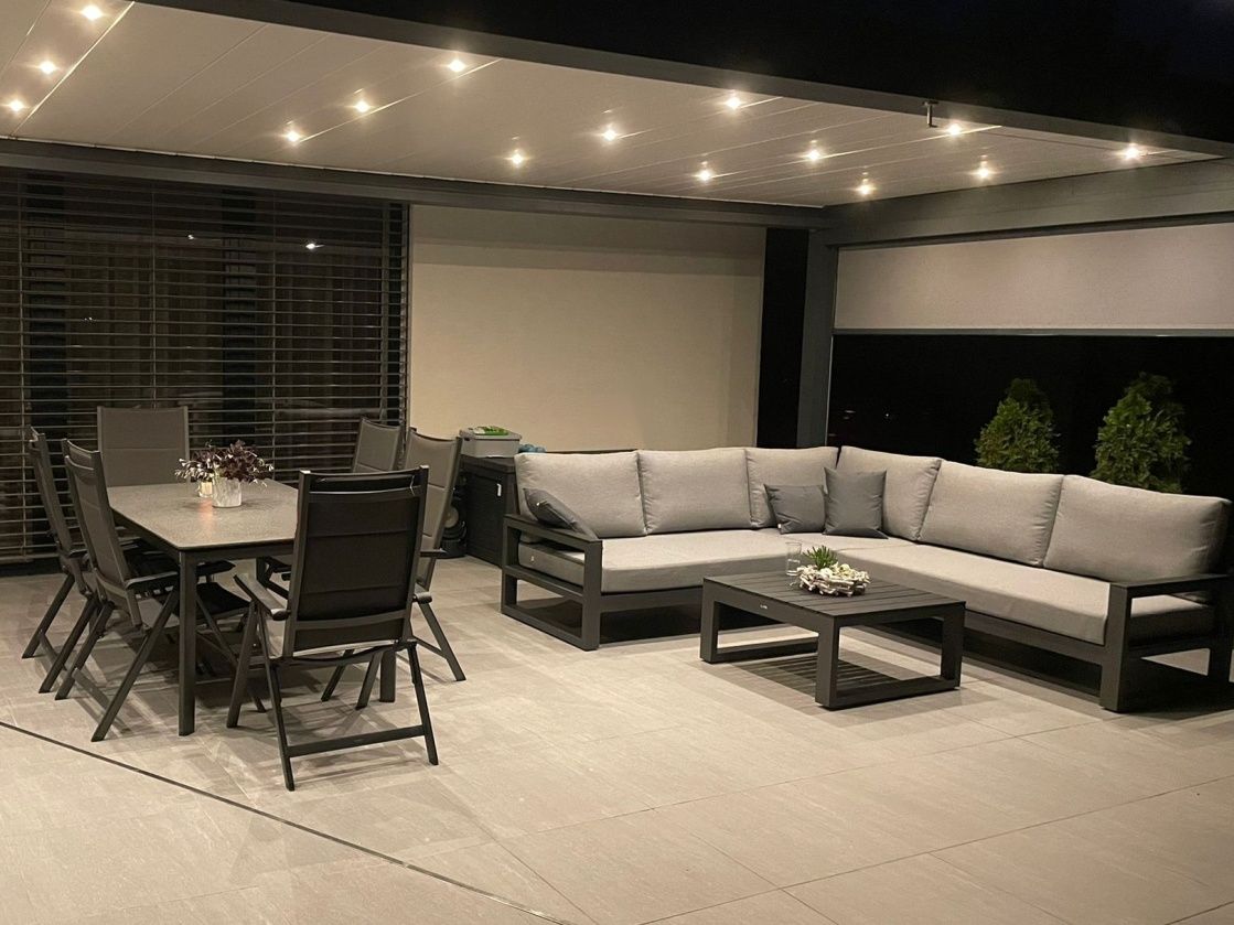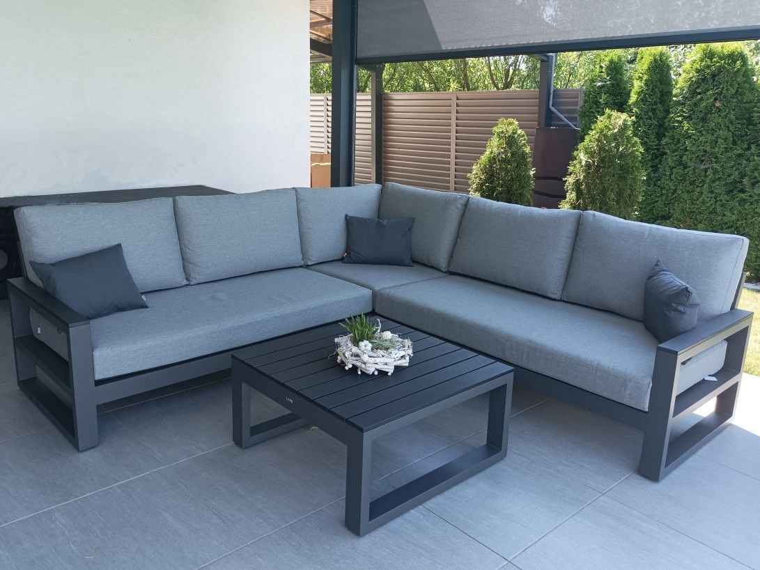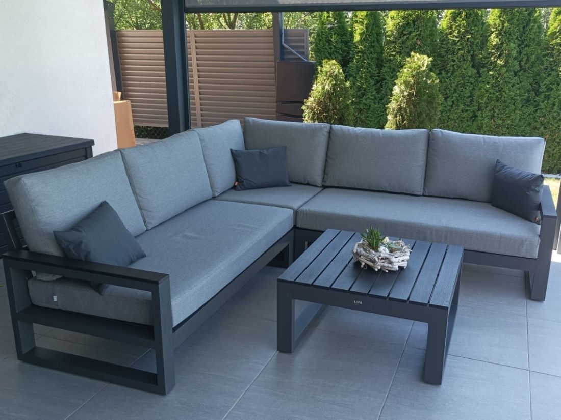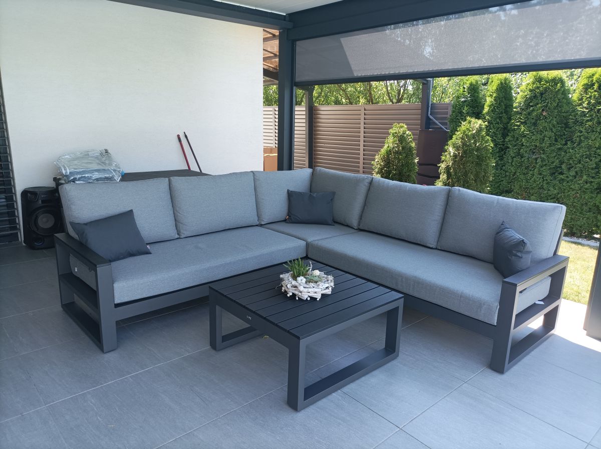 Zařízení terasy moderního domu stylovou a elegantní sedací soupravou Mallorca Corner Lava s matracemi a polštářky v provedení Mist Grey Soltex - látka je příjemná na dotek a zároveň vhodná do každého počasí.