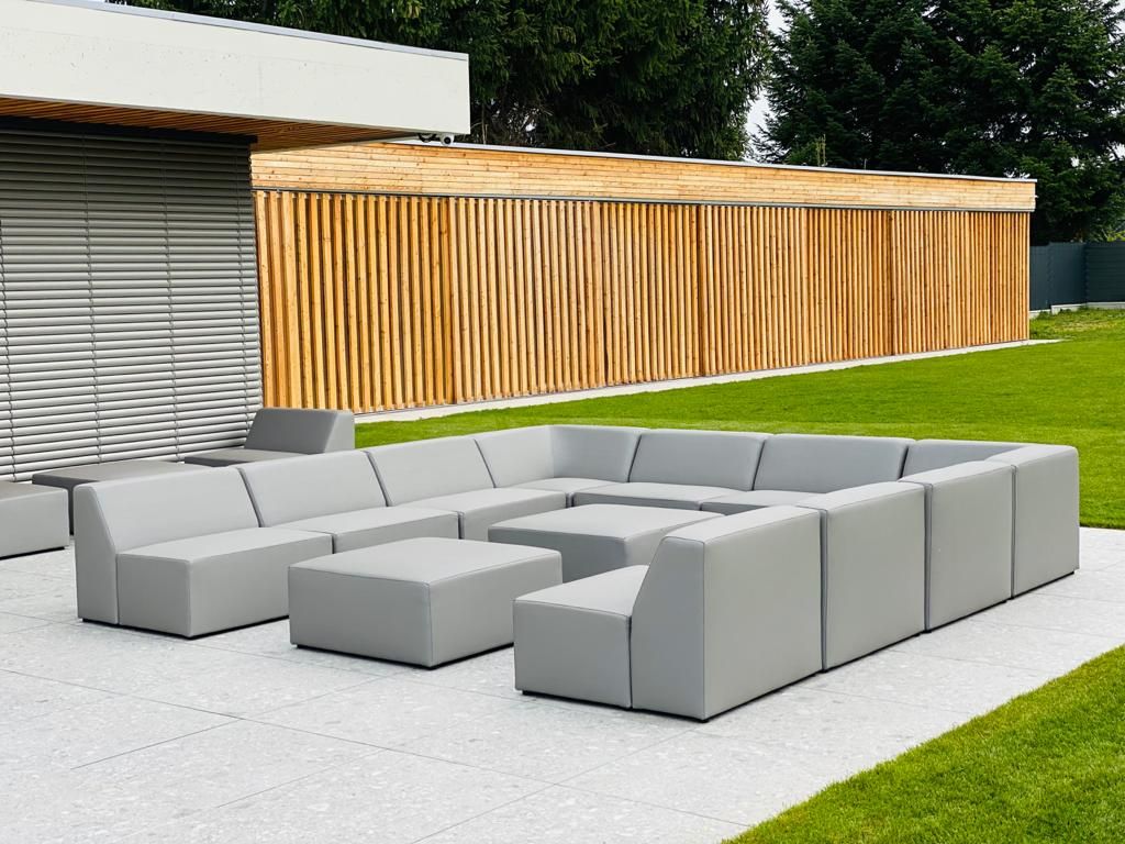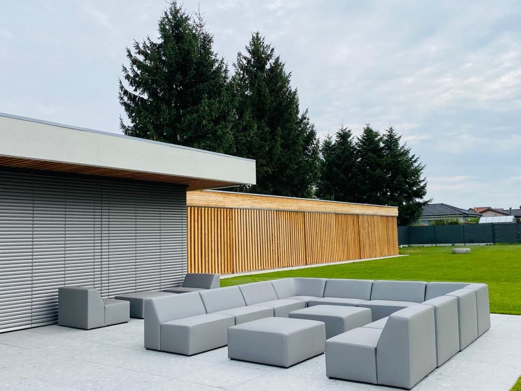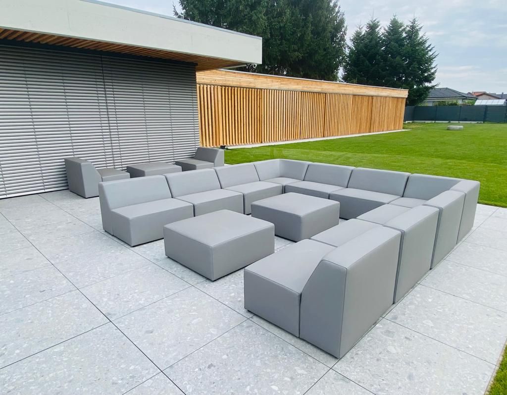 Grandiózní sedací souprava Rodos v outdoorové látce Silvertex pro celoroční použití venku. Složení modulů a barva látky podle přání klienta.