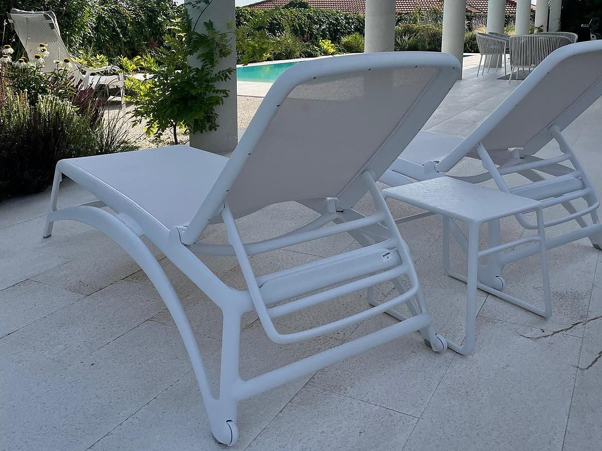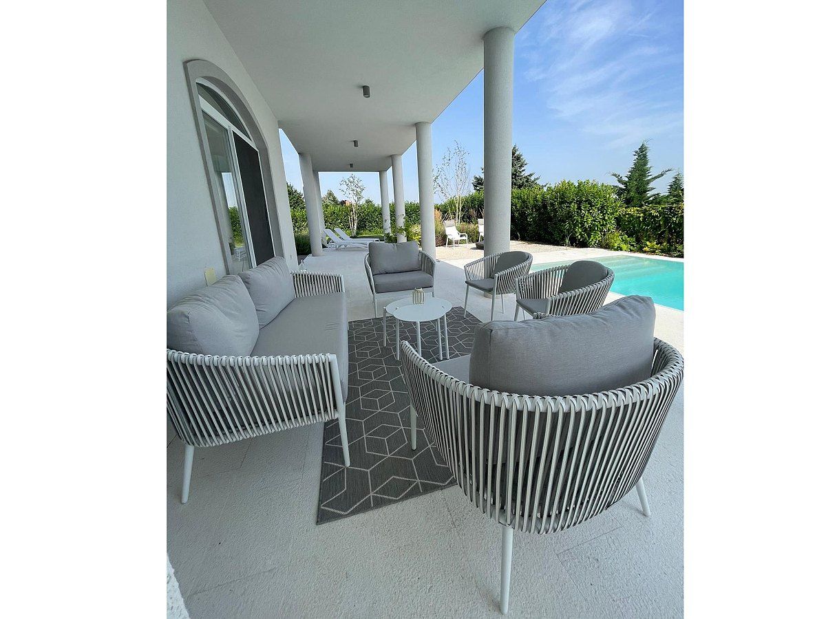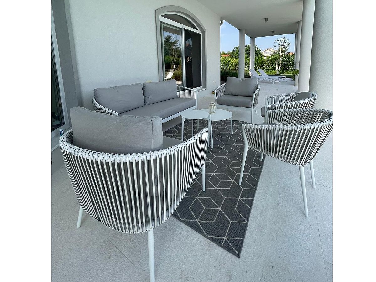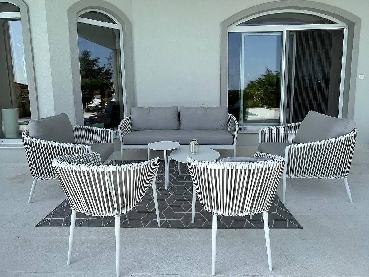 Zařízení luxusní terasy sedací soupravou Bahamas White, ve stejném designu je zvolená i stolová souprava s křesly Bahamas a stolem Long Island White. Bazénovou část krásně doplňují lehátka Atlantico a křesla Net Lounge.