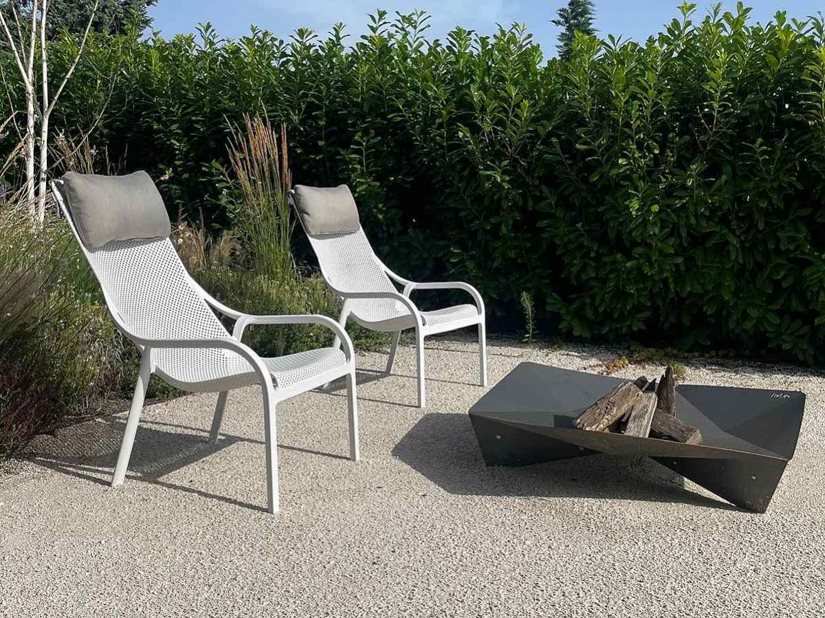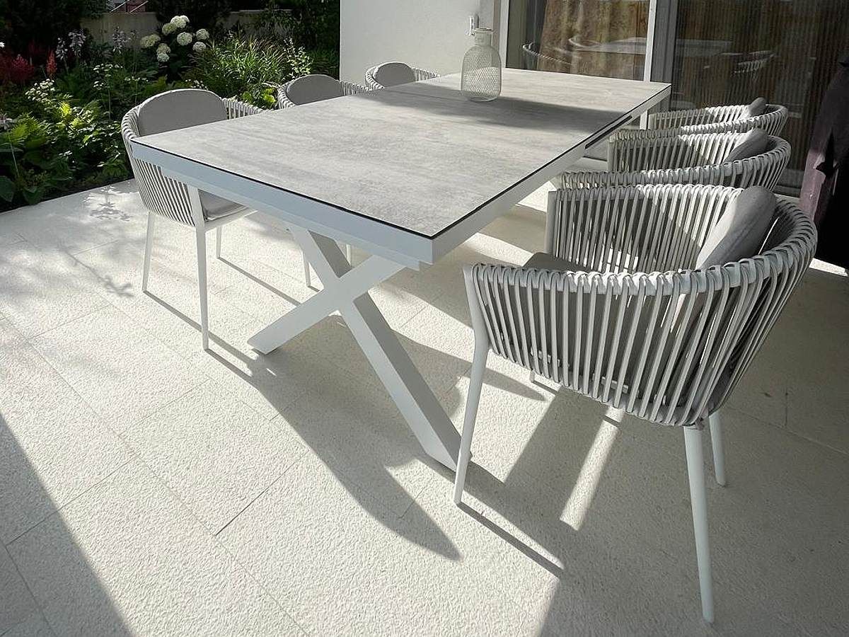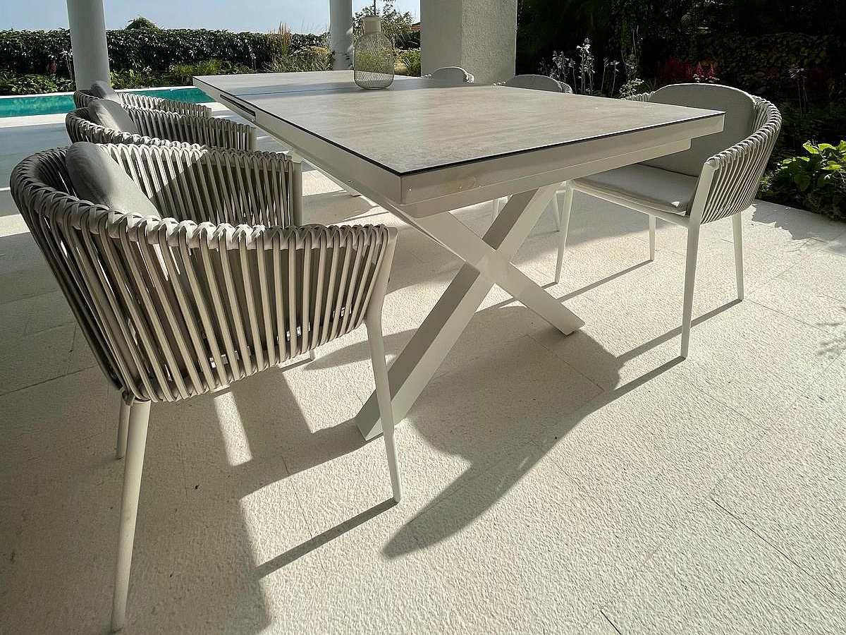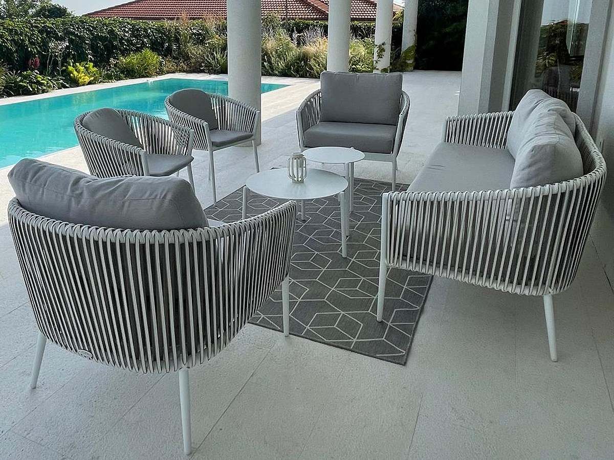 Zařízení luxusní terasy sedací soupravou Bahamas White, ve stejném designu je zvolená i stolová souprava s křesly Bahamas a stolem Long Island White. Bazénovou část krásně doplňují lehátka Atlantico a křesla Net Lounge.