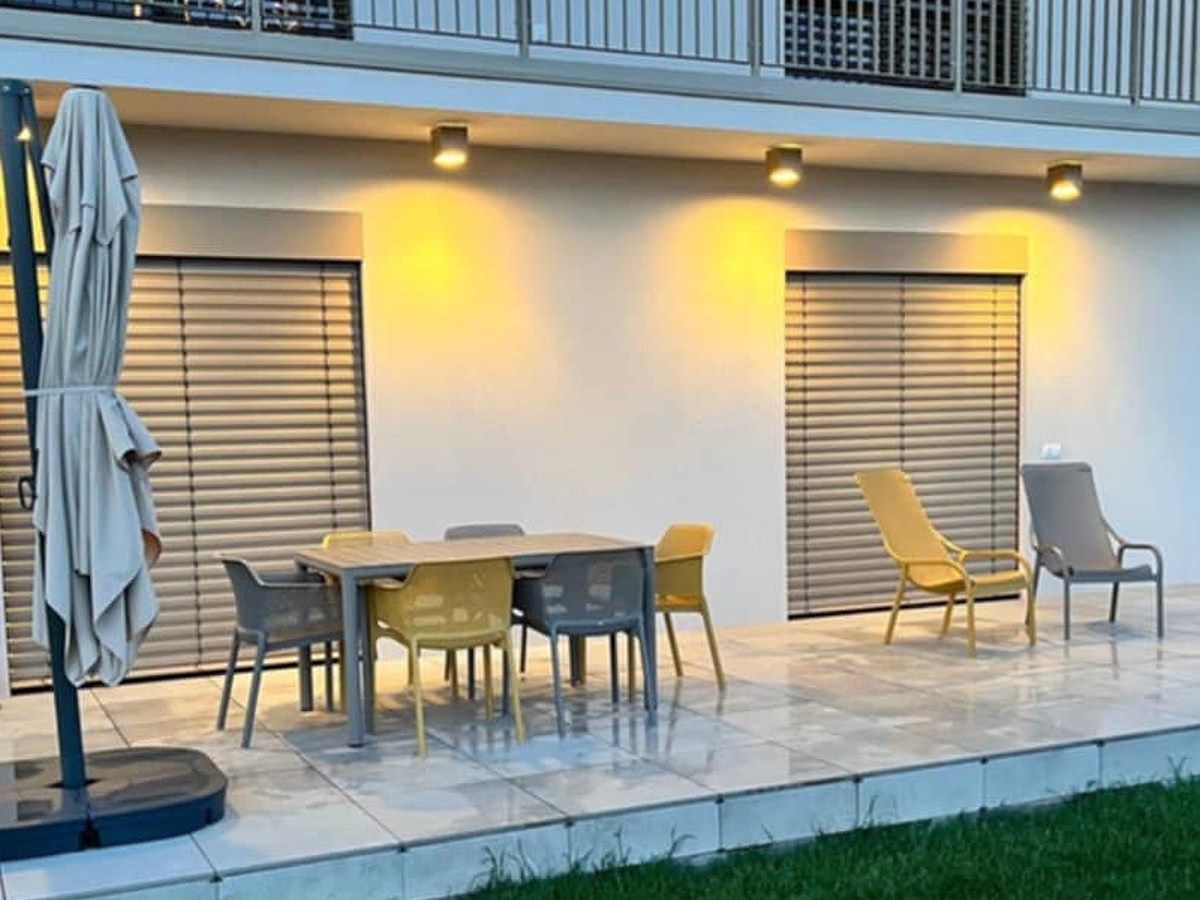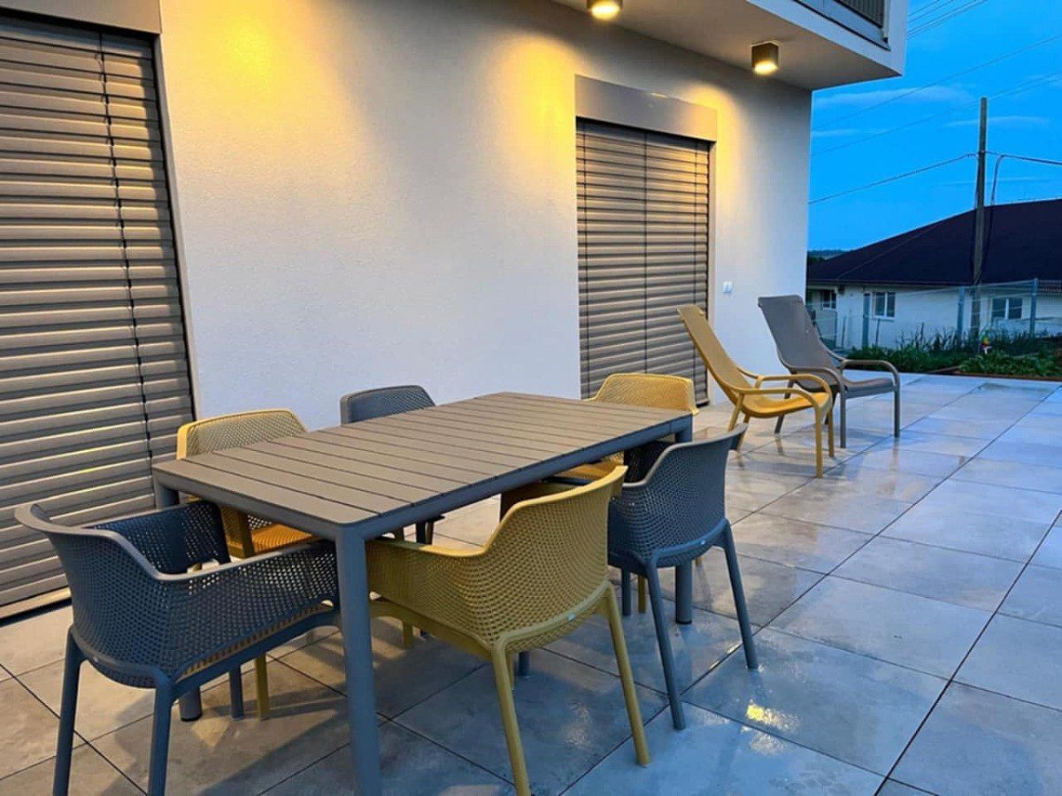 Vybavenie terasy moderného domu stýlovou stolovou súpravou. Zákazník zvolil krásnu kombináciu stoličiek Net vo farbe Tortora a Senape, ktoré elegantne doplňuje stôl Tevere.