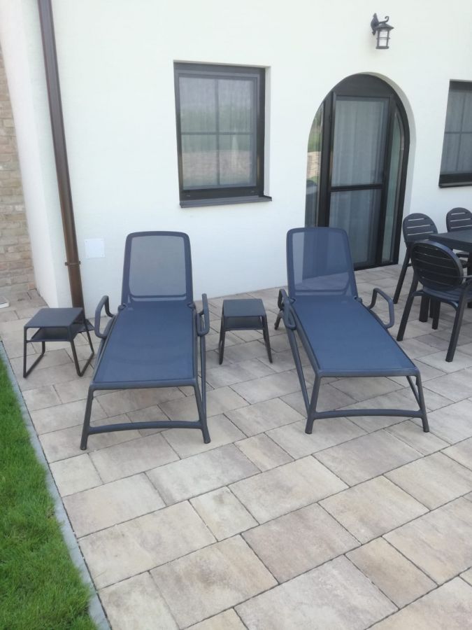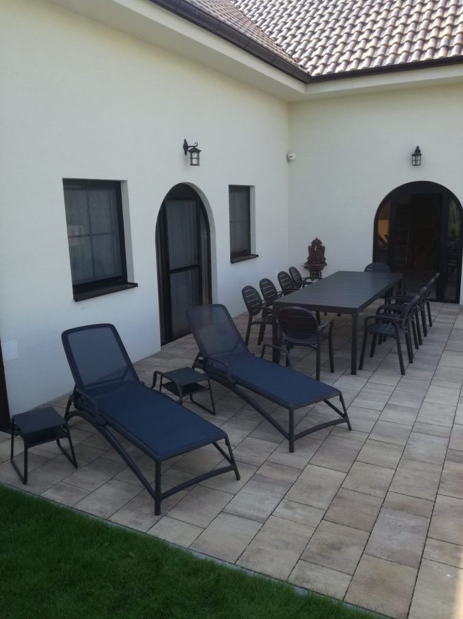 Zařízení terasy rodinného domu stolovou soupravou Rio Palma, která je doplněná o set lehátek Atlantico se stolky Pop. Vše v barvě Antracit.