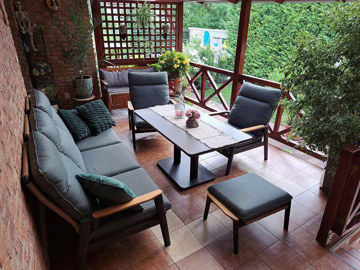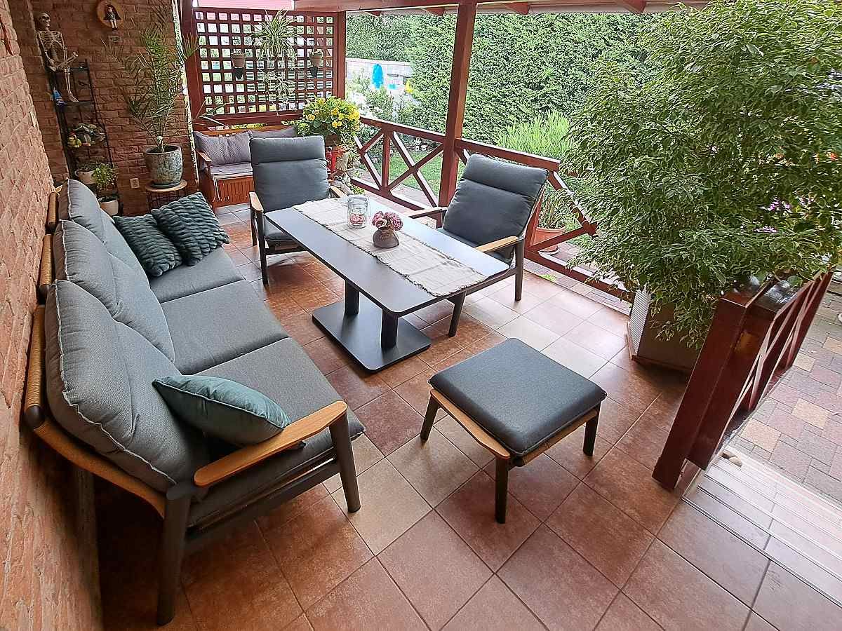 Zařízení terasy rodinného domu pohodlnou sedací soupravou Kokkola. Díky výškově nastavitelnému stolu je Kokkola ideálním propojením sedací a stolové soupravy.
