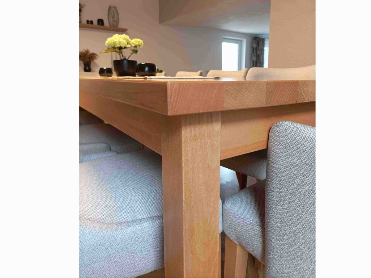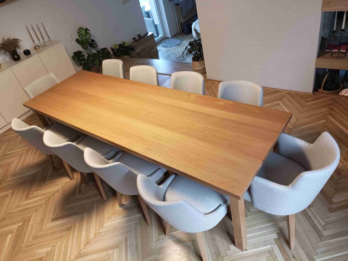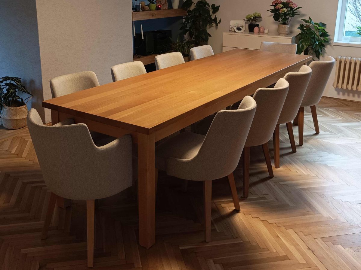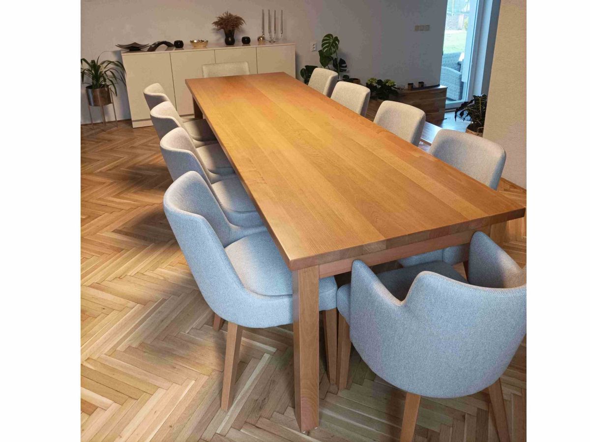 Moderní interiérová stolová sestava s masivním bukovým stolem a křesly Mona v dvou barevných variantách.