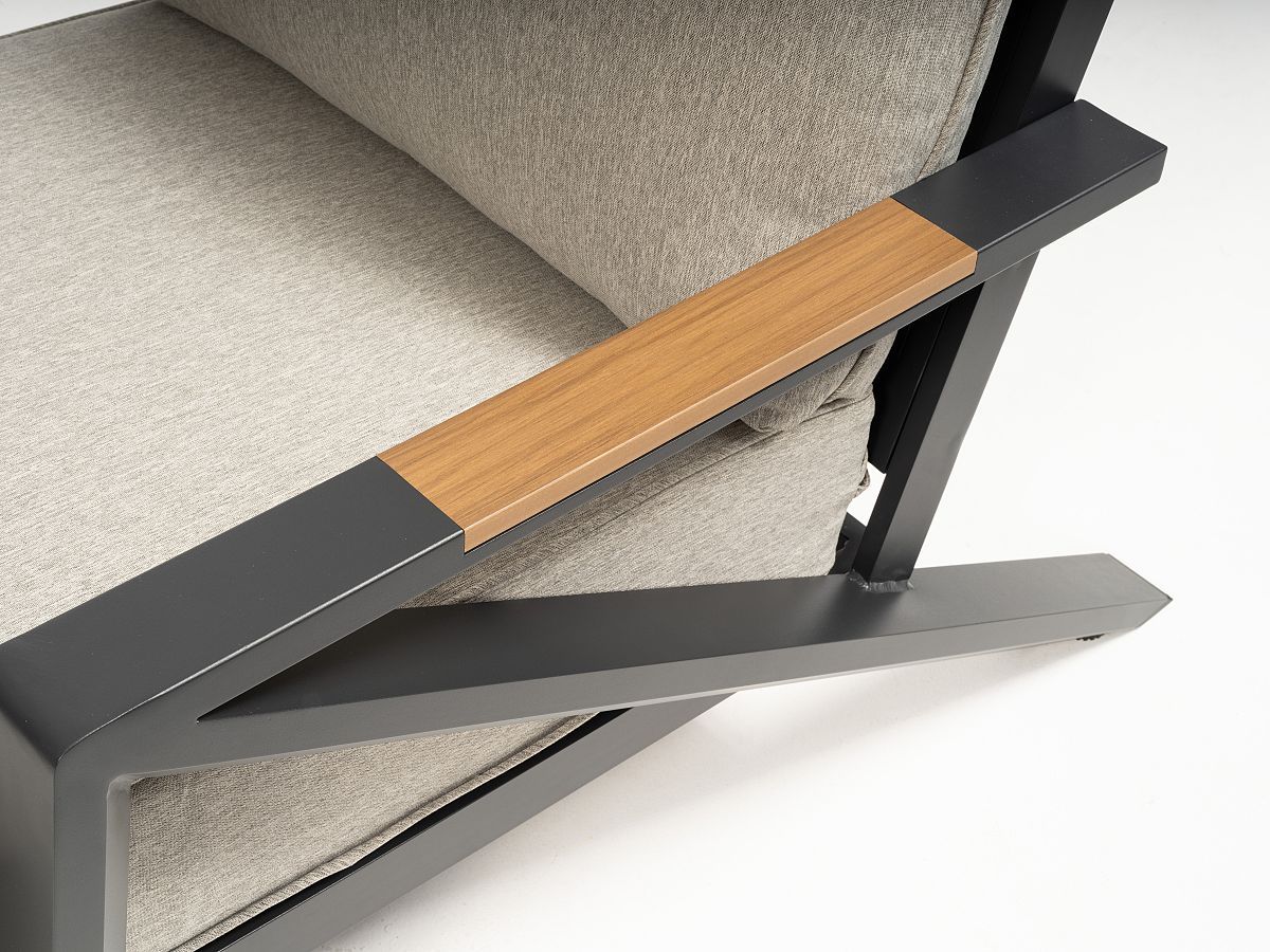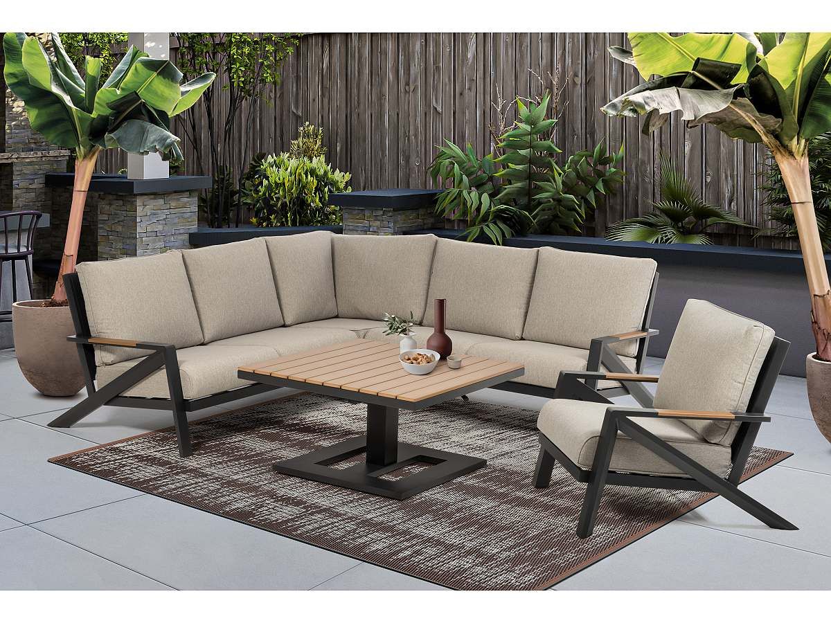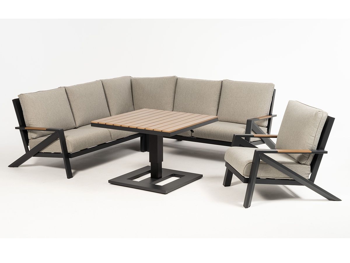 Elegantní zahradní rohová sedací souprava Cagliari je perfektní volbou pro lidi, kteří si rádi vychutnávají čas strávený na terase. Černá hliníková konstrukce zahradní sedací soupravy je doplněná na opěrkách a konferenčním stole o polywoodové (polypropylenové) laťování, které imituje dřevo. Matrace a polštáře jsou světle šedé barvy a jsou odolné vůči povětrnostním vlivům. Stůl je výškově nastavitelný. Ve stejném provedení máme i klasickou sedací soupravu Cagliari, pokud byste chtěli kombinovat sedací a rohové sedací soupravy v HoReCa segmentu.