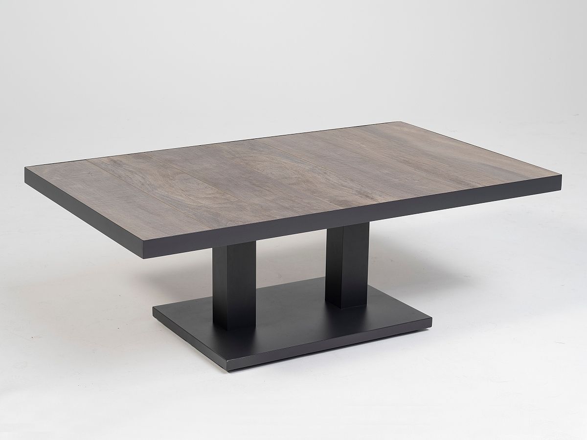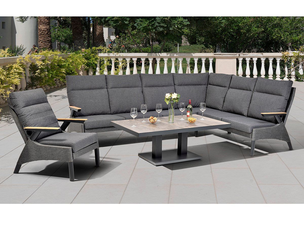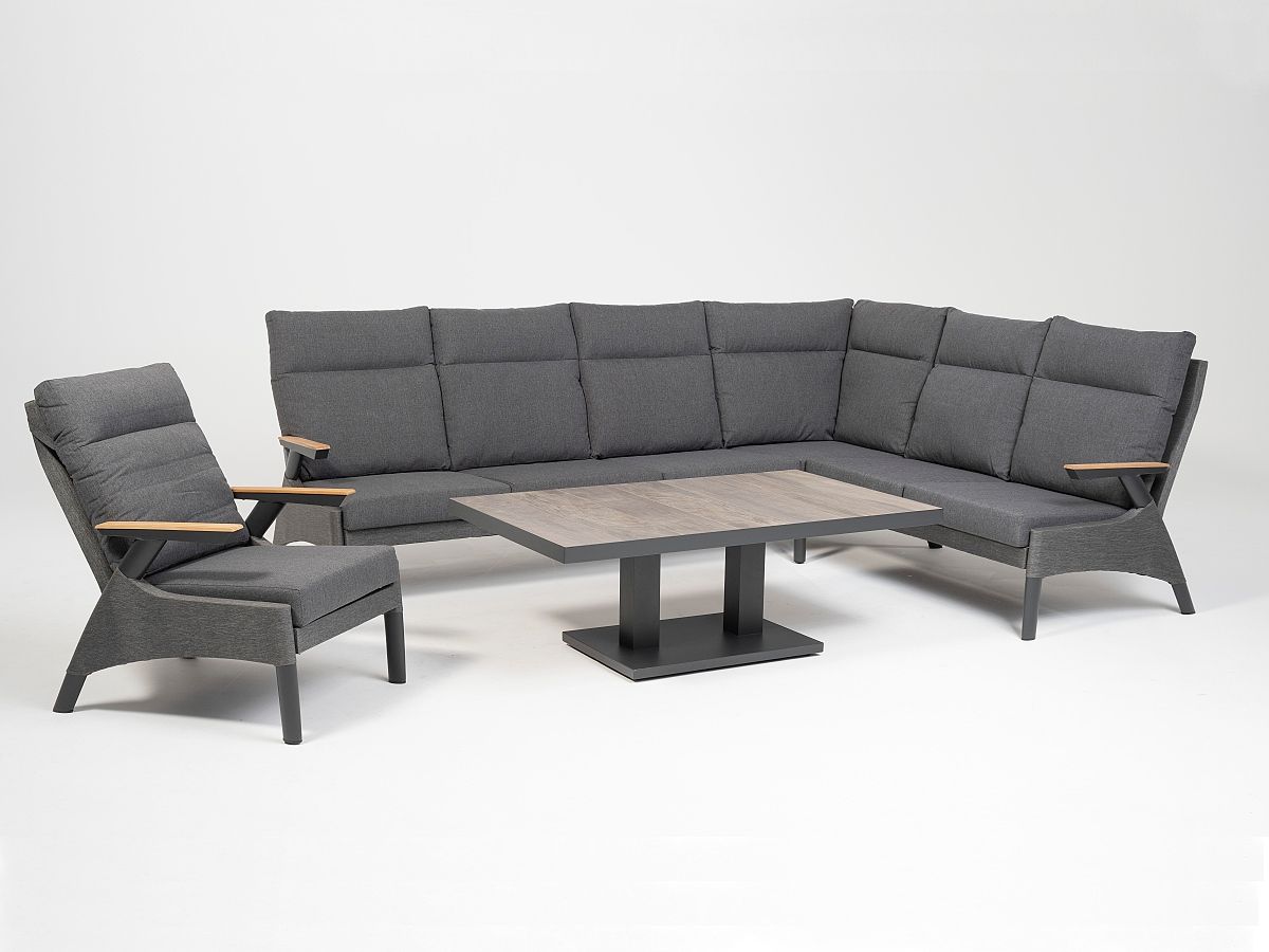 Elegantná a moderná rohová súprava Thassos, ktorá mixom sedacej a stolovej súpravy vďaka výškovo nastaviteľnému stolu. Stôl má hliníkový rám v antracitovej farbe a stolová doska je keramická so vzhľadom bridlicového kameňa. Stôl je výškovo nastavitelný od 52 do 72 cm, takže sa pri zdvihnutom stole môžete najesť. Kreslá Thassos majú tiež hliníkový rám s textilným poťahom, ktorý pôsobí veĺmi elegantna a je zároven pohodlný. Kreslo sa dá jednoducho polohovať vďaka tlačidlu na boku opierky. Vďaka vysokému operadlu bude kreslo veľmi pohodlné aj pre vysokých ľudí.