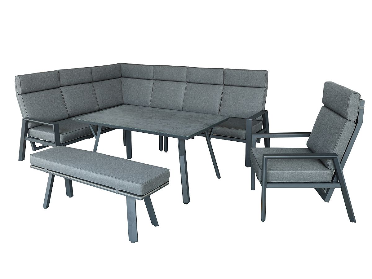 Krásna a praktická rohová stolová súprava Barry bude ideálnou voľbou pre vačšie rodiny, ktoré radi trávia leto na terase. Rohová stolová súprava Barry je natoľko veľkorysá, že sa pohodlne usadí až 10 dospelých ľudí. Konštriukcia všetkých komponentov súpravy je hliníková striekaná práškovou farbou v antracitovej farbe. Podsedáky a opierkové vankúše sú v svetlošedej farbe a sú odolné voči poveternostným vplyvom. Kreslo aj krajná lavica sú polohovatelné. Stolová doska je z tvrdeného skla s ochrannou keramickou vrstvou.