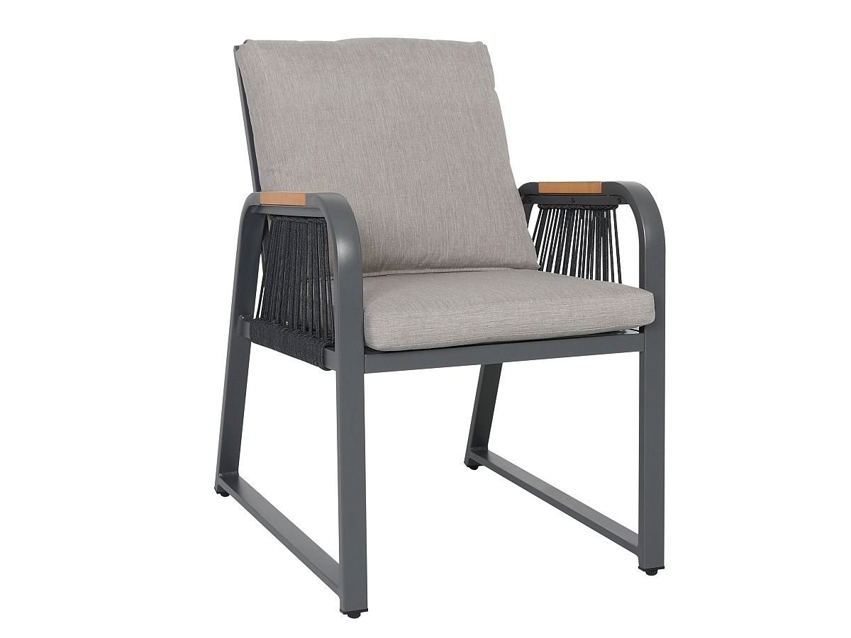 Okúzlujúca a moderná rohová stolová súprava Camilla bude dokonalým miestom na letné posedenia s priateľmi či rodinou. Stôl má hliníkový rám striekaný práškovou farbou v antracitovej farbe a stolová doska má lamely z termodreva. Stolička ma hliníkový rám v rovnakom prevedení ako stôl a je ovinutá čiernymi textilnými šnúrami, ktoré sú odolné voči poveternostným vplyvom. Operadlo na stoličkách aj rohovej lavici sú tiež z termodreva. Rohovú lavicu si môžete nastaviť buď aby bola dlhšia strana ľavá alebo pravá, takže táto súprava je perfektne variabilná. Podsedáky aj opierkové vankúše sú odolné voči poveternostným vplyvom.