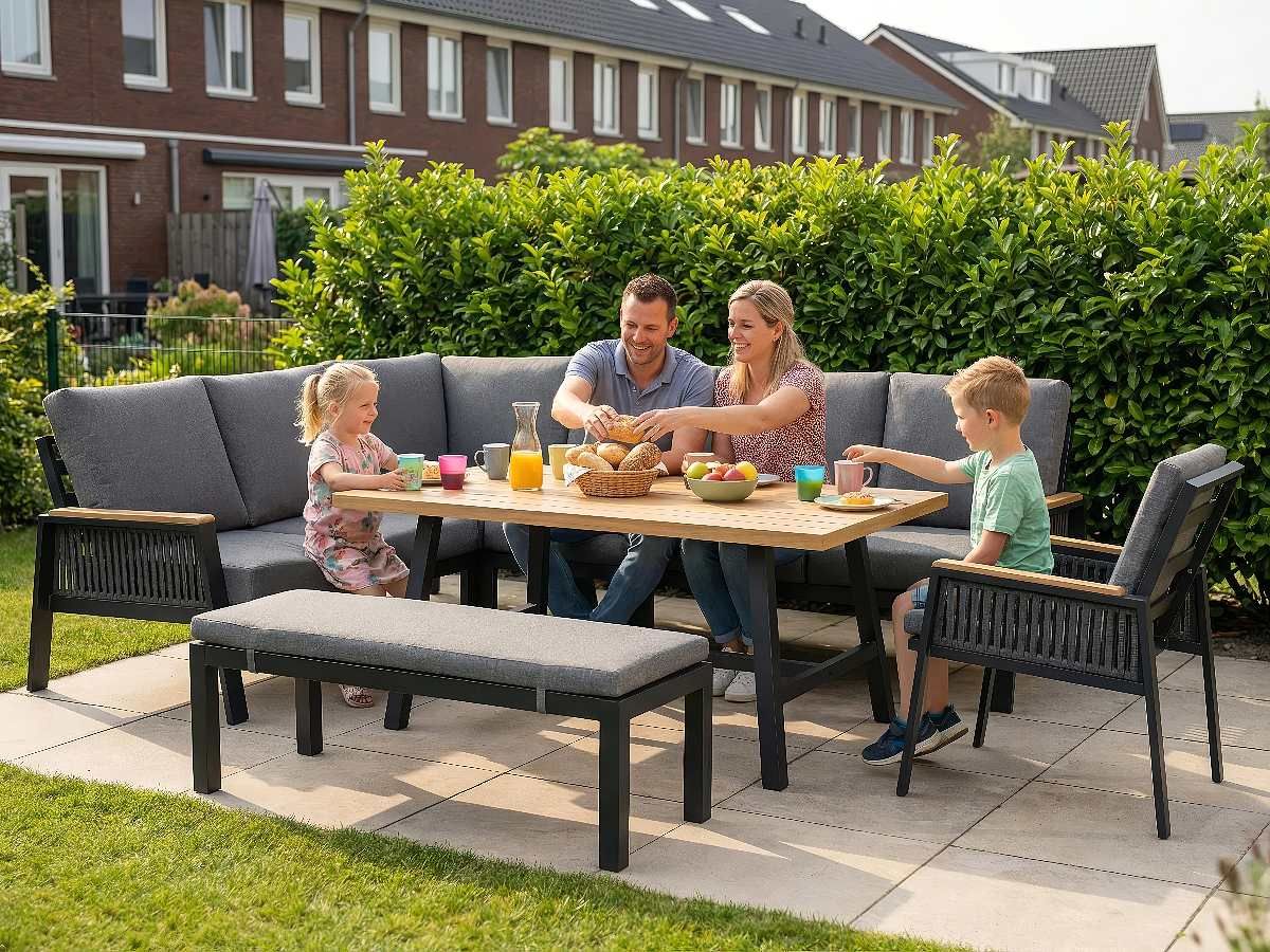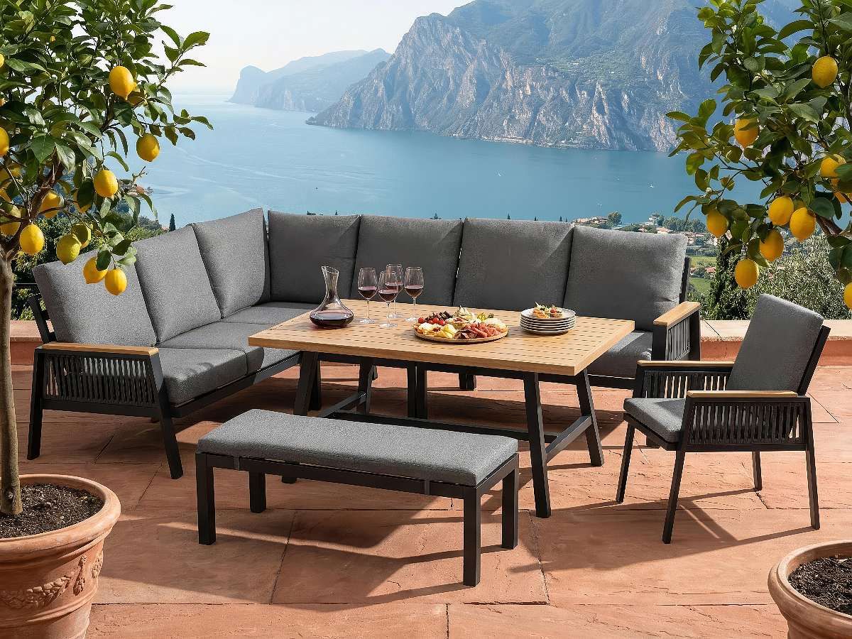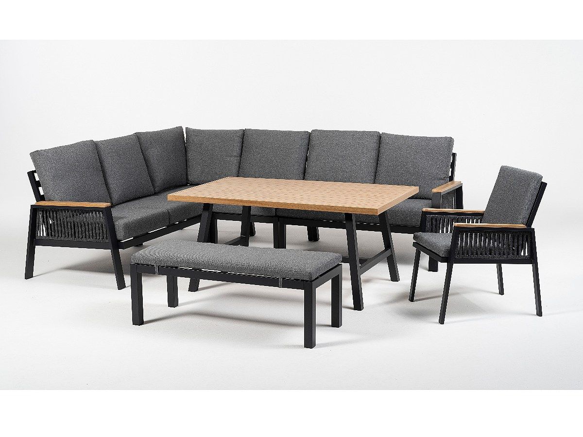 Rohová stolová súprava Fiore je stelesnením modernej adaptability a štýlu, navrhnutá pre dynamické vonkajšie priestory, ako sú terasy, záhrady alebo moderné strešné terasy (rooftopy). Vďaka svojej variabilite a premyslenej kombinácii rohovej lavice, samostatného kresla a ďalšej lavice umožňuje súprava Fiore vytvoriť ideálne sedenie presne podľa potrieb vášho priestoru. Kontrast čierneho hliníkového rámu s tmavosivým výpletom a teplo pôsobiacou doskou stola v dekore dreva dodáva súprave výrazný, no pritom útulný charakter.