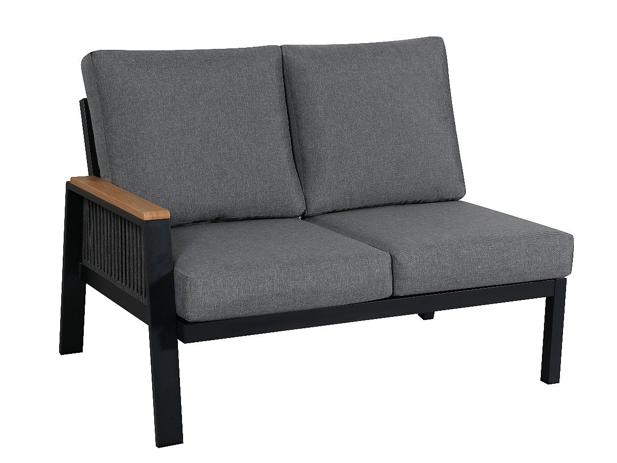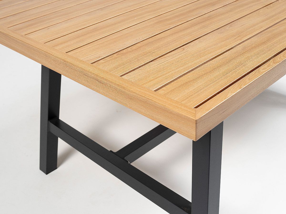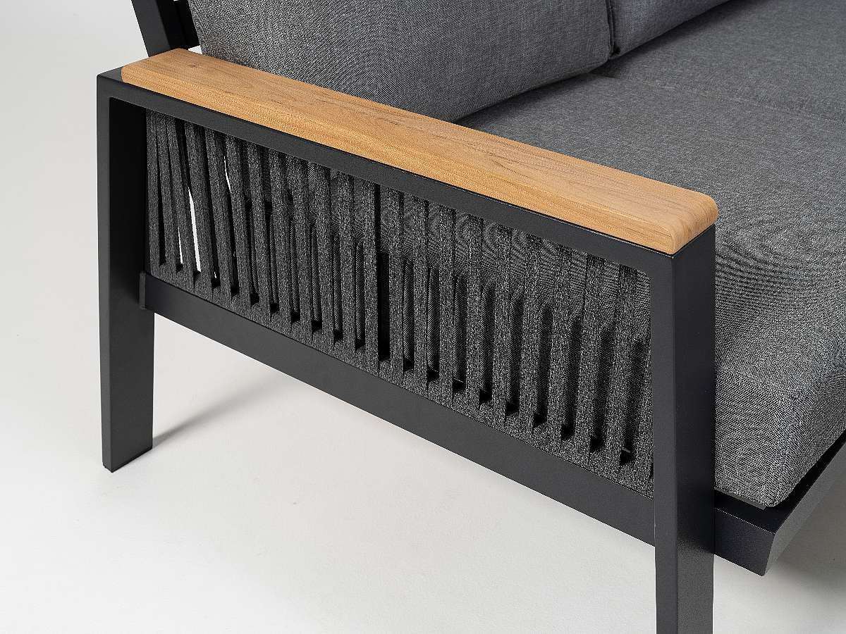 Rohová stolová súprava Fiore je stelesnením modernej adaptability a štýlu, navrhnutá pre dynamické vonkajšie priestory, ako sú terasy, záhrady alebo moderné strešné terasy (rooftopy). Vďaka svojej variabilite a premyslenej kombinácii rohovej lavice, samostatného kresla a ďalšej lavice umožňuje súprava Fiore vytvoriť ideálne sedenie presne podľa potrieb vášho priestoru. Kontrast čierneho hliníkového rámu s tmavosivým výpletom a teplo pôsobiacou doskou stola v dekore dreva dodáva súprave výrazný, no pritom útulný charakter.