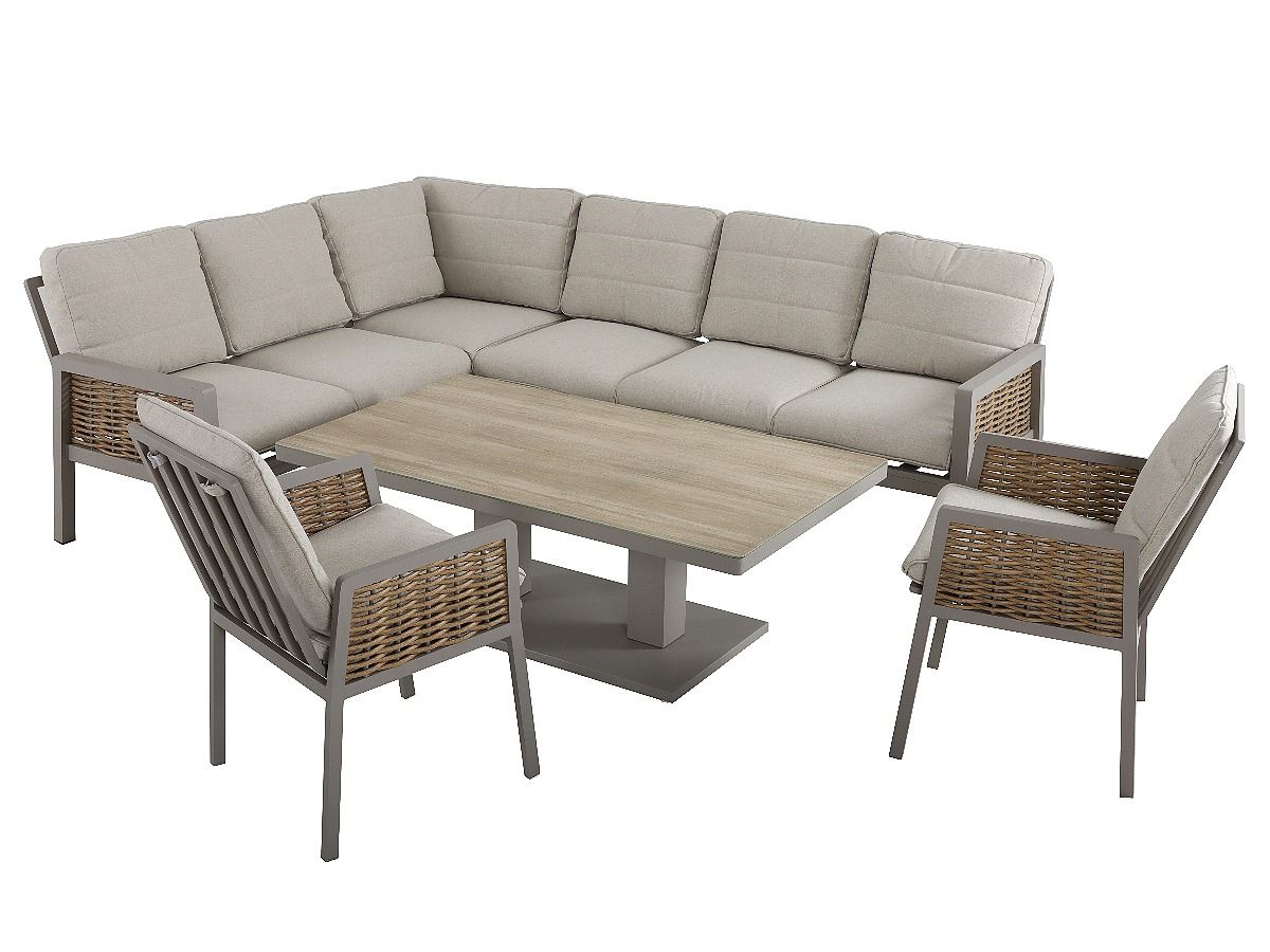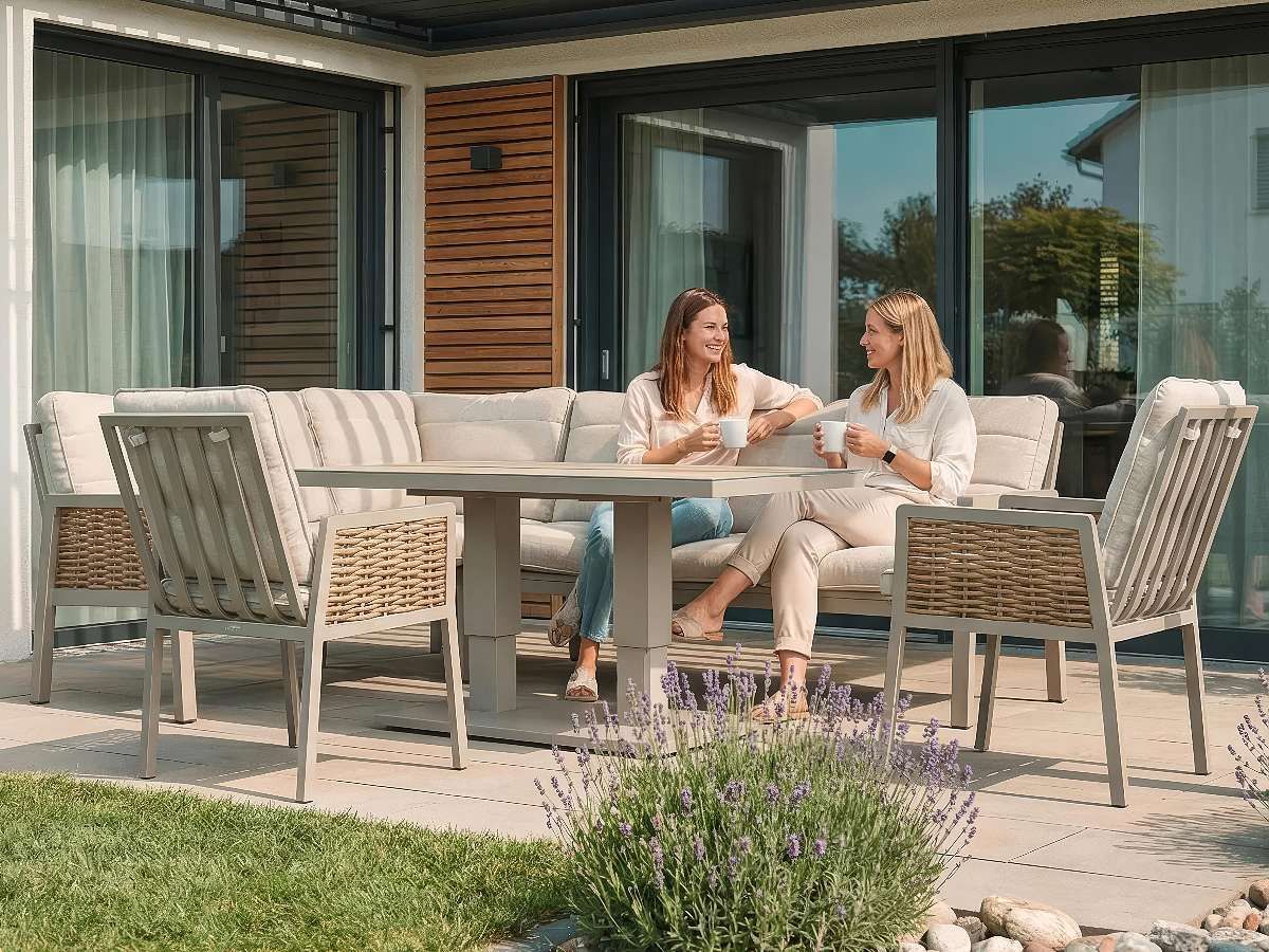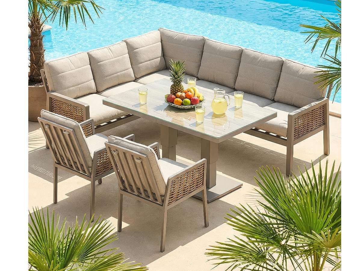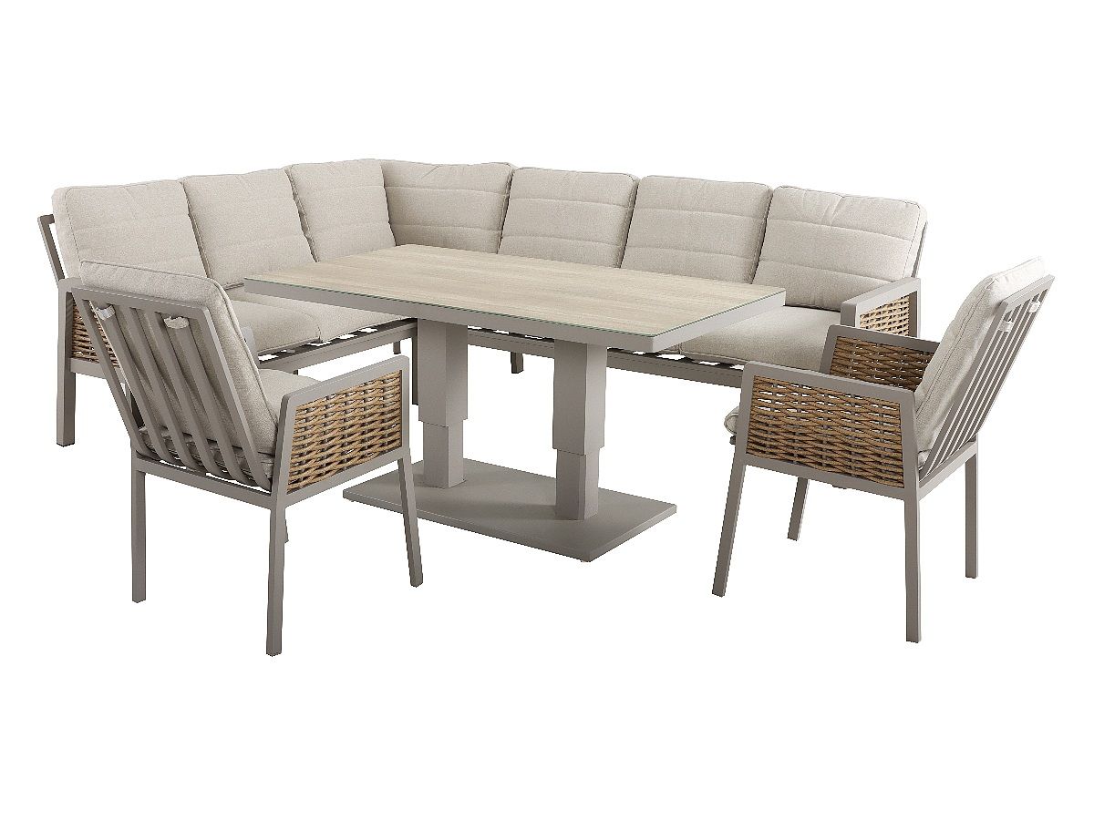 Flexibilita: Variabilná rohová lavica a stôl nastaviteľný od lounge až po jedálenskú výšku.