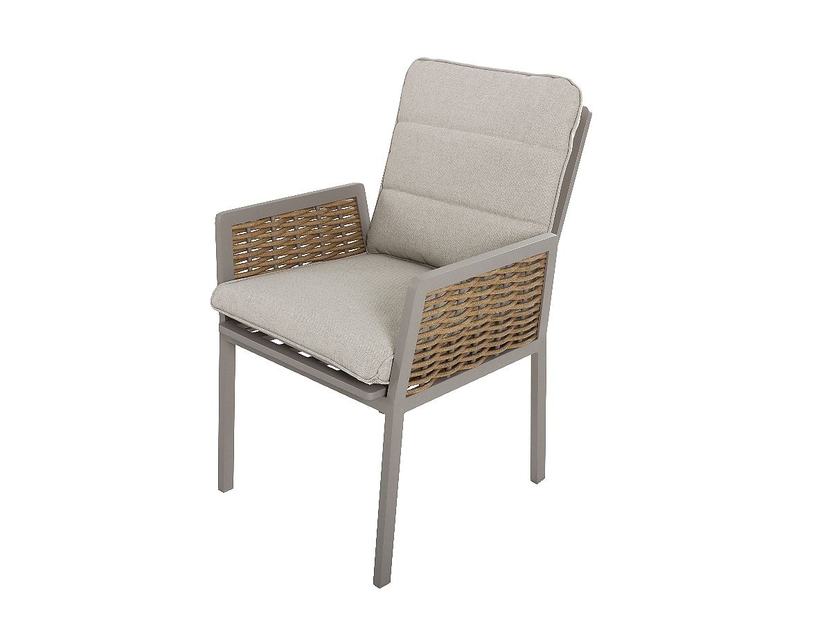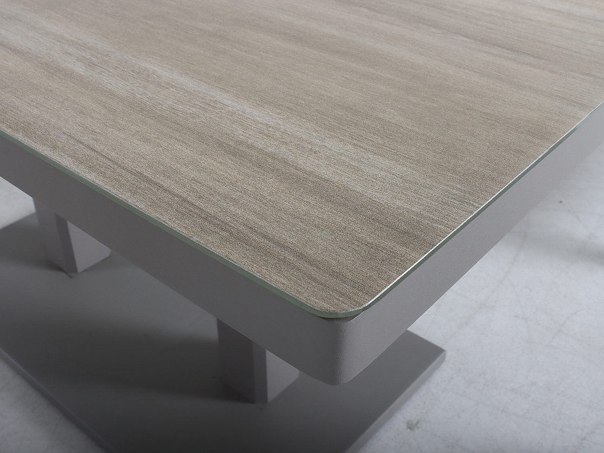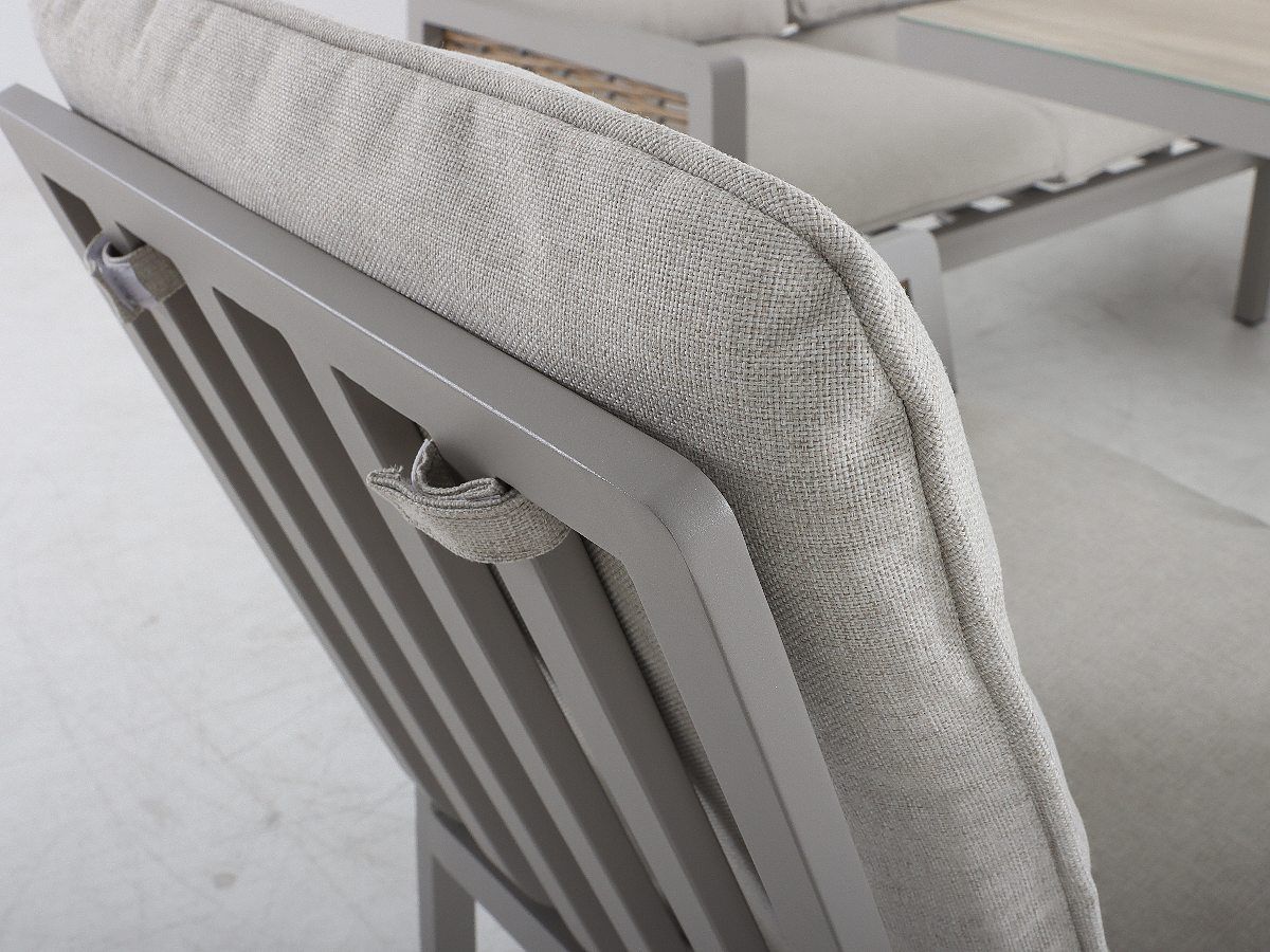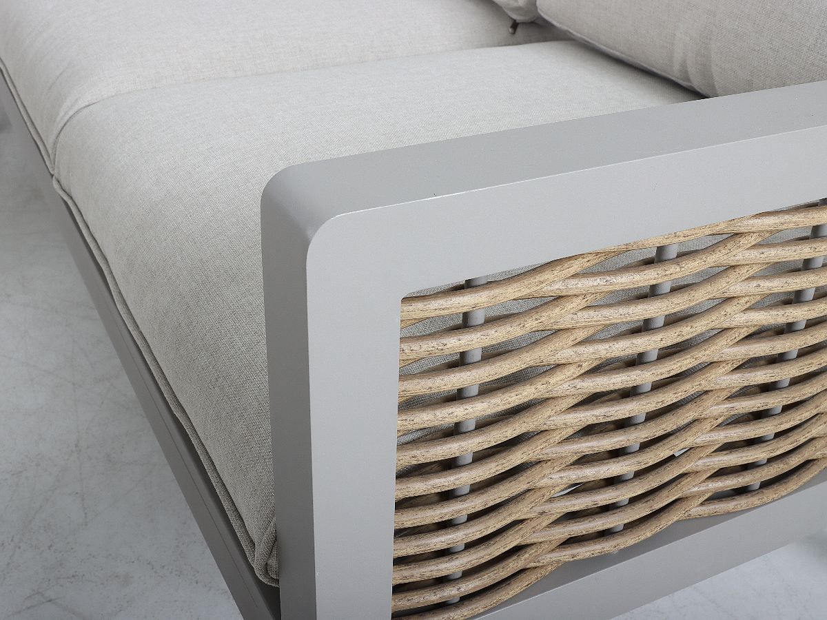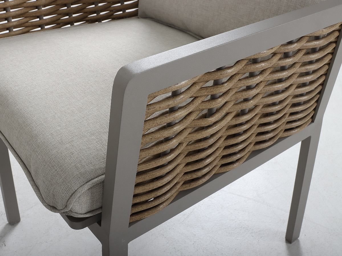 Rohová stolová súprava Hellas v sebe spája hrejivosť prírodných odtieňov s modernou funkčnosťou, vďaka čomu vytvára na každej terase harmonický a pozývajúci priestor. Jej charakteristickým prvkom je kontrast medzi konštrukciou v odtieni „greige“ a výpletom v medovej farbe, ktorý priestoru dodáva jemne rustikálny, no stále vysoko moderný vzhľad. Keramická stolová doska v dekore dreva nielenže skvele dotvára celkový dizajn, ale je aj vysoko odolná voči vonkajším vplyvom. Vďaka flexibilnej rohovej lavici a výškovo nastaviteľnému stolu sa súprava Hellas okamžite prispôsobí akémukoľvek spoločenskému podujatiu – od neformálneho popoludňajšieho posedenia pri káve až po bohatú letnú večeru.