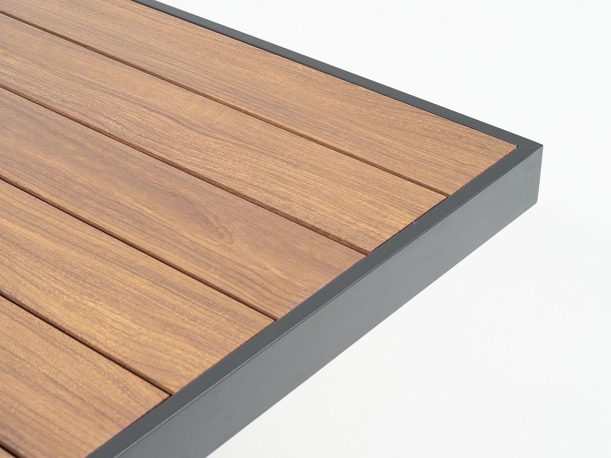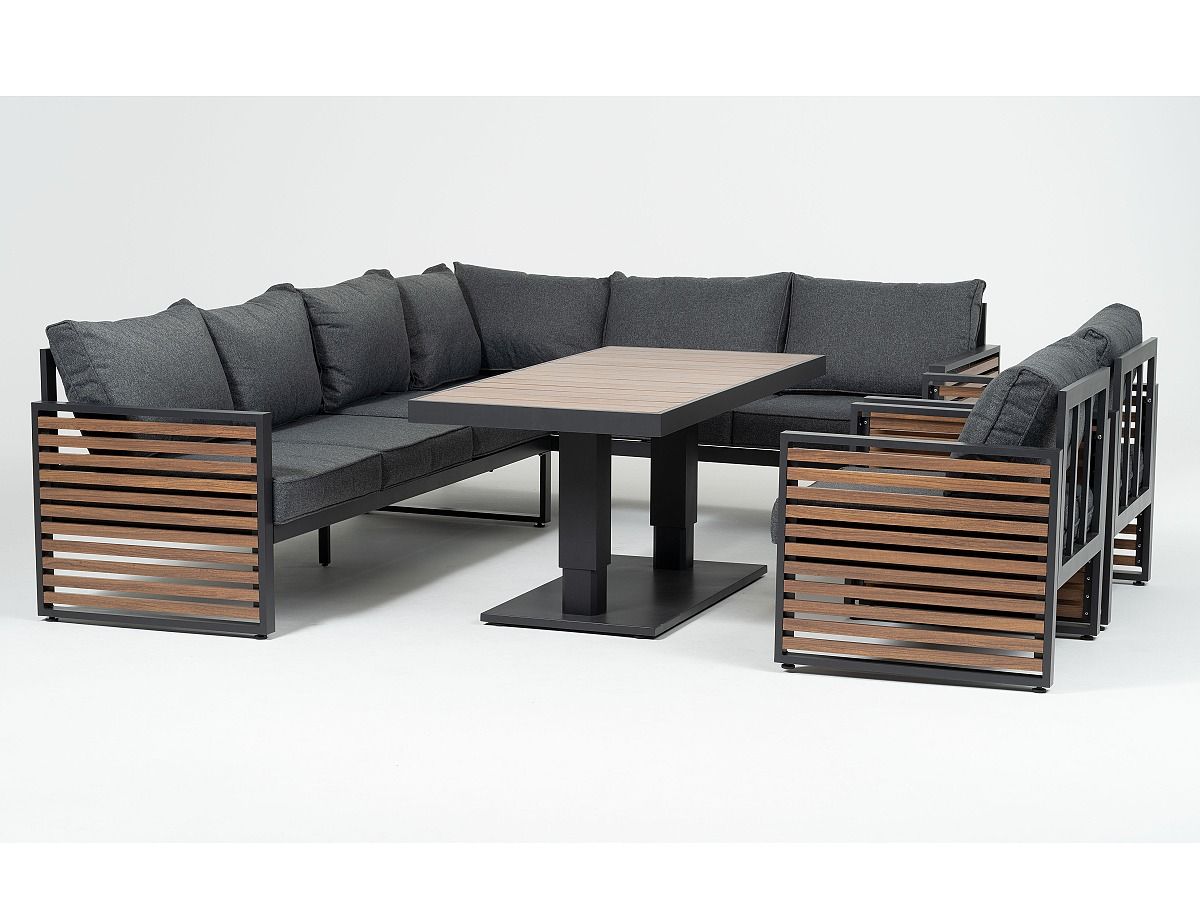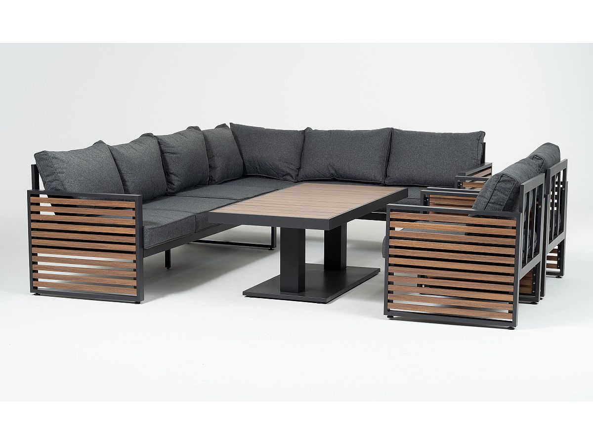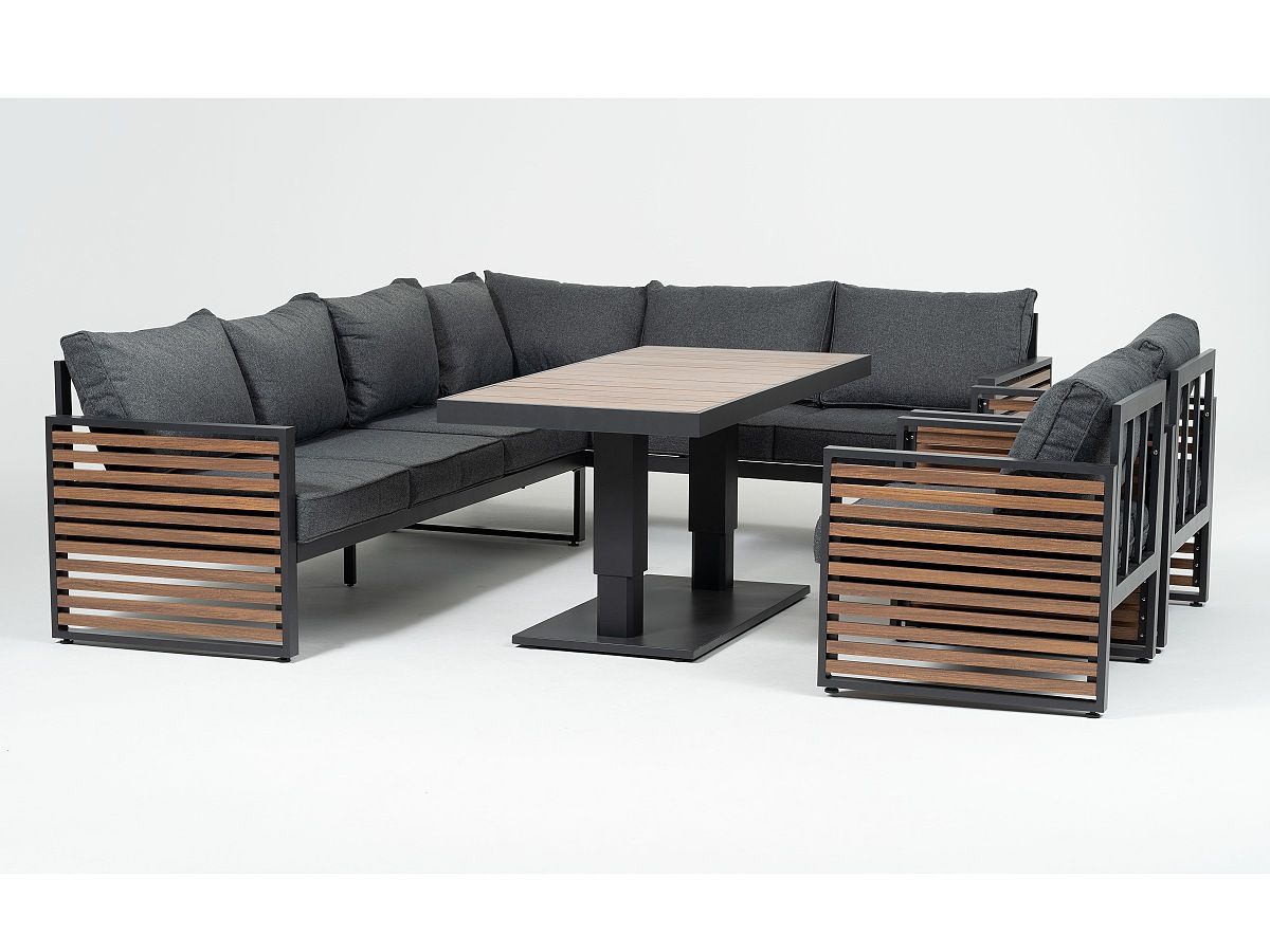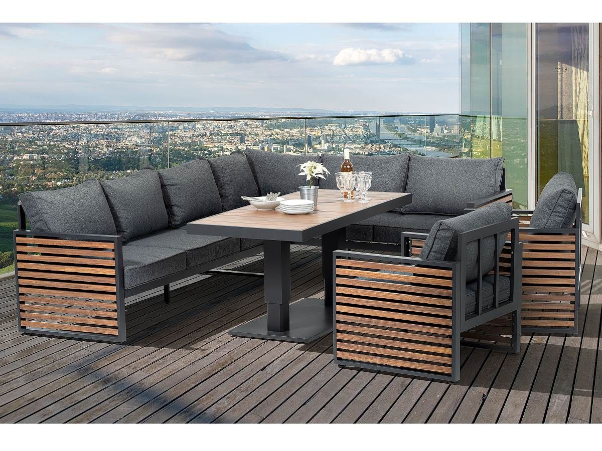 Elegantní moderní rohová stolová sestava Lina Corner je hybridem mezi sedací a stolovou soupravou. Je ideální volbou, pokud chcete spojit pohodlí sedací a praktičnost stolové soupravy k dokonalému vychutnání si jídla. Křeslá, rohová sedačka i stůl mají hliníkovou konstrukci stříkanou práškovou antracitovou barvou. Laťování na bocích křesel a rohové sedačky je z hliníkových lamel v dřevěném dekoru. Stůl je výškově nastavitelný pomocí plynové pružiny. Stůl má stolovou desku z hliníkových lamel v dřevěném dekoru. Rohová stolová sestava Lina Corner má možnost sestavení na pravou i levou stranu. Podsedáky i polštáře jsou z kvalitní textilní tkaniny tmavě šedé barvy a jsou odolné vůči povětrnostním vlivům.