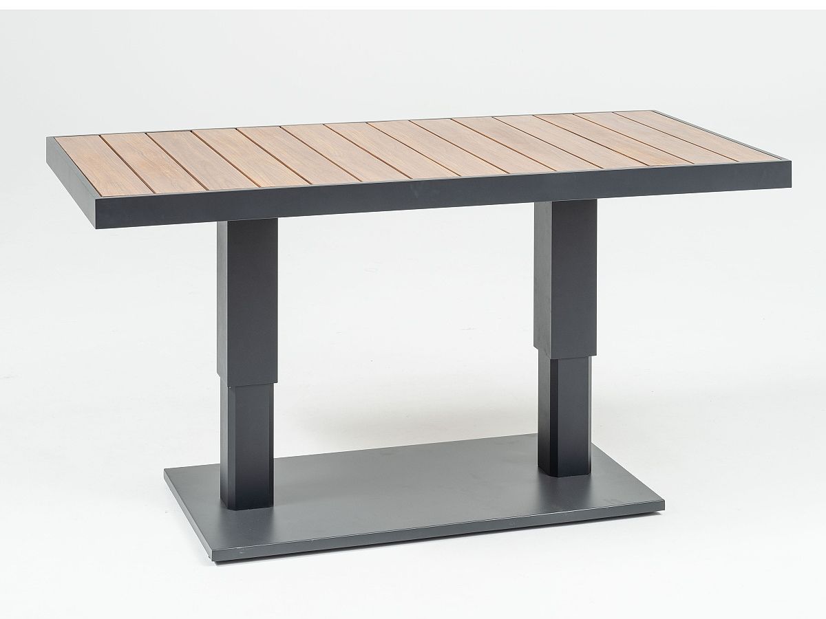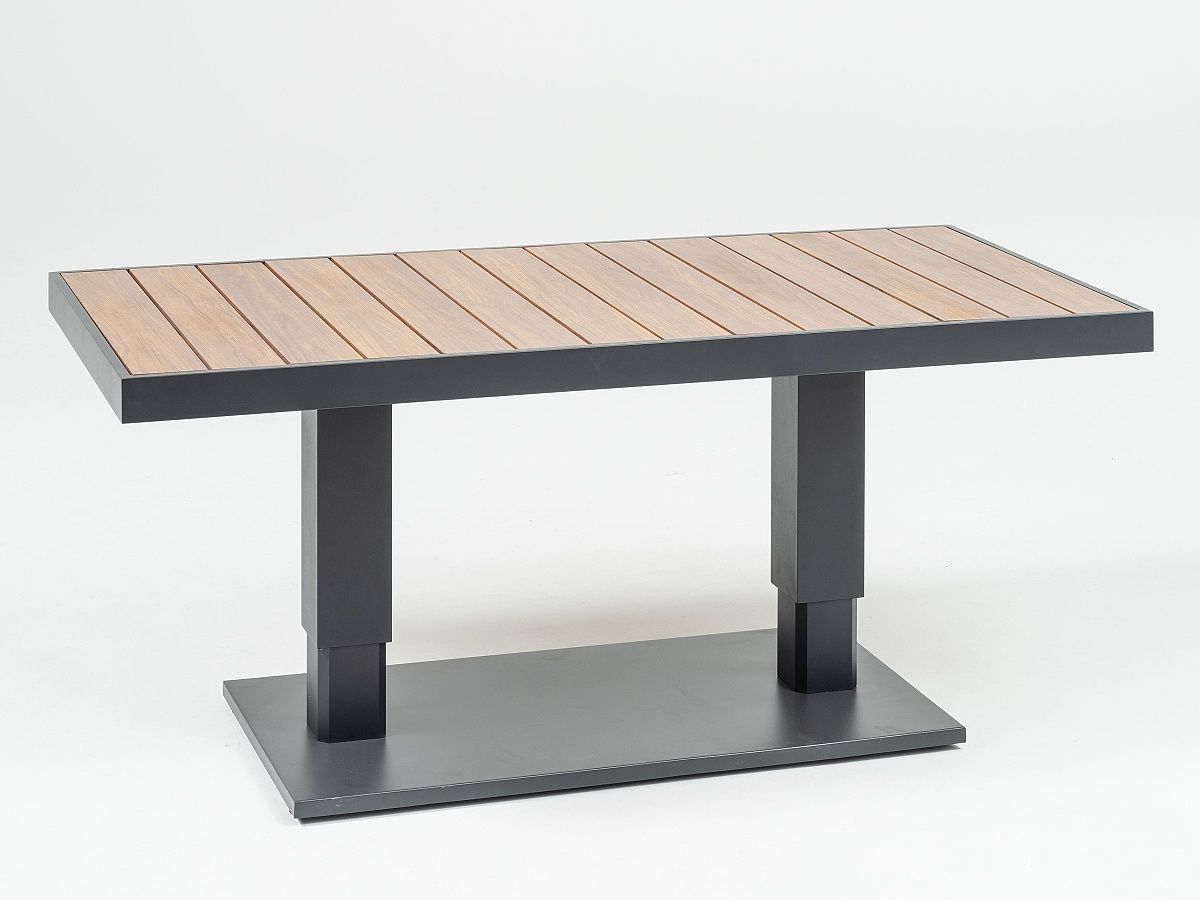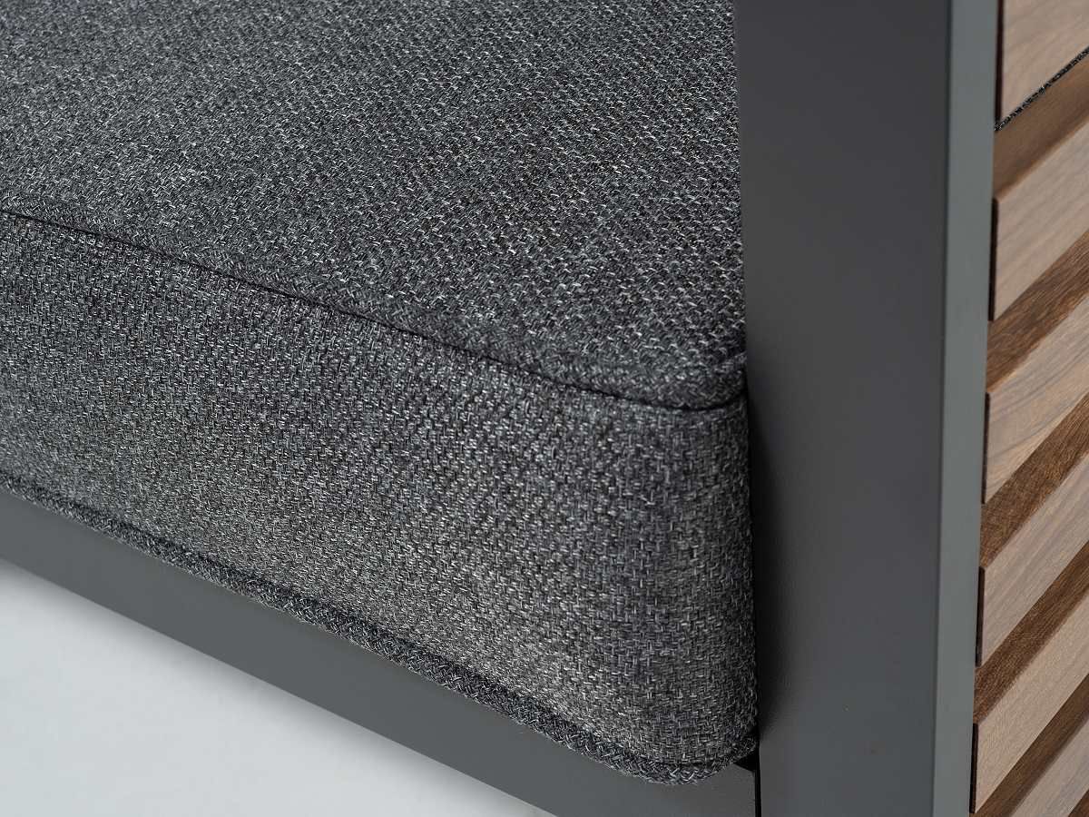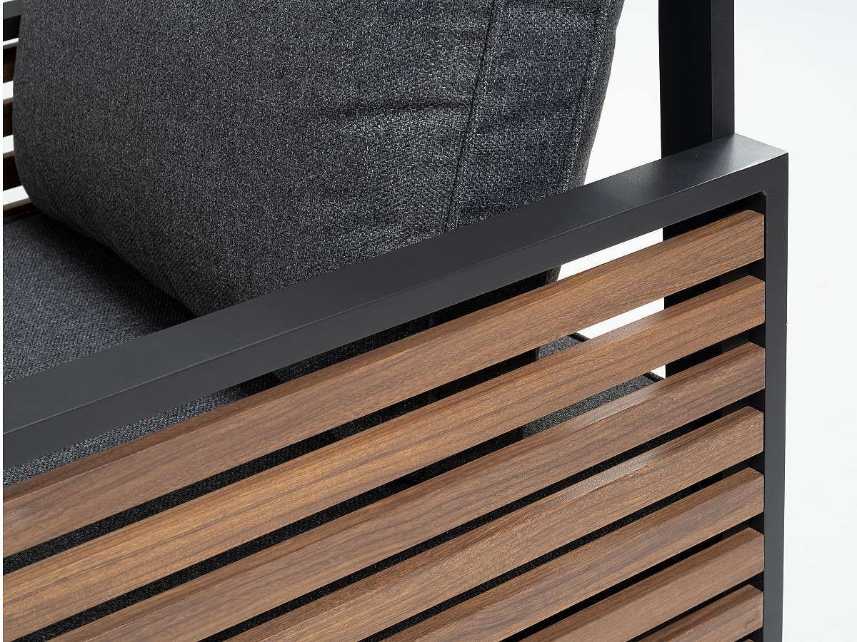 Elegantní moderní rohová stolová sestava Lina Corner je hybridem mezi sedací a stolovou soupravou. Je ideální volbou, pokud chcete spojit pohodlí sedací a praktičnost stolové soupravy k dokonalému vychutnání si jídla. Křeslá, rohová sedačka i stůl mají hliníkovou konstrukci stříkanou práškovou antracitovou barvou. Laťování na bocích křesel a rohové sedačky je z hliníkových lamel v dřevěném dekoru. Stůl je výškově nastavitelný pomocí plynové pružiny. Stůl má stolovou desku z hliníkových lamel v dřevěném dekoru. Rohová stolová sestava Lina Corner má možnost sestavení na pravou i levou stranu. Podsedáky i polštáře jsou z kvalitní textilní tkaniny tmavě šedé barvy a jsou odolné vůči povětrnostním vlivům.