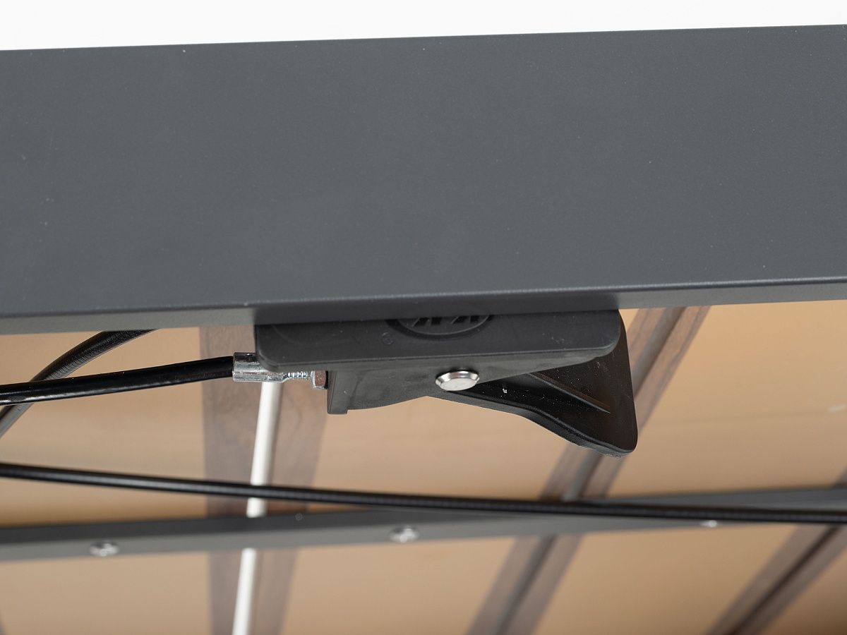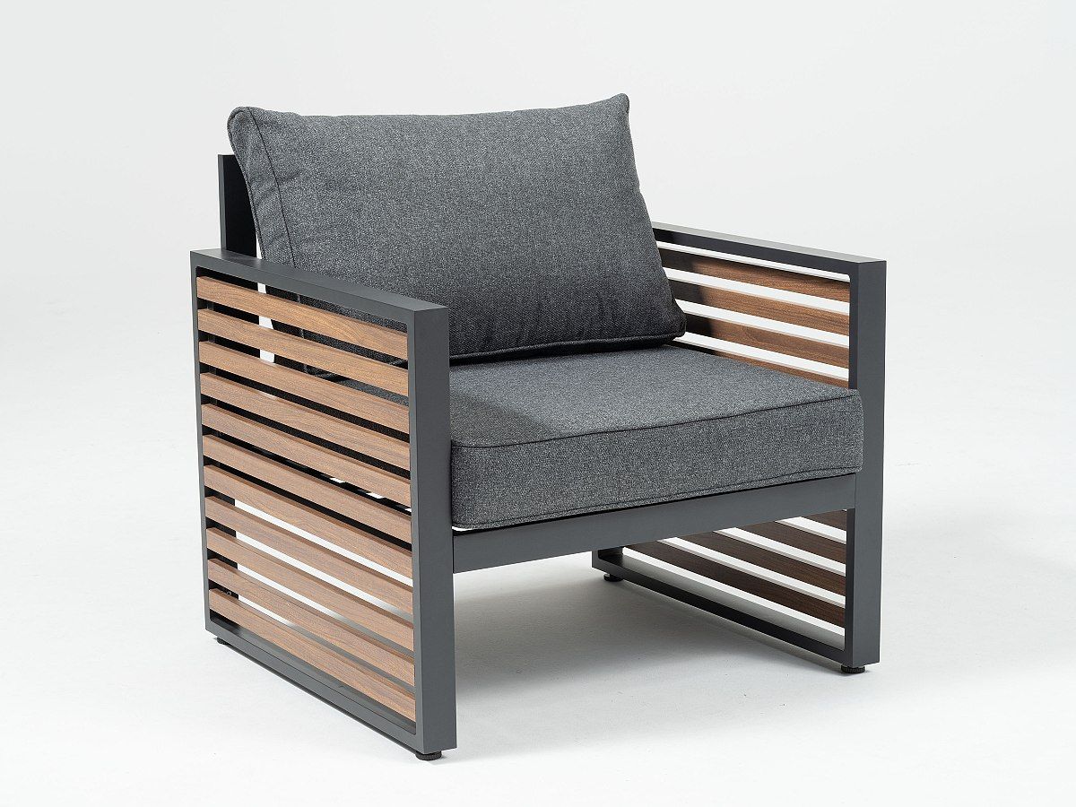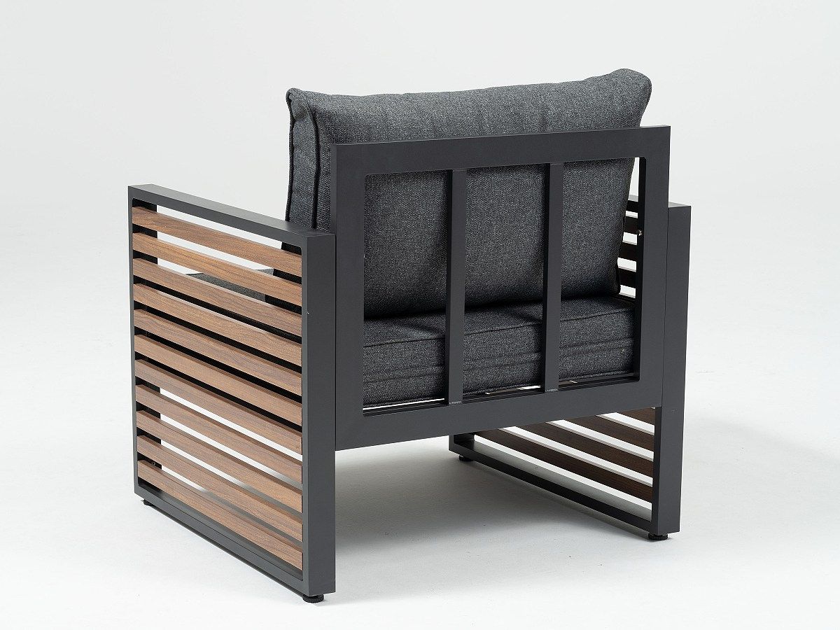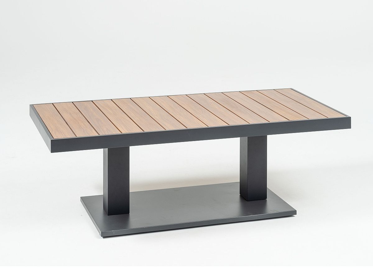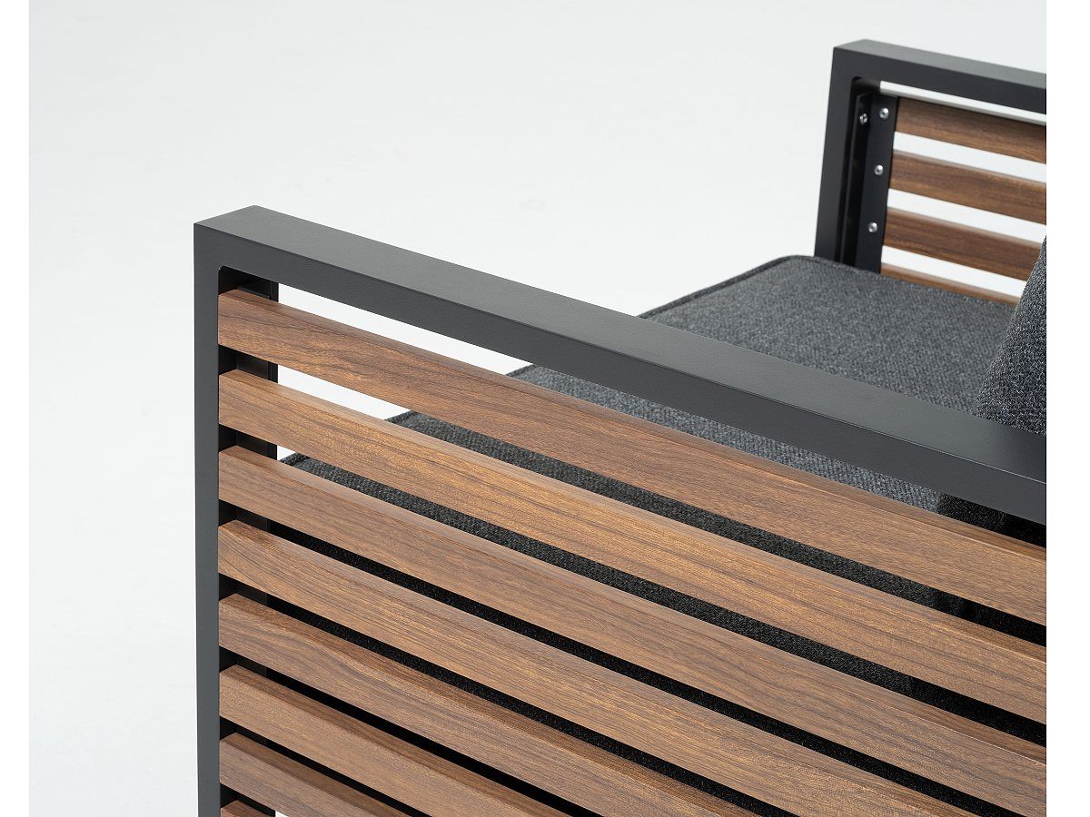 Elegantní moderní rohová stolová sestava Lina Corner je hybridem mezi sedací a stolovou soupravou. Je ideální volbou, pokud chcete spojit pohodlí sedací a praktičnost stolové soupravy k dokonalému vychutnání si jídla. Křeslá, rohová sedačka i stůl mají hliníkovou konstrukci stříkanou práškovou antracitovou barvou. Laťování na bocích křesel a rohové sedačky je z hliníkových lamel v dřevěném dekoru. Stůl je výškově nastavitelný pomocí plynové pružiny. Stůl má stolovou desku z hliníkových lamel v dřevěném dekoru. Rohová stolová sestava Lina Corner má možnost sestavení na pravou i levou stranu. Podsedáky i polštáře jsou z kvalitní textilní tkaniny tmavě šedé barvy a jsou odolné vůči povětrnostním vlivům.