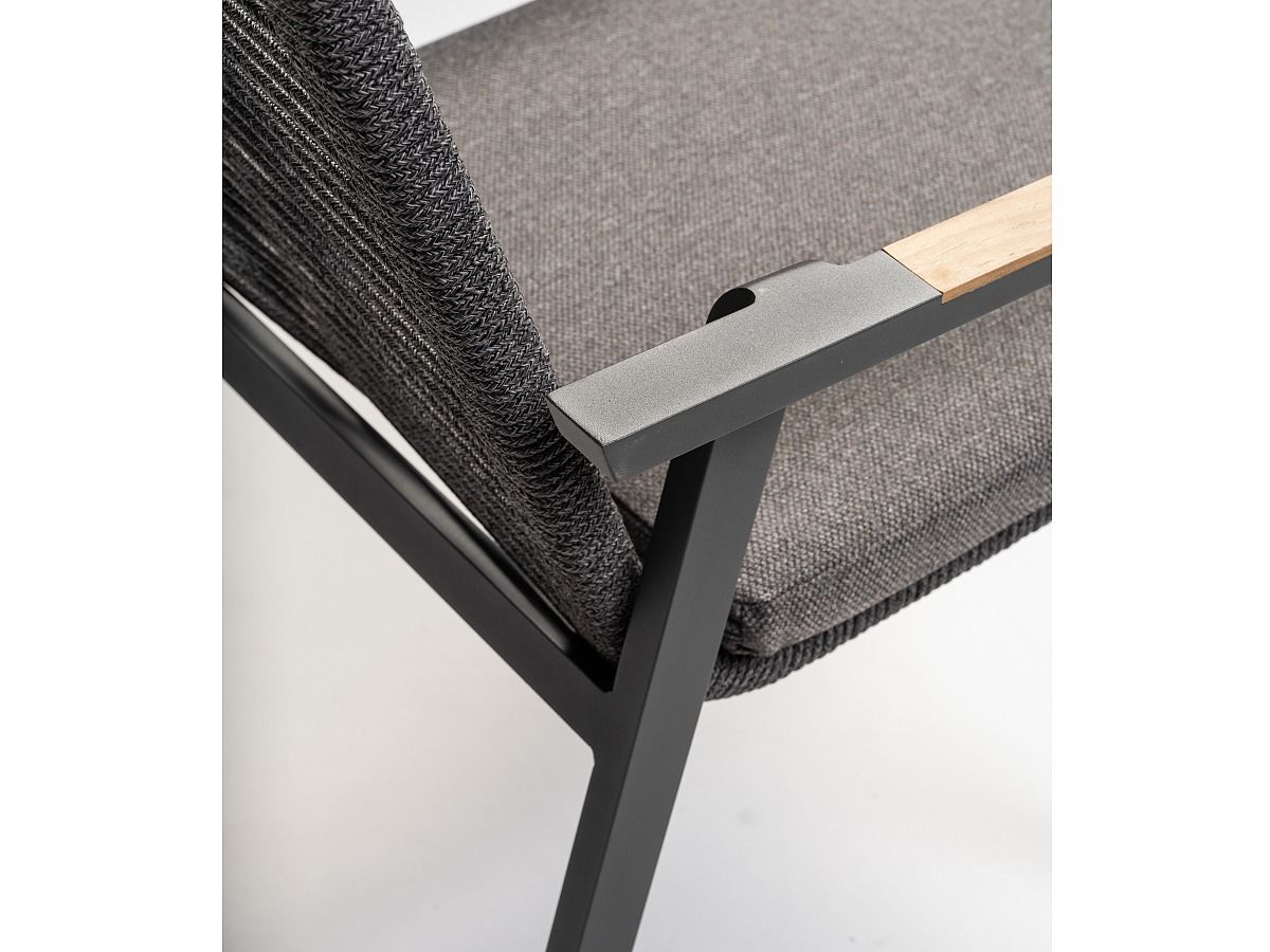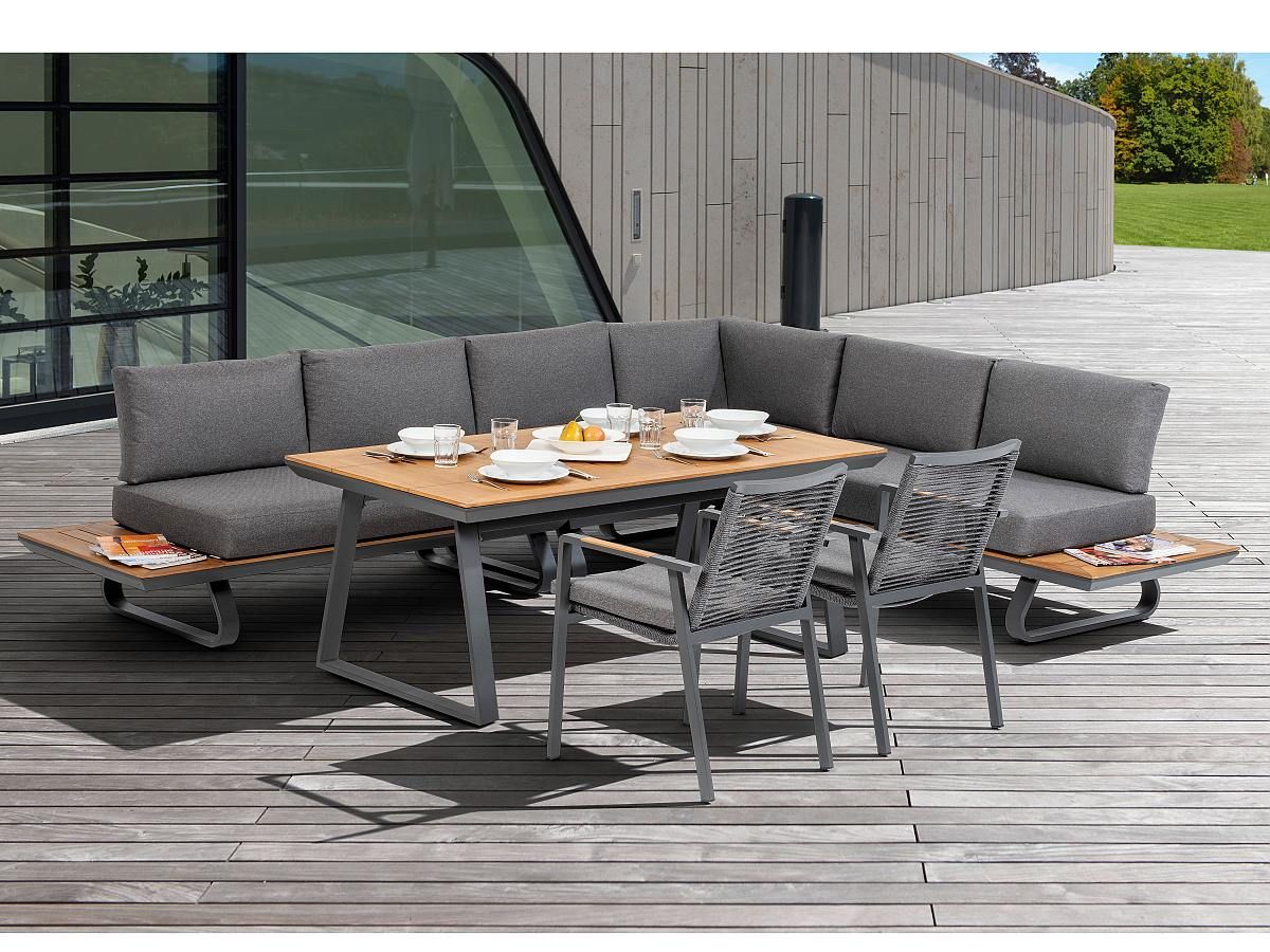 Elegantní moderní rohová stolová sestava Woody Corner je hybridem mezi sedací a stolovou soupravou. Je ideální volbou, pokud chcete spojit pohodlí sedací soupravy a praktičnost stolové soupravy. Židle, rohová sedačka i stůl mají hliníkovou konstrukci stříkanou práškovou antracitovou barvou. Židle jsou ručně ovinuté rychleschnoucími textilními šnůrami šedé barvy. Stolová deska je z naolejovaného borovicového dřeva. Podsedáky i polštáře jsou z kvalitní textilní tkaniny tmavě šedé barvy a jsou odolné vůči povětrnostním vlivům. Upozonění: změna v designu noh i stolu a lavice