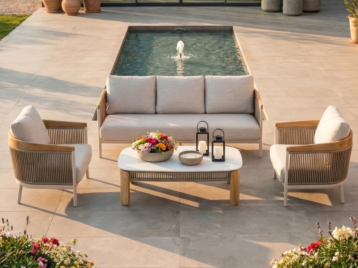 Kvalita a udržateľnosť: Použitie FSC certifikovaného teakového dreva a odolných exteriérových tkanín zabezpečuje, že nábytok si zachová svoj reprezentatívny vzhľad po mnoho sezón.