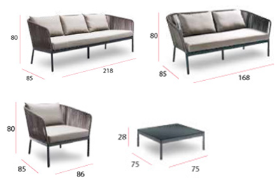Elegantní a stylová zahradní sedací suprava Bergen je typickým příkladem toho, jakým směrem se momentálně posouvá design zahradních sedacích souprav. Často používaný umělý ratan sa začíná nahrazovat syntetickými lany, která dodávají sedacím soupravám nový, elegantnější rozměr. Zahradní sedací souprava Bergen má hliníkovou konstrukci, která je ovinutá už zmíněným syntetickým lanem. Pohodlné podsedáky jsou ze 100% polyesterové látky, jsou voděodolné a snímatelné. Stolek má také hliníkovou konstrukci, stolová deska může být z tvrzeného skla nebo 12mm HPL Compact.