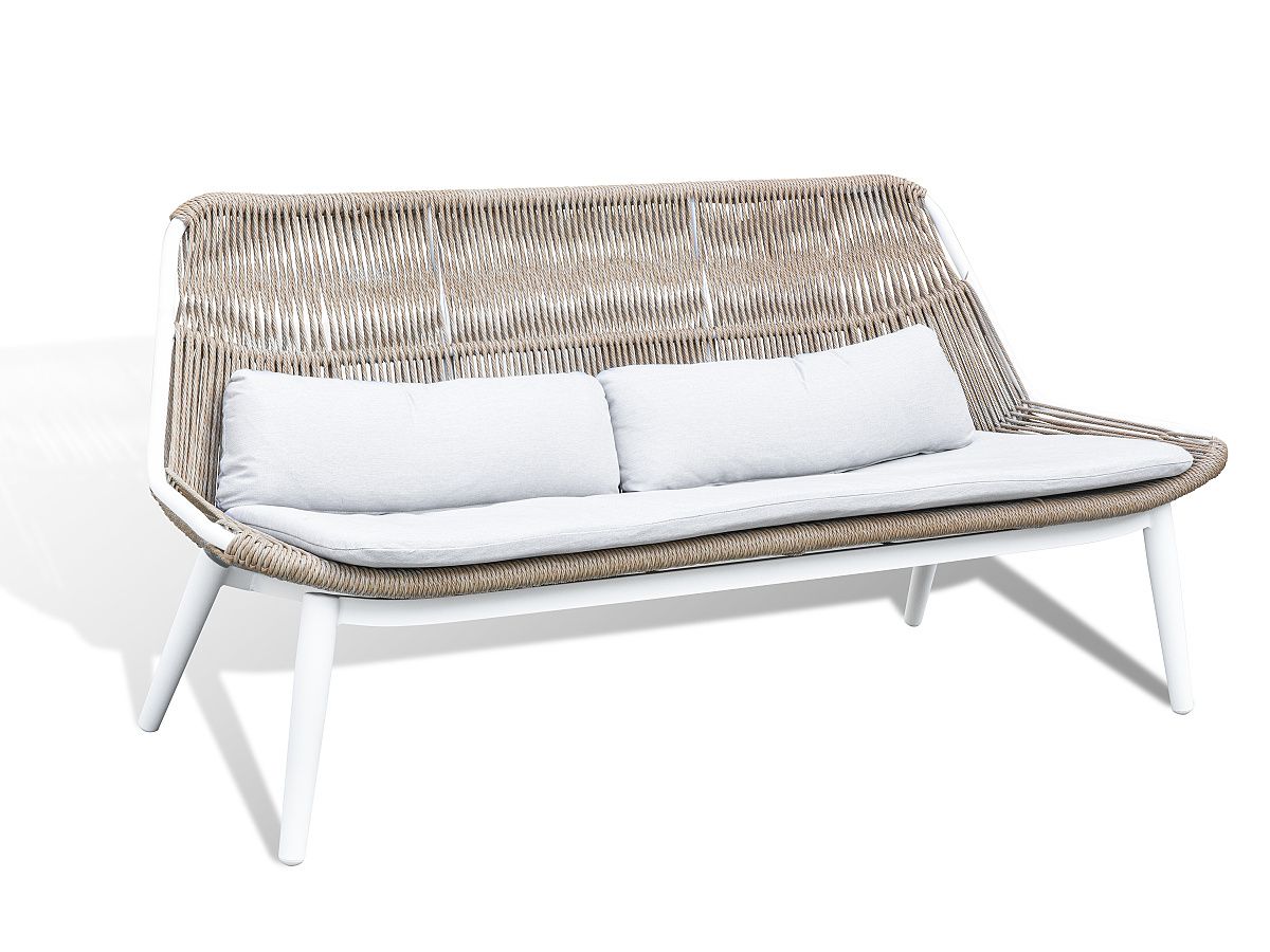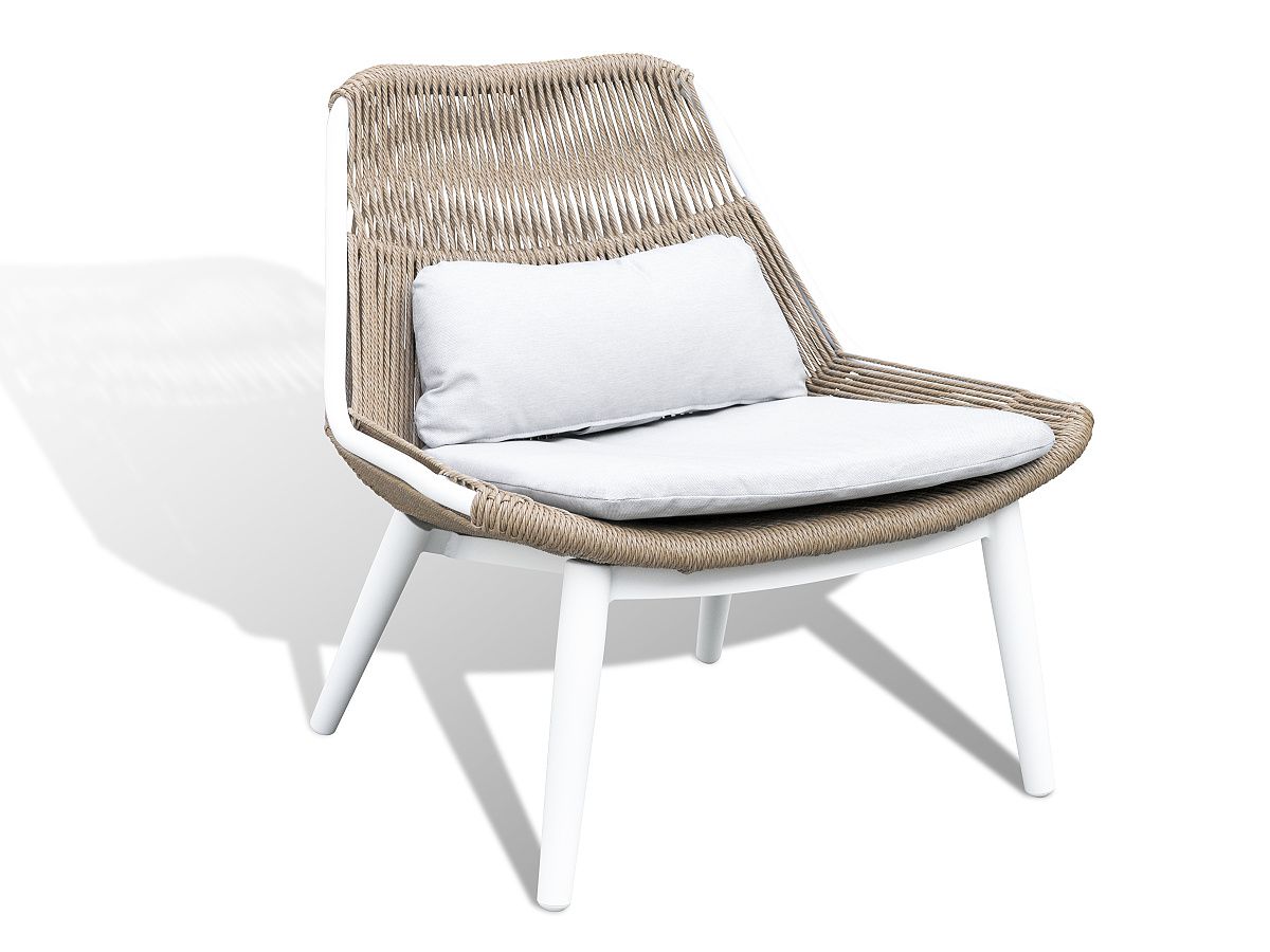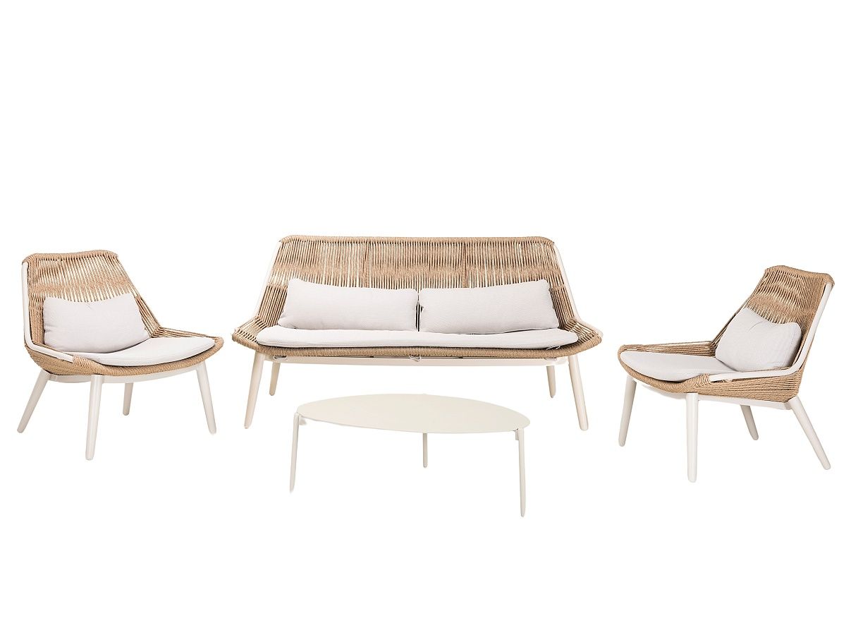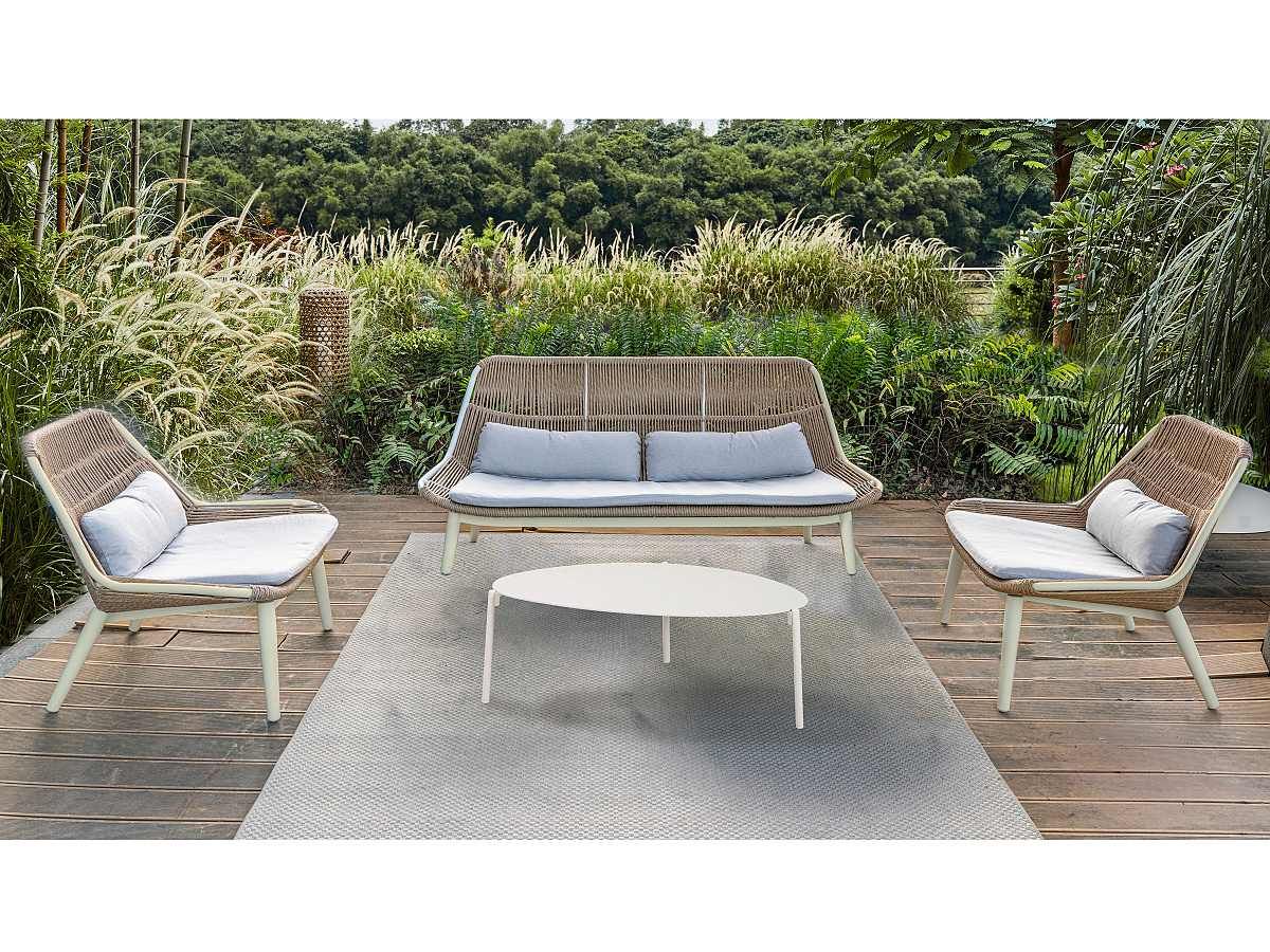 Úžasně pohodlná designová zahradní sedací souprava Como Lounge je ideálním společníkem na dlouhá letní posezení. Konstrukce sedací soupravy je hliníková a je stříkaná práškovou barvou v odstínu IVORY. Opěradla na křeslech a dvojsedačke jsou ovinutá tkaným syntetickým lanem v naturálním melírovaném vzhladu, která dodávají celému designu nádech modernismu. Podsedáky a opěrkové polštáře jsou světle šedé barvy a jsou odolné vůči povětrnostním vlivům. Konferenční stolek má konstrukci z hliníku stejné barvy a provedení jako křesla a dvojsedačka. Ve stejném designu máme i sedací soupravu Coconut a židle Como a Coconut, pokud byste si chtěli sladit sedací a stolovou soupravu.